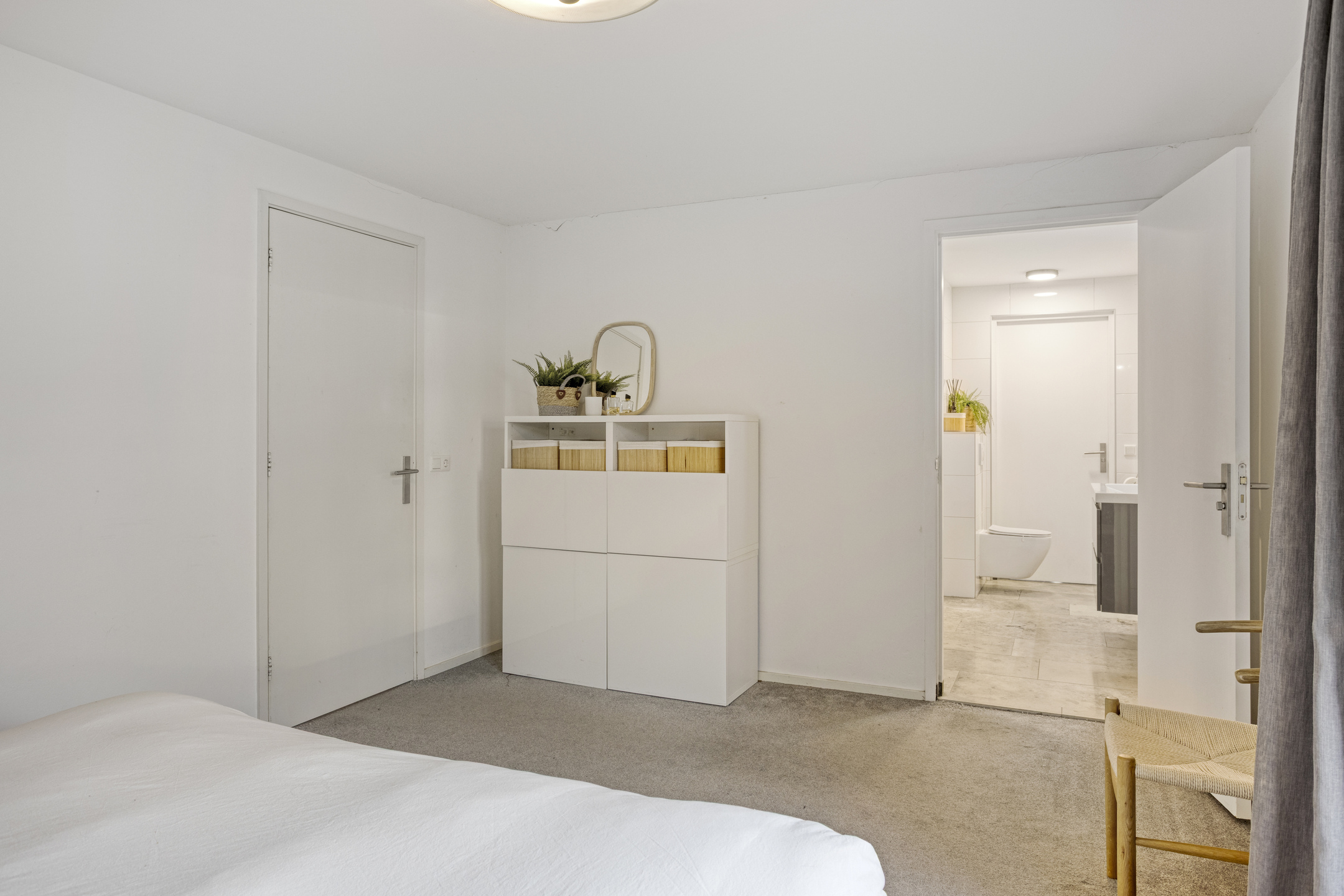 Eerste verdieping: bordes met toegang tot de vide die nu wordt gebruikt als atelier, de berging en de twee hele ruime kamers (30 m²). De berging is voorzien van een wastafel en daar zit tevens de CV-ketel. De ene kamer wordt nu gebruikt als slaapkamer en de ander als extra living. Dit kan uiteraard ook prima gebruikt worden als slaapkamer.