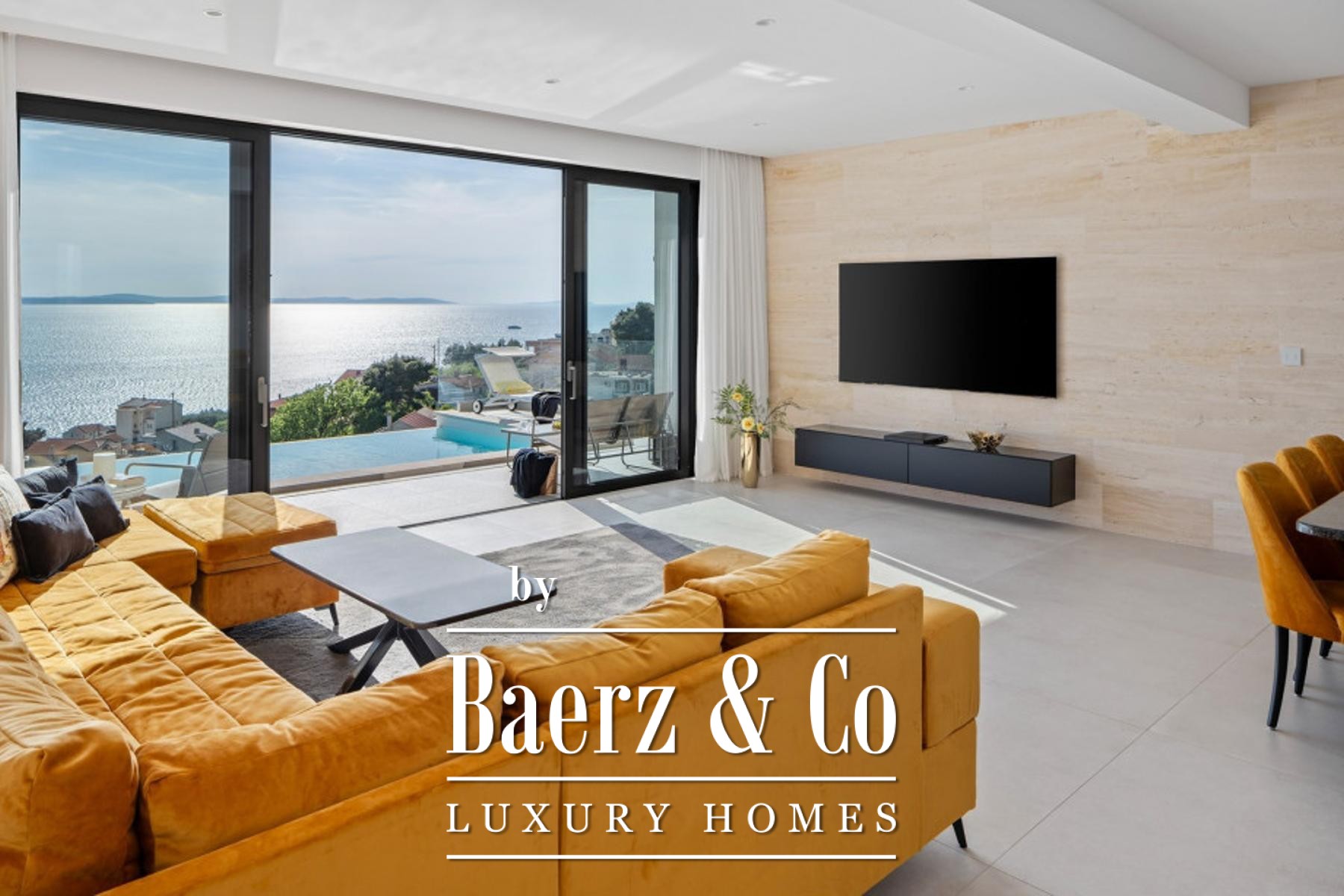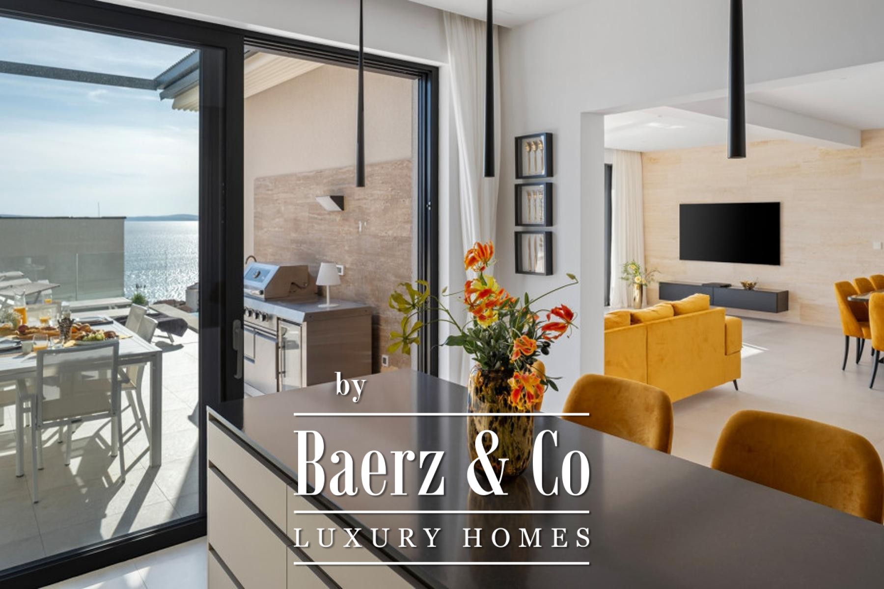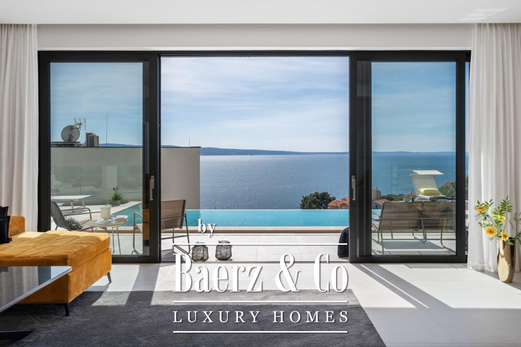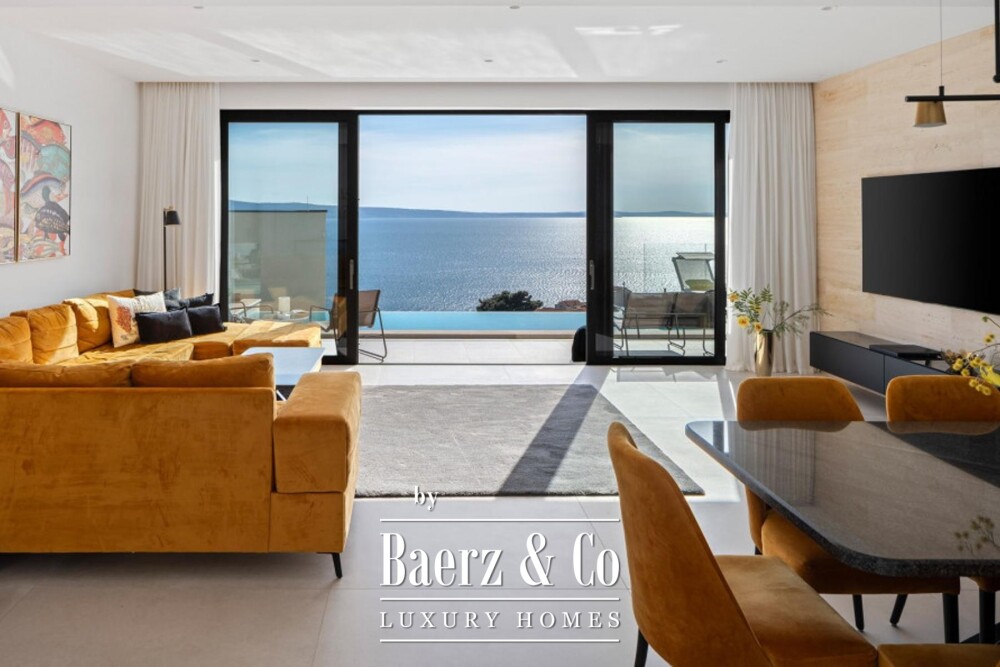 Semi-detached villa Dugi Rat invites a sense of refined ease, positioned to embrace expansive sea views from each of its three thoughtfully arranged floors. This 222 m² contemporary residence welcomes with an open living space, where the living room, dining area, and spacious kitchen flow seamlessly onto a broad terrace. Floor-to-ceiling sliding walls open to the Adriatic vista, drawing in the sense of light and serenity unique to this coastal setting.