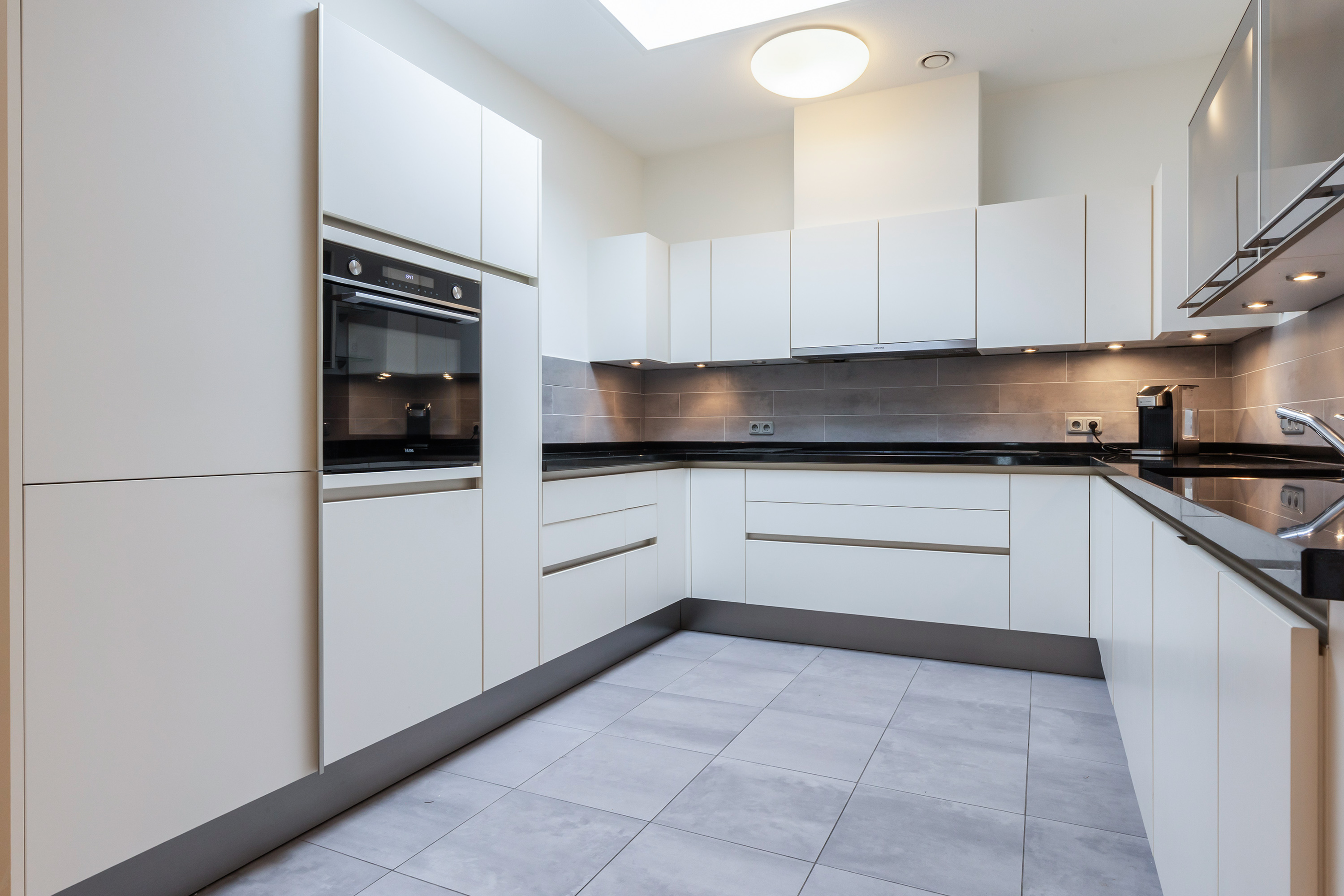 The open-plan kitchen is sleek and modern, featuring handleless high-gloss white cabinetry and a black granite worktop. The U-shaped design offers plenty of workspace and comes fully equipped with built-in appliances: a fridge-freezer, dishwasher, combi-oven, ceramic hob and extractor unit. A skylight in the ceiling provides additional daylight.