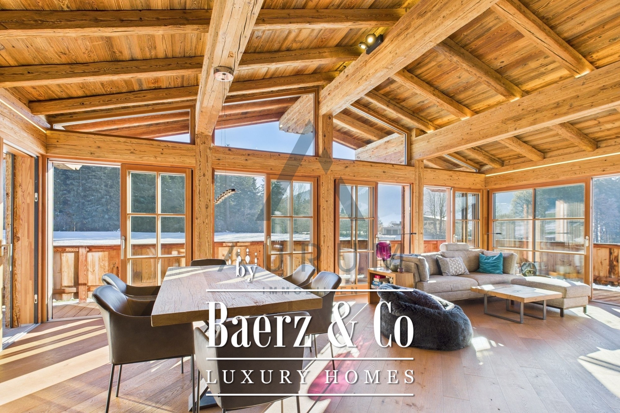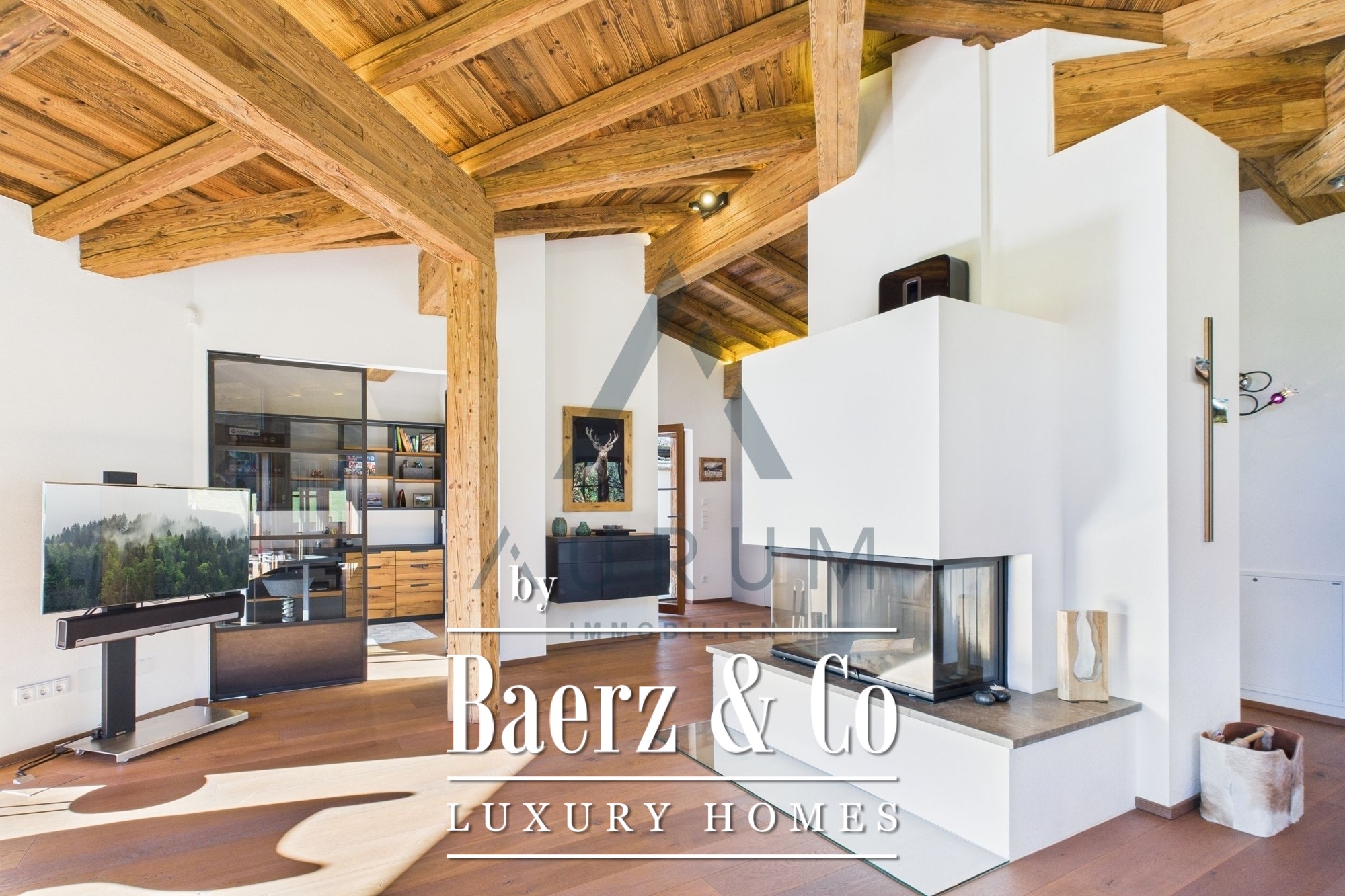 Within its 241 m² living area and 314 m² total usable space, four bedrooms and three bathrooms are complemented by two guest WCs, an office, and a wellness suite featuring a Klafs sauna with sanarium function. The open living, dining, and kitchen zone is underscored by exposed reclaimed wood roof trusses, an open fireplace, and seamless flow onto 172 m² of terraces and balconies. Finishes include oak flooring, electric blinds, and a fitted kitchen equipped with appliances from Gaggenau, Miele, and Bora.