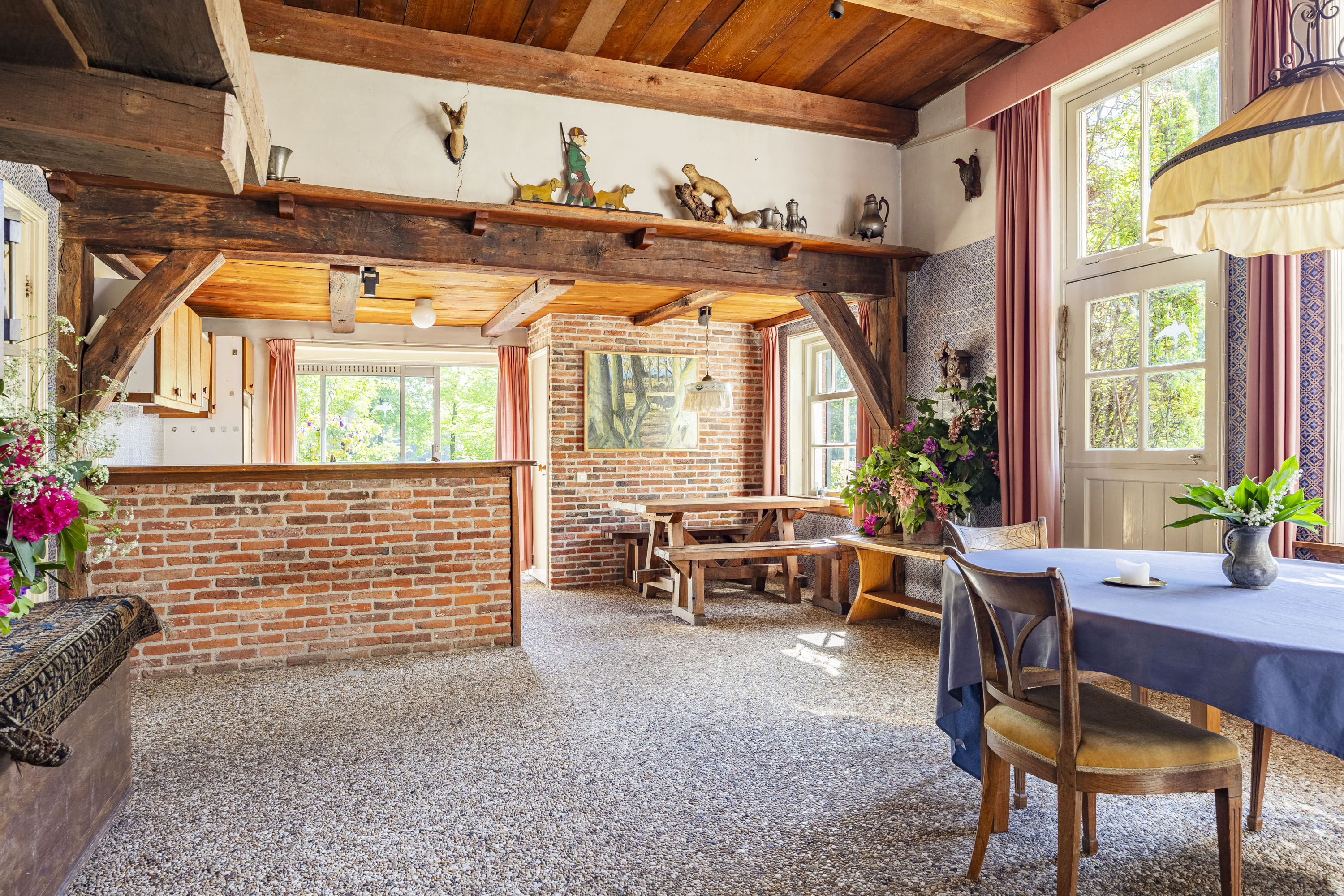 The back of the farmhouse remains structurally original, featuring beautiful wooden beams and a traditional stable door (the so called ‘niendeur’). Where cows once stood, there are now five horse stables, a tack room and additional facilities including an office, shower and laundry connections.