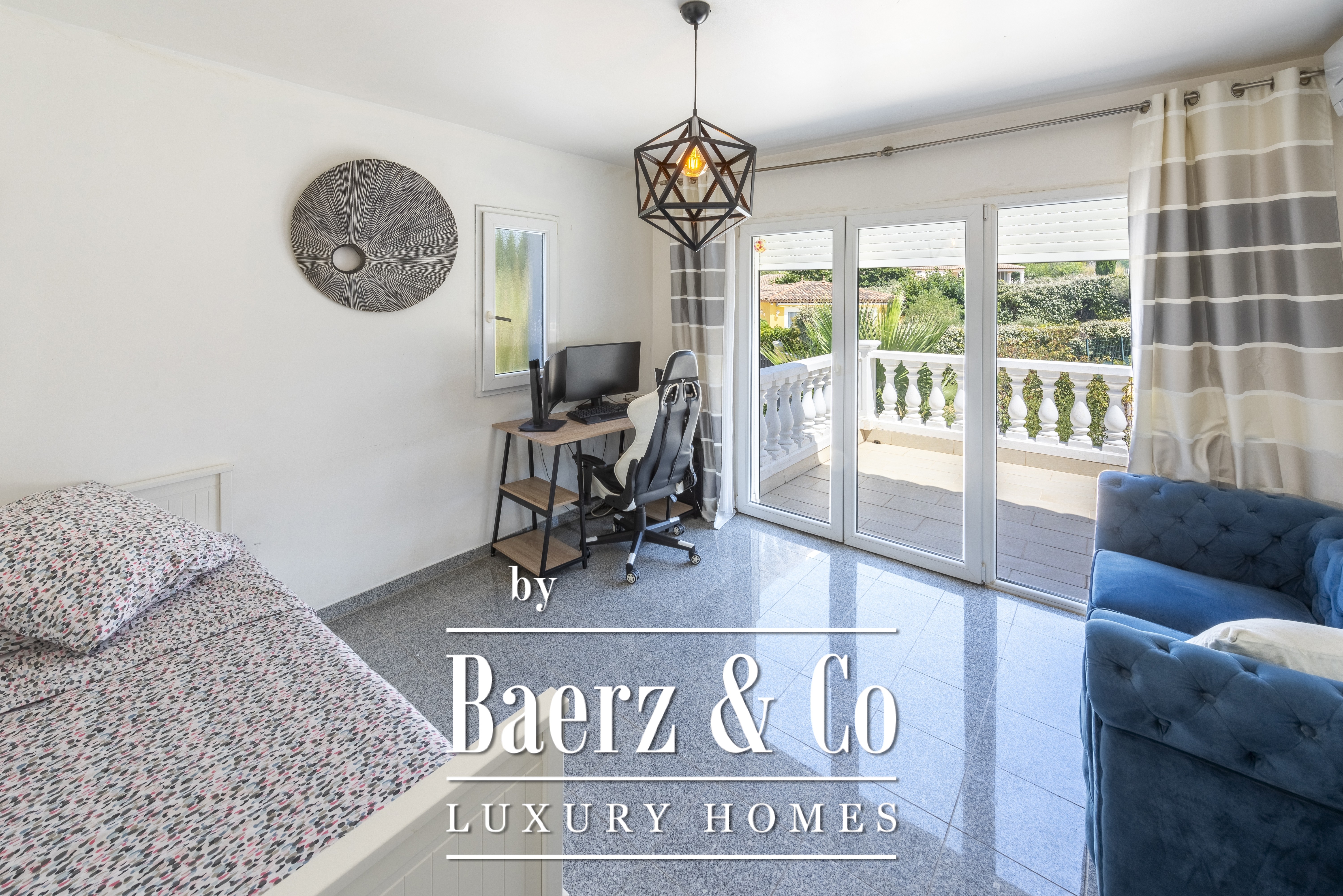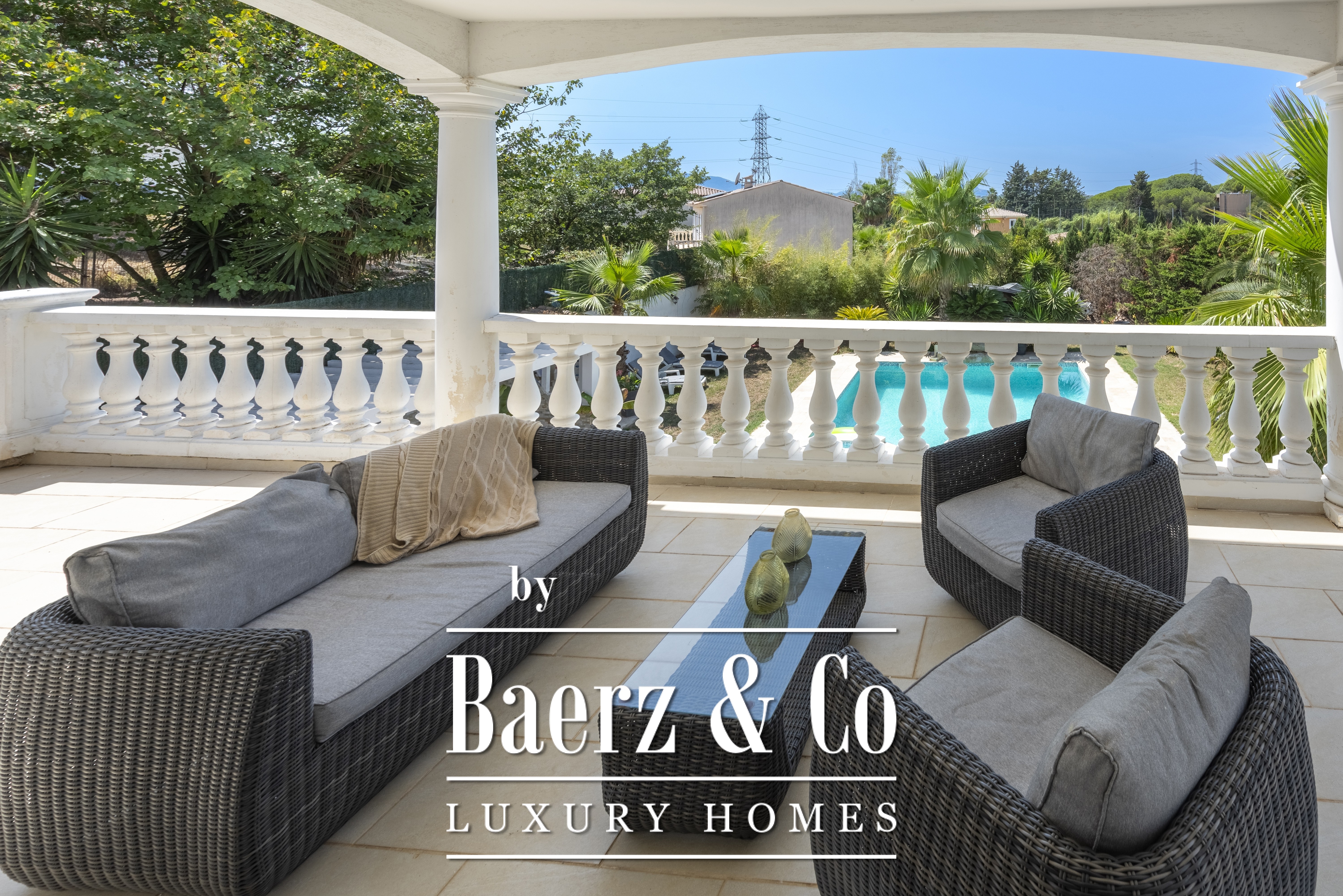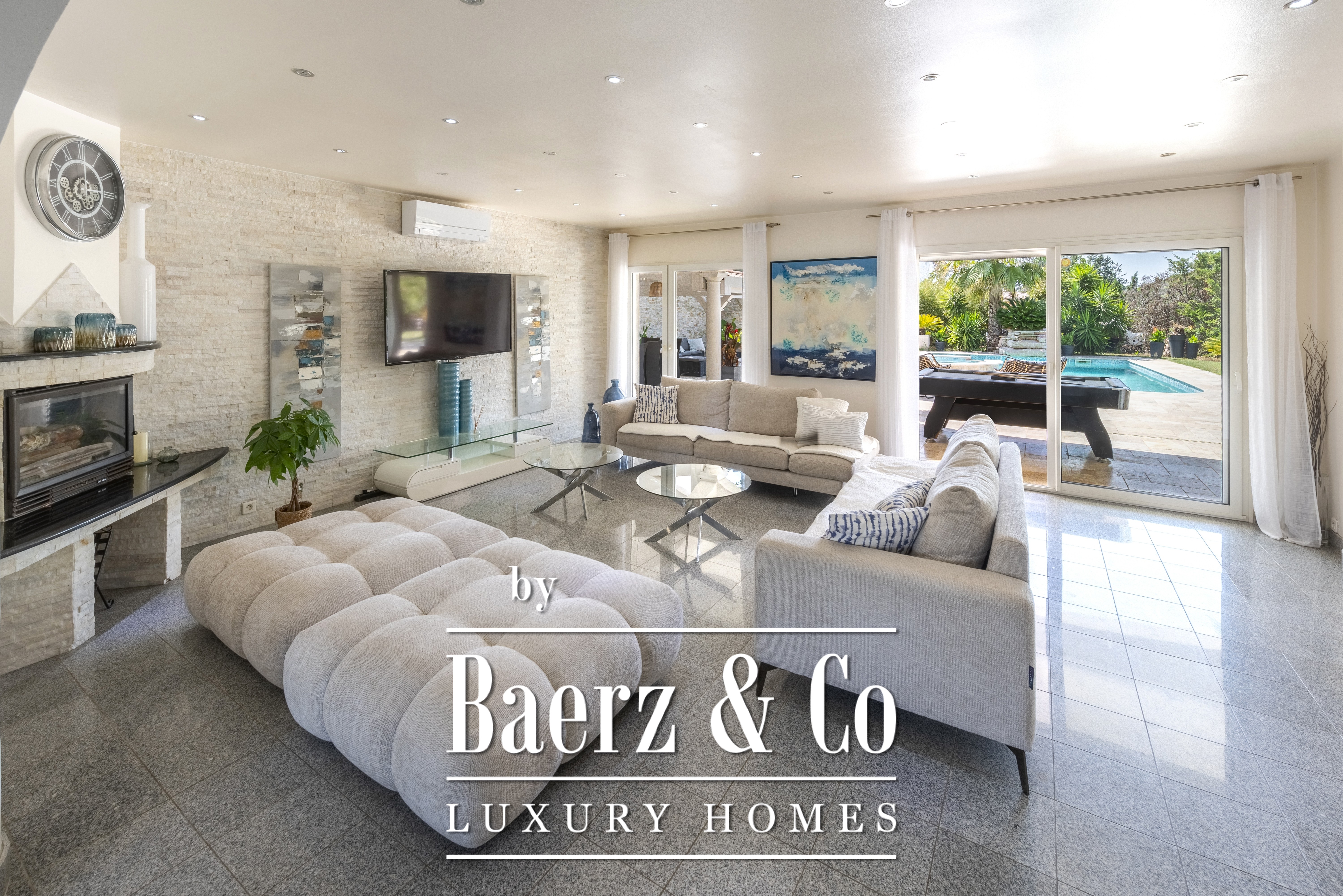 Villa Fréjus presents a 172 m² villa for sale, designed around spacious volumes and refined light, set within a private and secure estate. This property is positioned in a quiet residential environment, while offering immediate access to amenities including shops, schools and main roads. The villa Fréjus opens with a luminous living area and a fully equipped open-plan kitchen, structured for effortless hosting. Facing west, the space extends naturally onto an expansive terrace overlooking the pool and landscaped grounds. The sleeping quarters encompass four bedrooms, a large bathroom, a shower room and a functional laundry room. The setting reveals a 1,082 m² plot, arranged with both open and covered terraces, creating zones for summer dining, relaxation by the pool and a dedicated jacuzzi. Granite tile flooring, underfloor heating, reversible air conditioning and electric roller shutters highlight attention to quality and comfort. The villa offers both a garage and ample indoor and outdoor parking, supporting a lifestyle of privacy and ease. The energy class B rating reflects balanced modern efficiency.