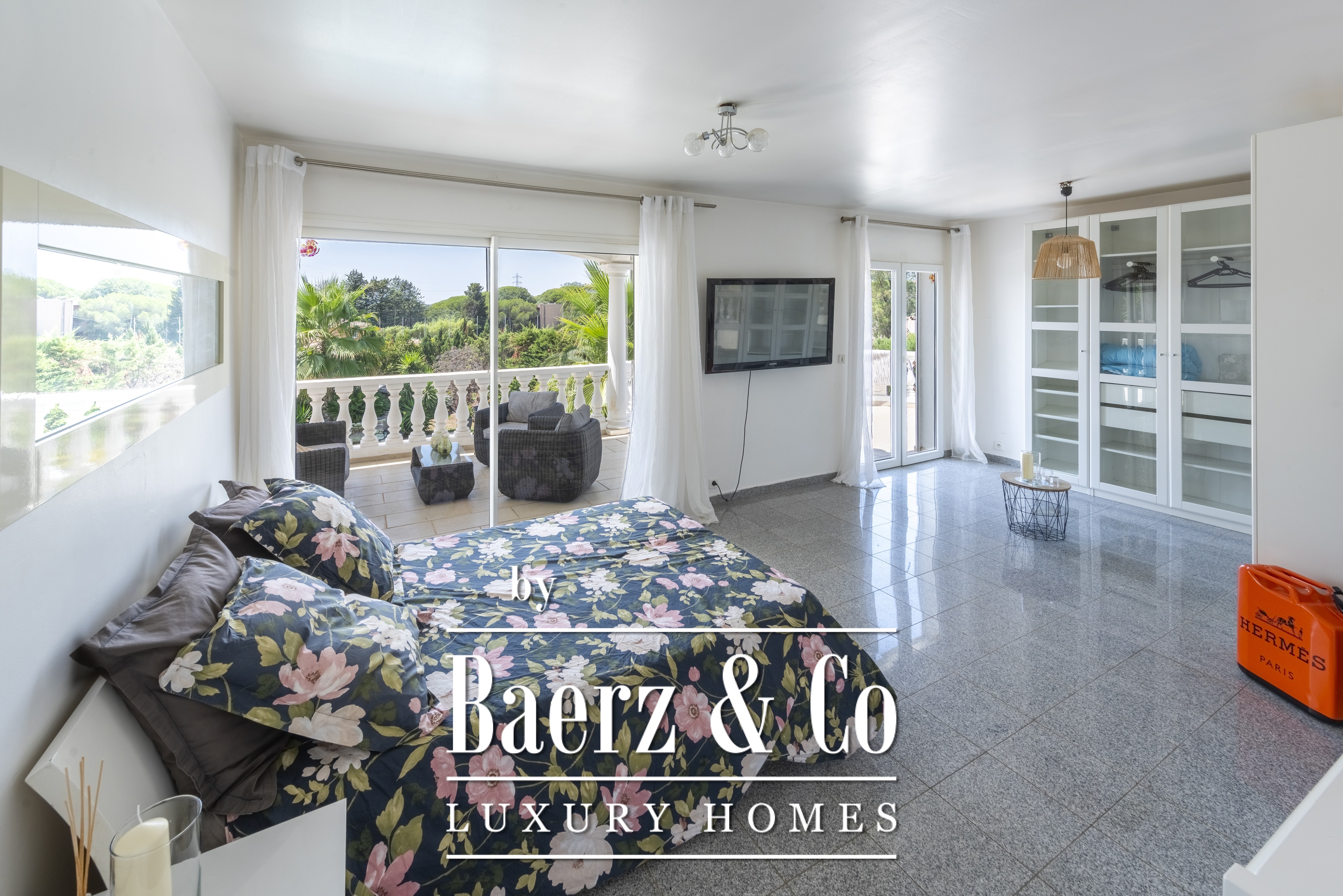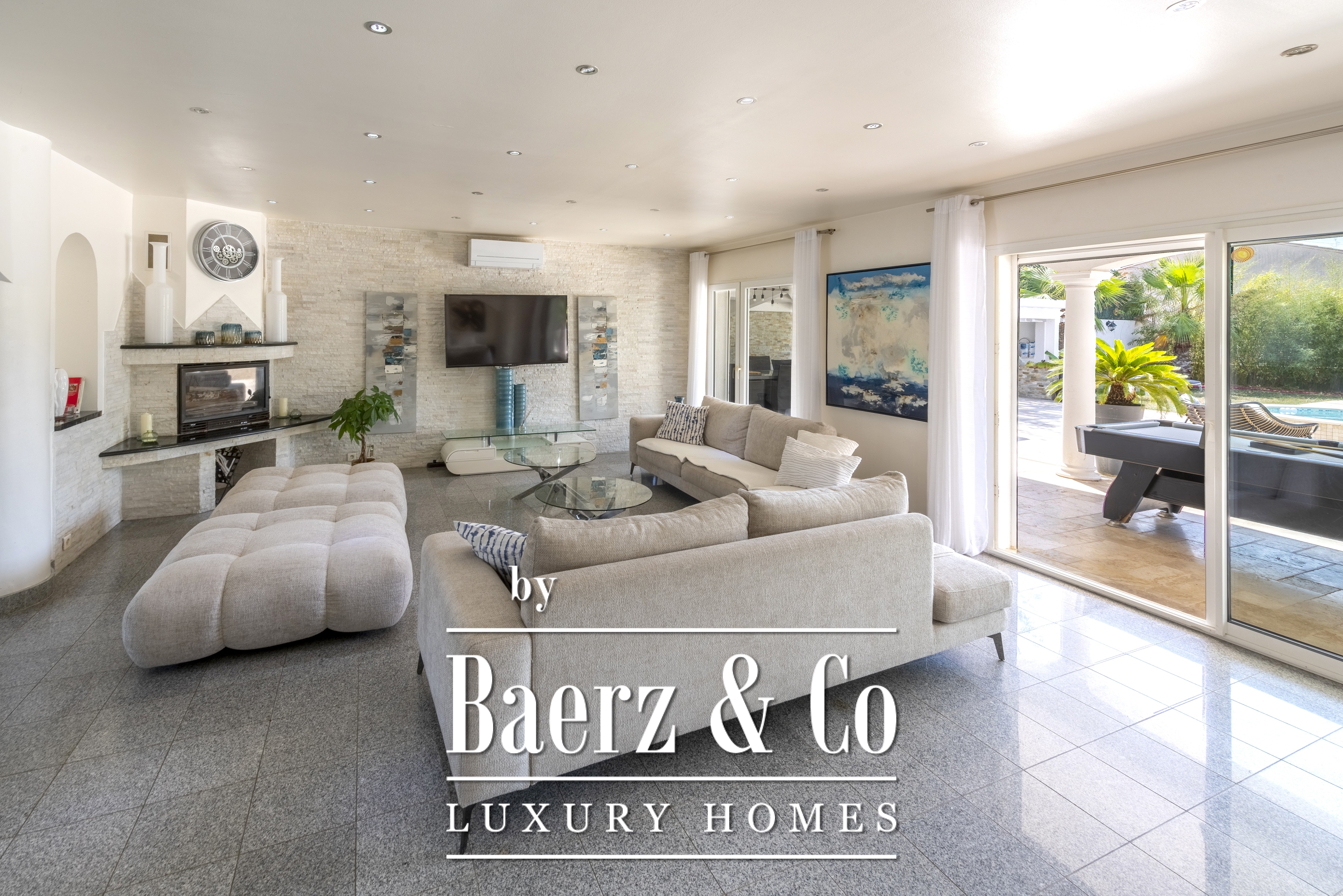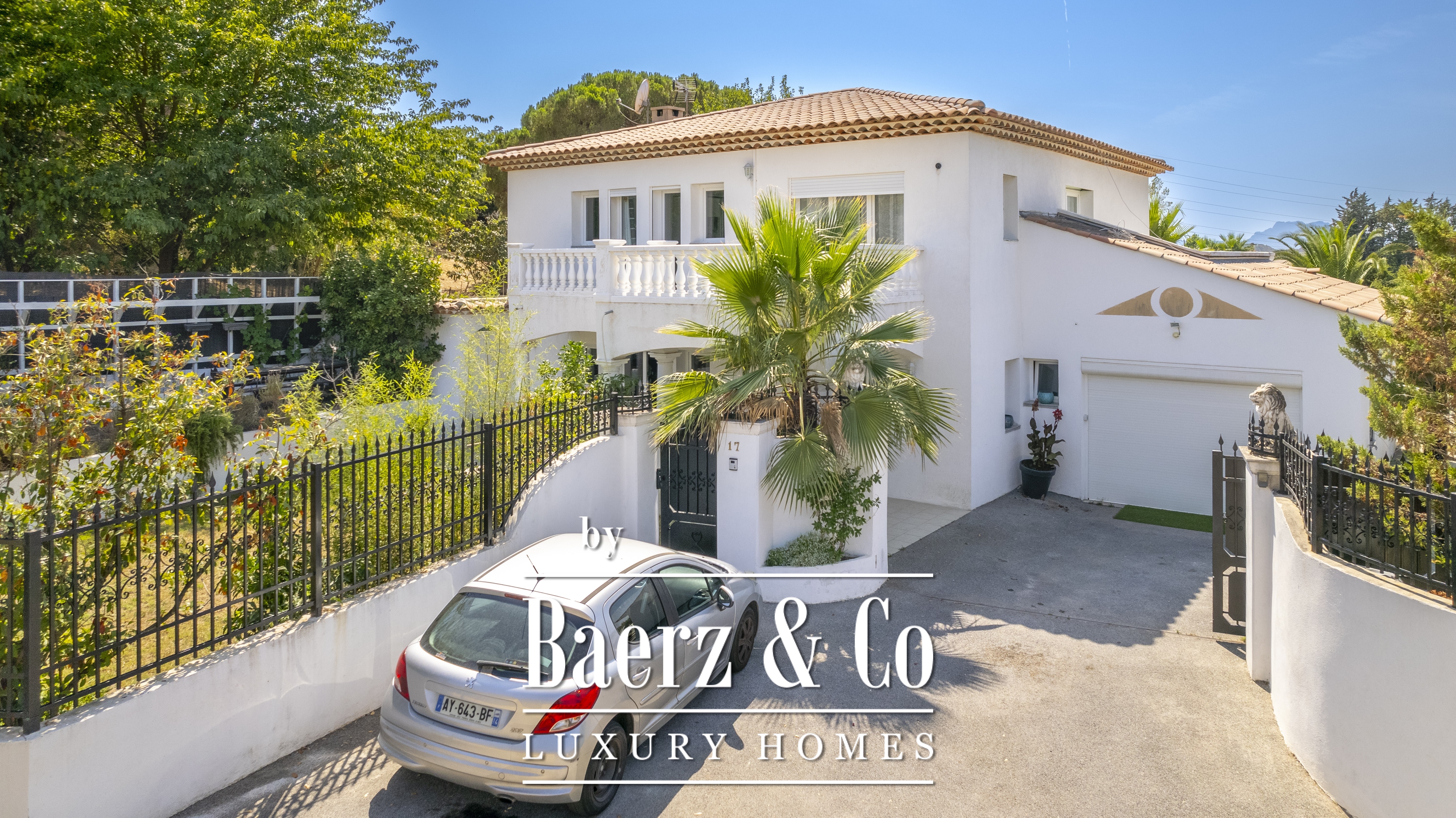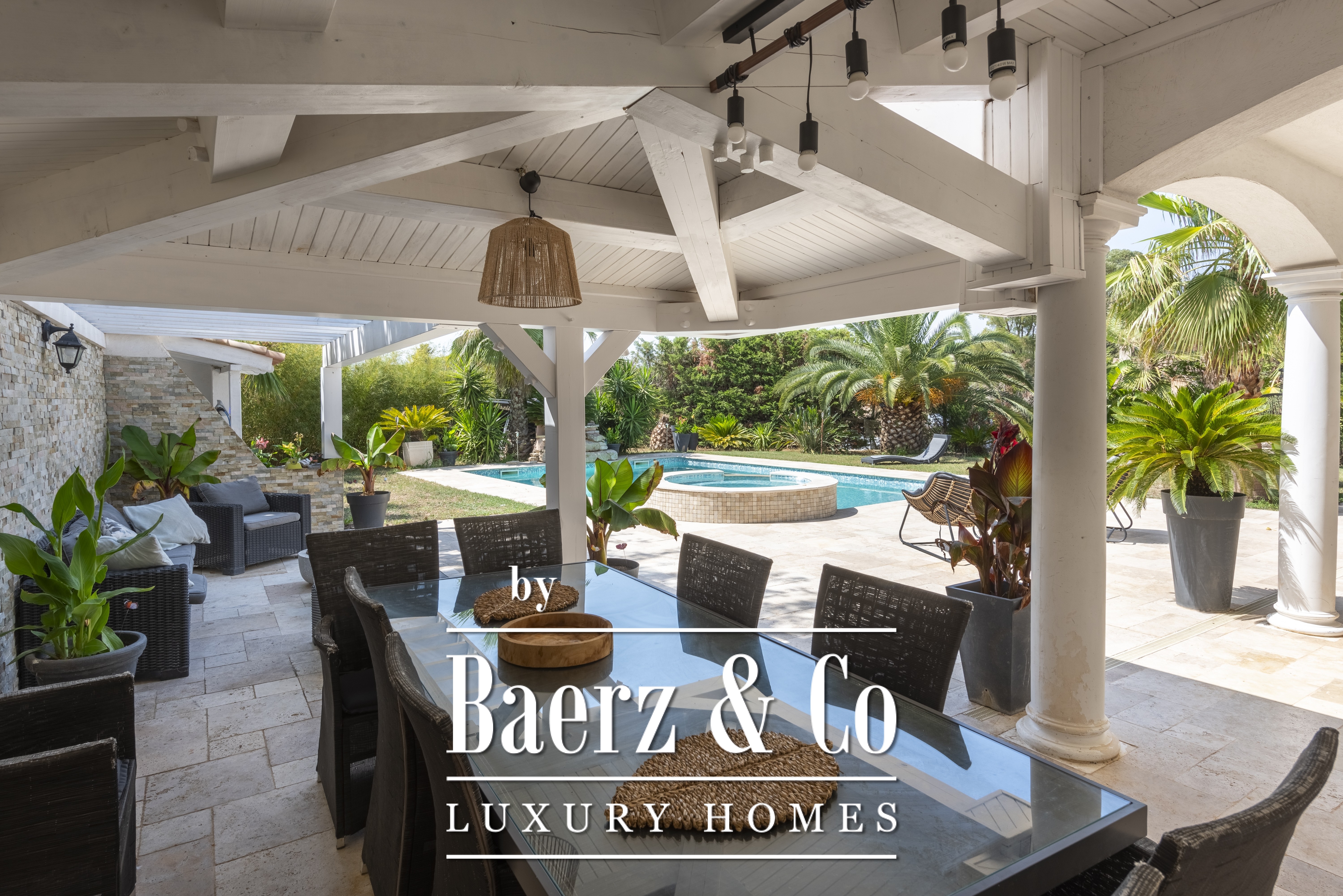Villa Fréjus presents a 172 m² villa for sale, designed around spacious volumes and refined light, set within a private and secure estate. This property is positioned in a quiet residential environment, while offering immediate access to amenities including shops, schools and main roads. The villa Fréjus opens with a luminous living area and a fully equipped open-plan kitchen, structured for effortless hosting. Facing west, the space extends naturally onto an expansive terrace overlooking the pool and landscaped grounds. The sleeping quarters encompass four bedrooms, a large bathroom, a shower room and a functional laundry room. The setting reveals a 1,082 m² plot, arranged with both open and covered terraces, creating zones for summer dining, relaxation by the pool and a dedicated jacuzzi. Granite tile flooring, underfloor heating, reversible air conditioning and electric roller shutters highlight attention to quality and comfort. The villa offers both a garage and ample indoor and outdoor parking, supporting a lifestyle of privacy and ease. The energy class B rating reflects balanced modern efficiency.