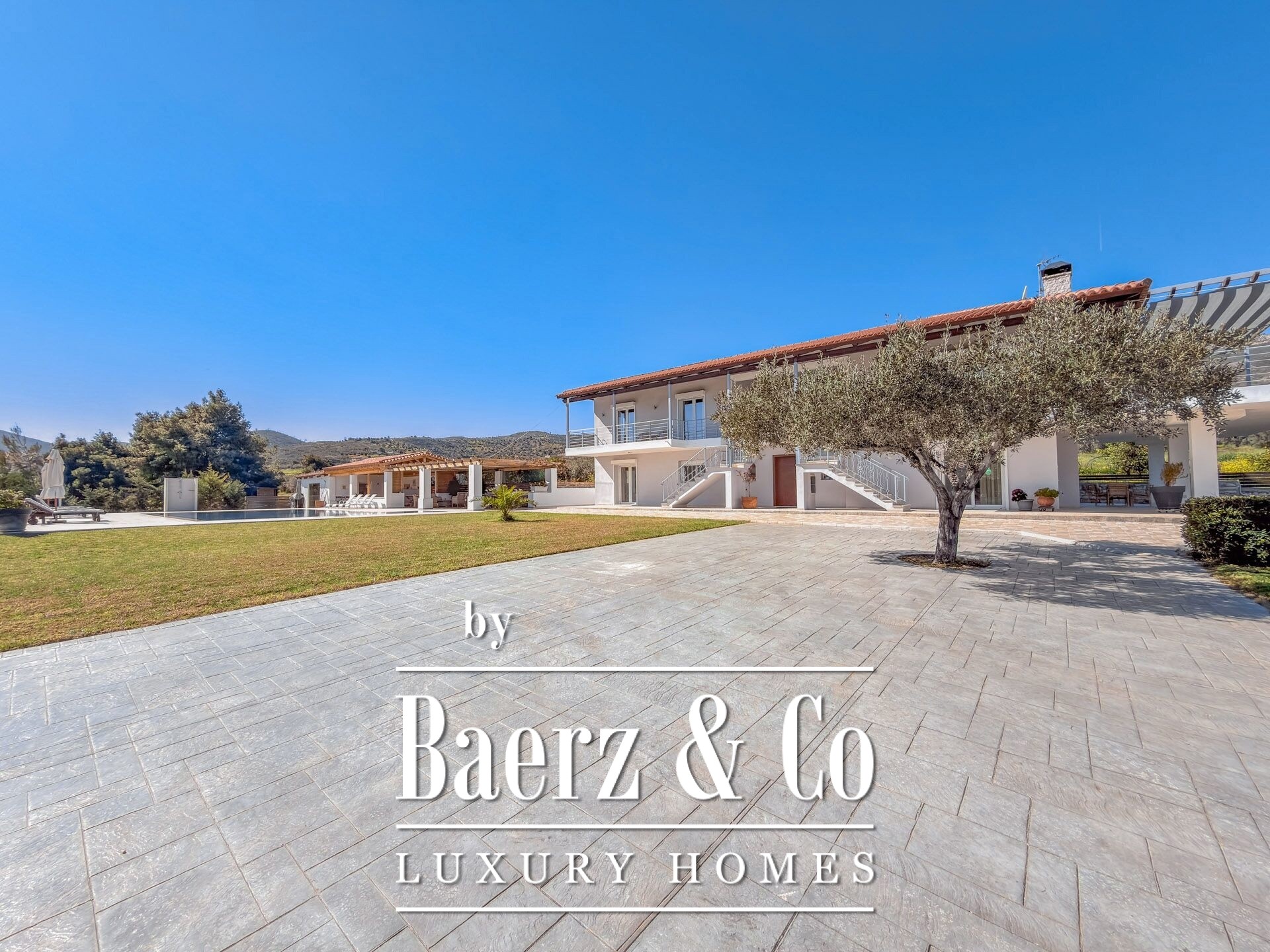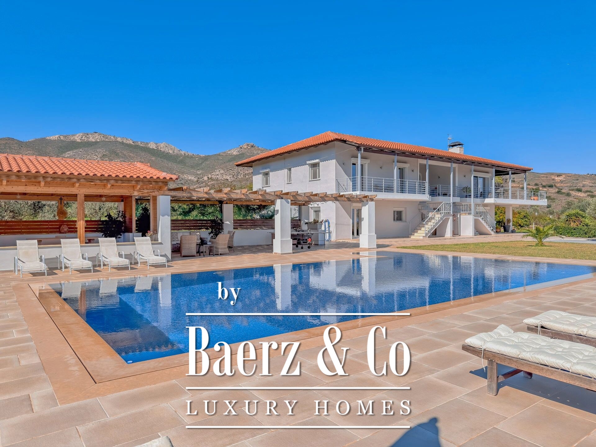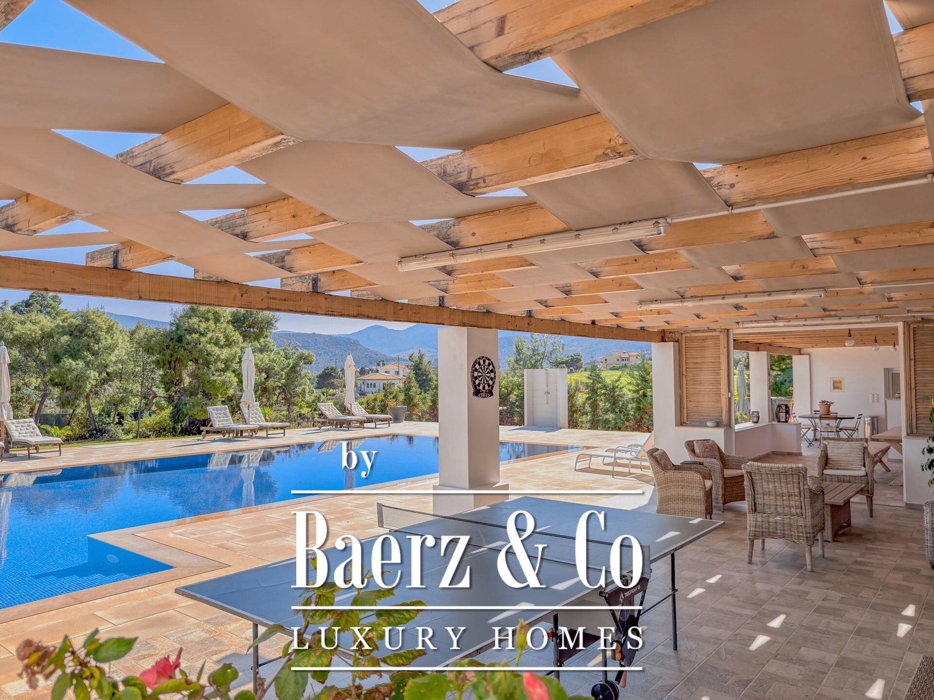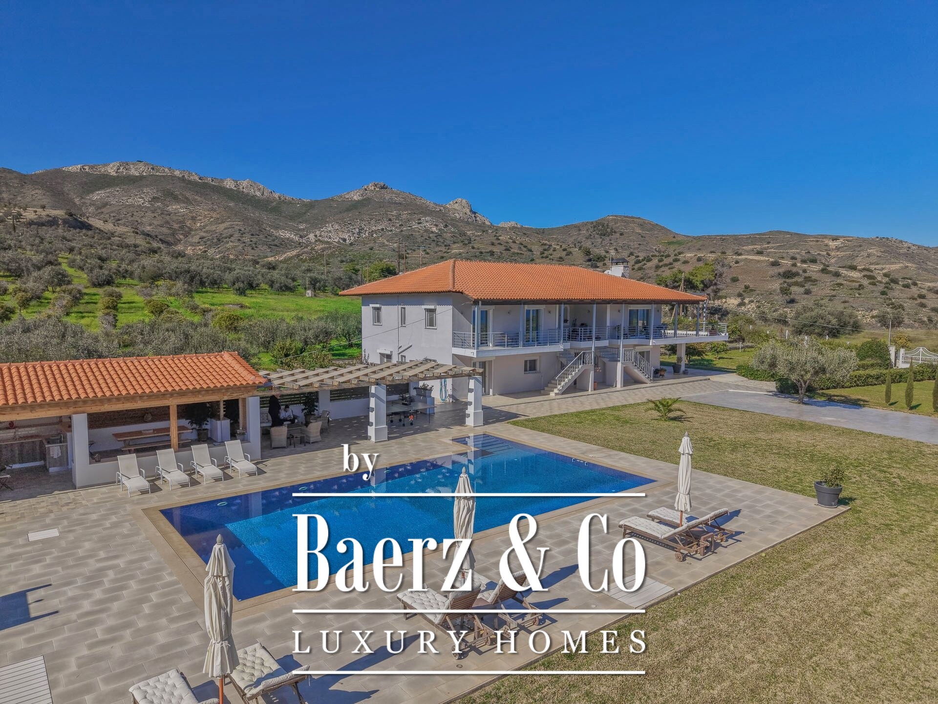 This residence distinguishes itself through energy autonomy, powered by 18KW photovoltaic panels and supported by a heat pump, solar water heating, and electric vehicle charging. The grounds, with pine, olive, and fruit trees, evoke the Mediterranean setting and offer scope for olive oil production. Located 1,500 meters from the beach and local amenities, the property combines tranquility with convenience, while advanced security features including CCTV, alarm, and cameras offer peace of mind. Luxury villa Galataki redefines the experience of owning a home in Greece, where understated luxury and advanced infrastructure meet.