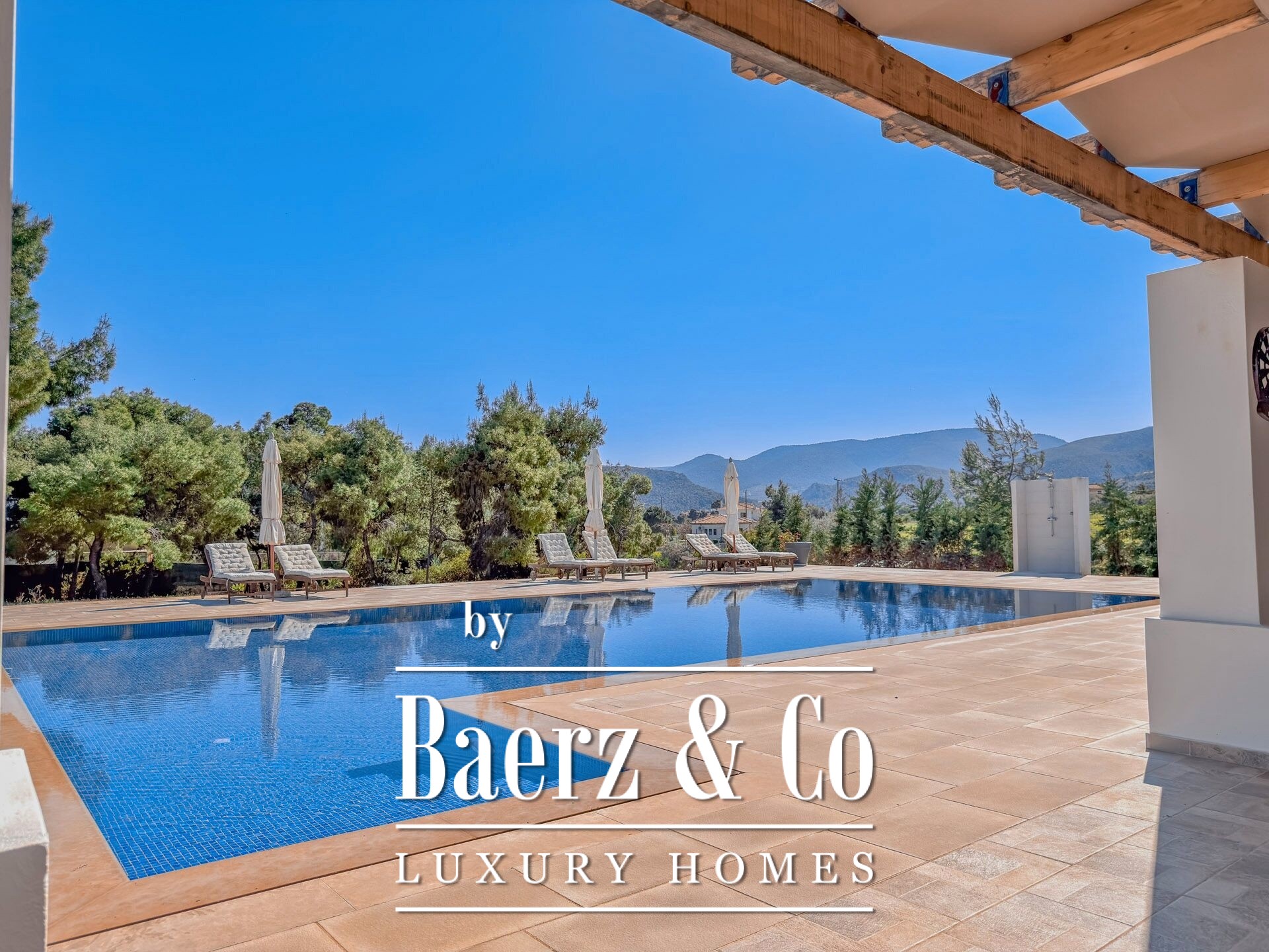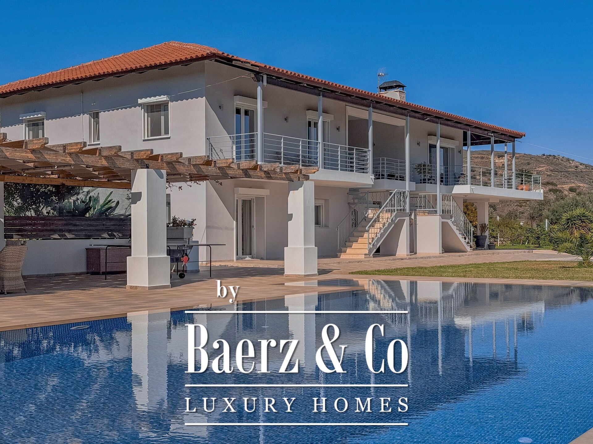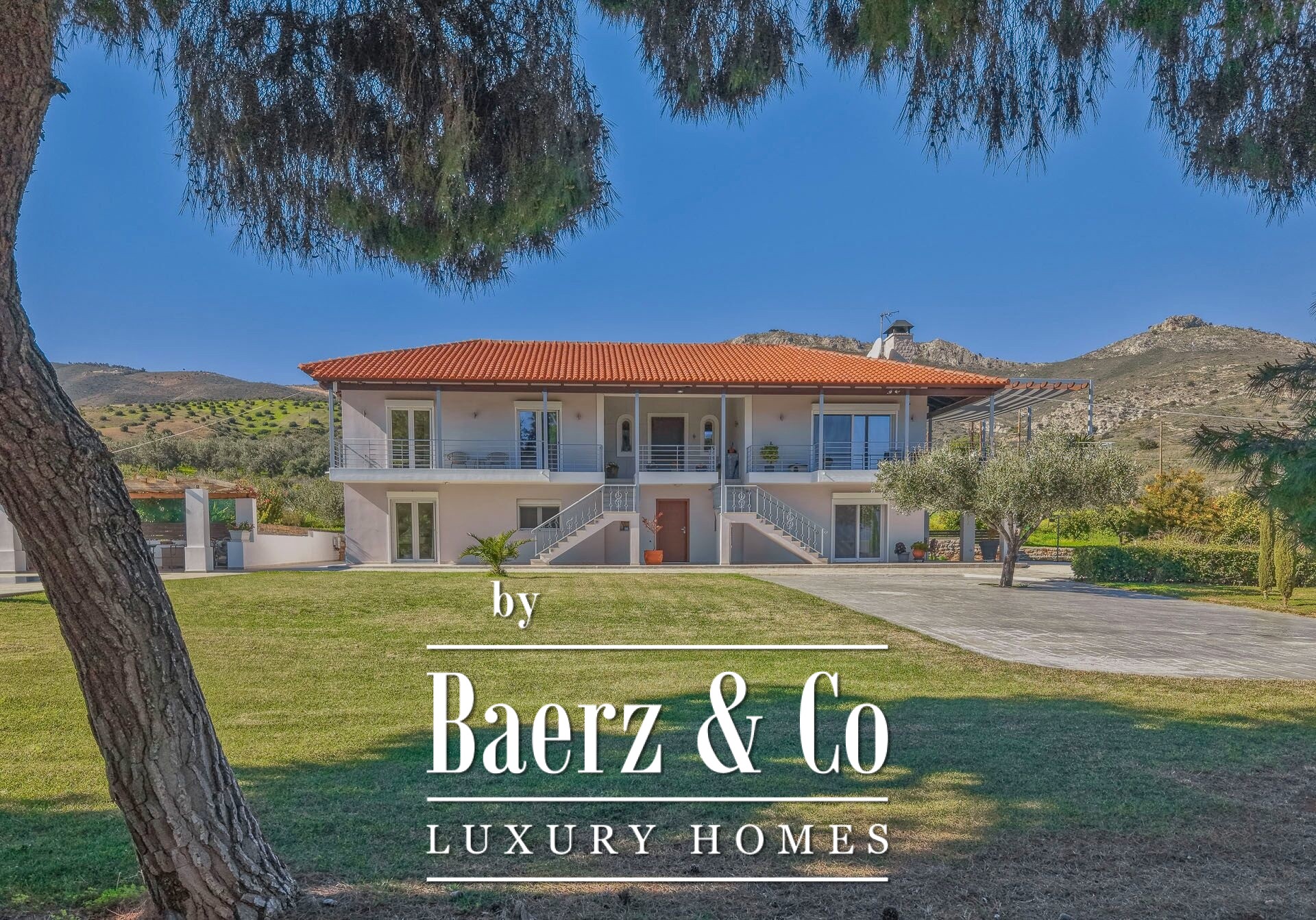 This residence distinguishes itself through energy autonomy, powered by 18KW photovoltaic panels and supported by a heat pump, solar water heating, and electric vehicle charging. The grounds, with pine, olive, and fruit trees, evoke the Mediterranean setting and offer scope for olive oil production. Located 1,500 meters from the beach and local amenities, the property combines tranquility with convenience, while advanced security features including CCTV, alarm, and cameras offer peace of mind. Luxury villa Galataki redefines the experience of owning a home in Greece, where understated luxury and advanced infrastructure meet.