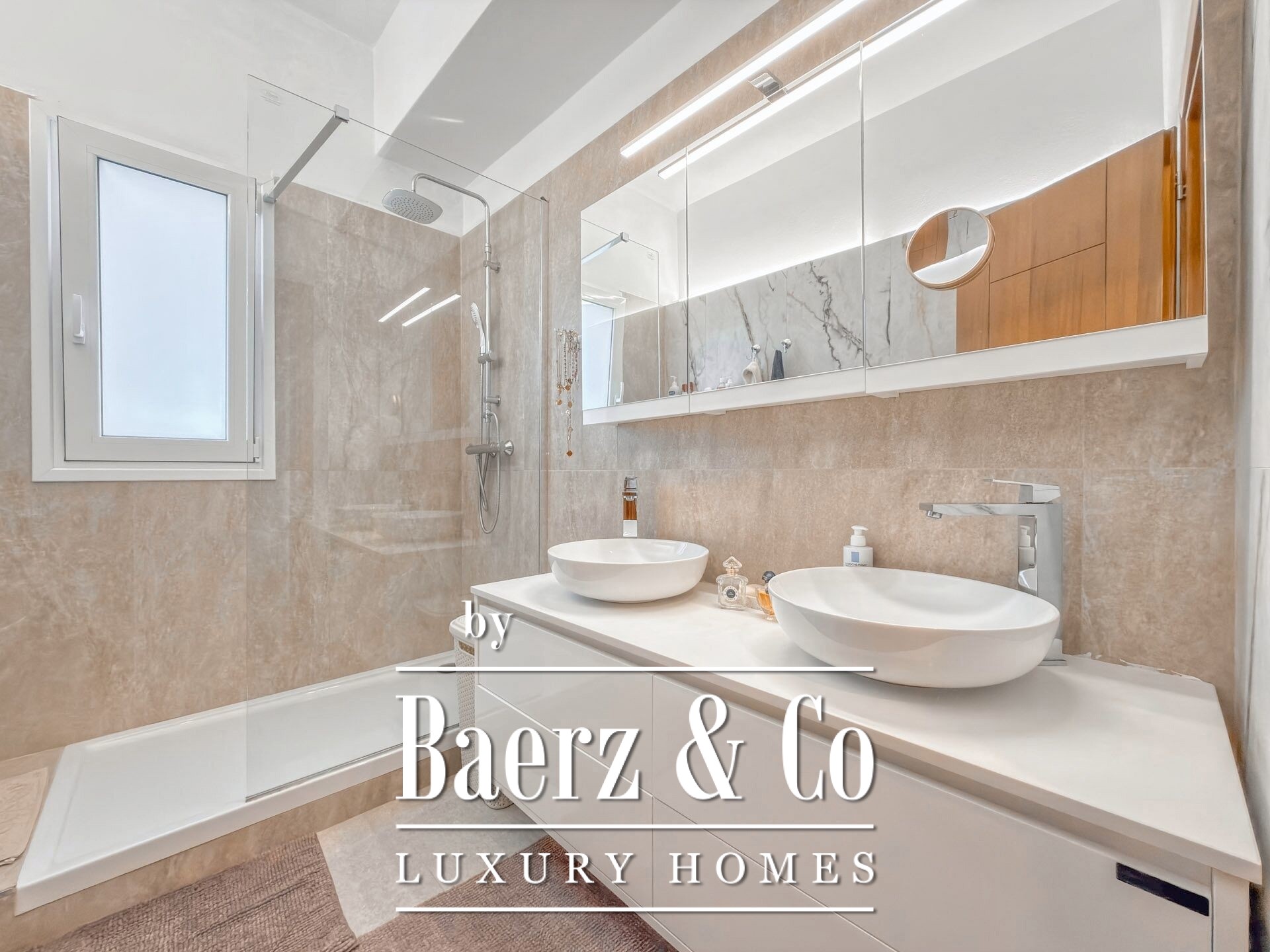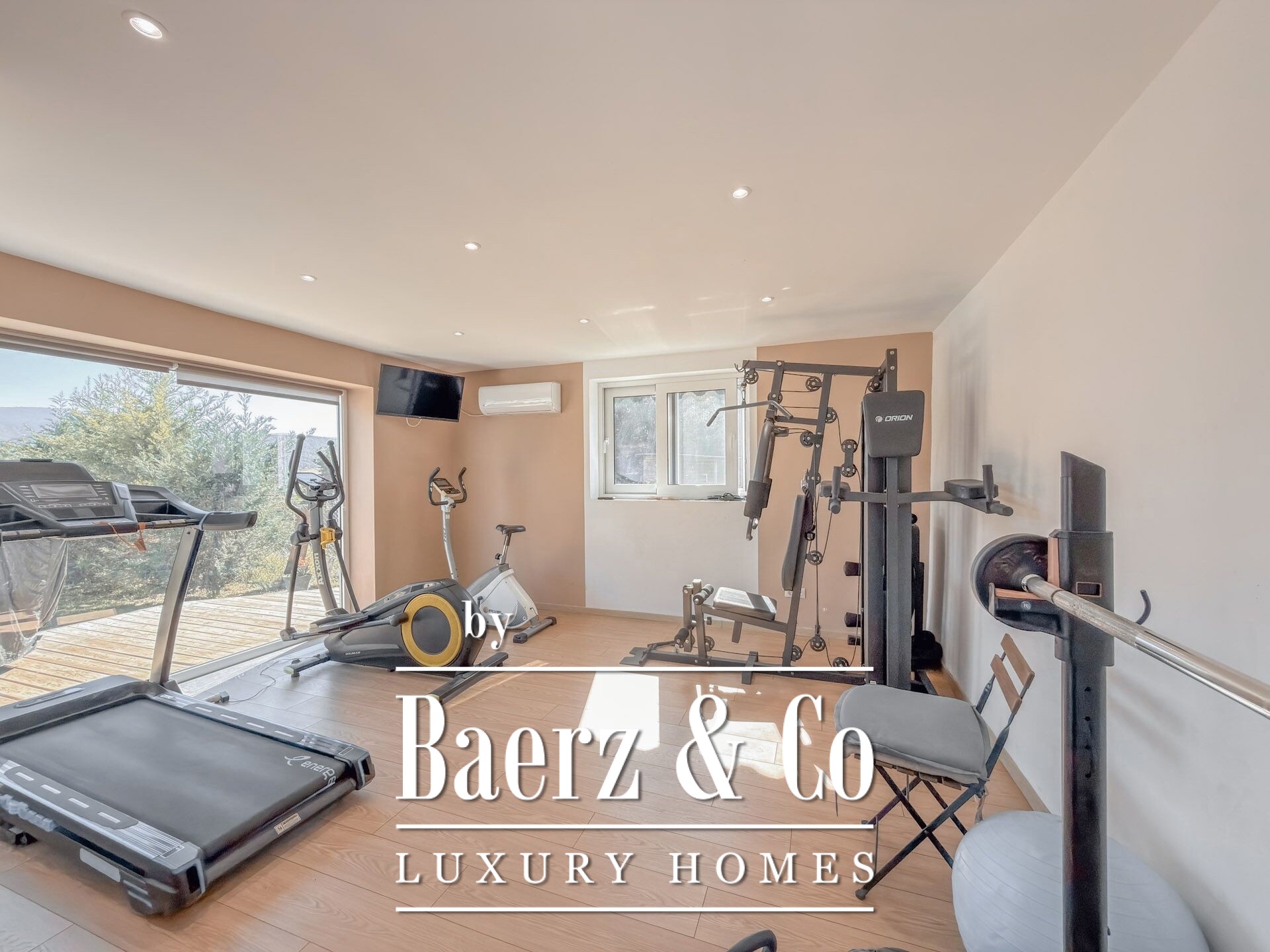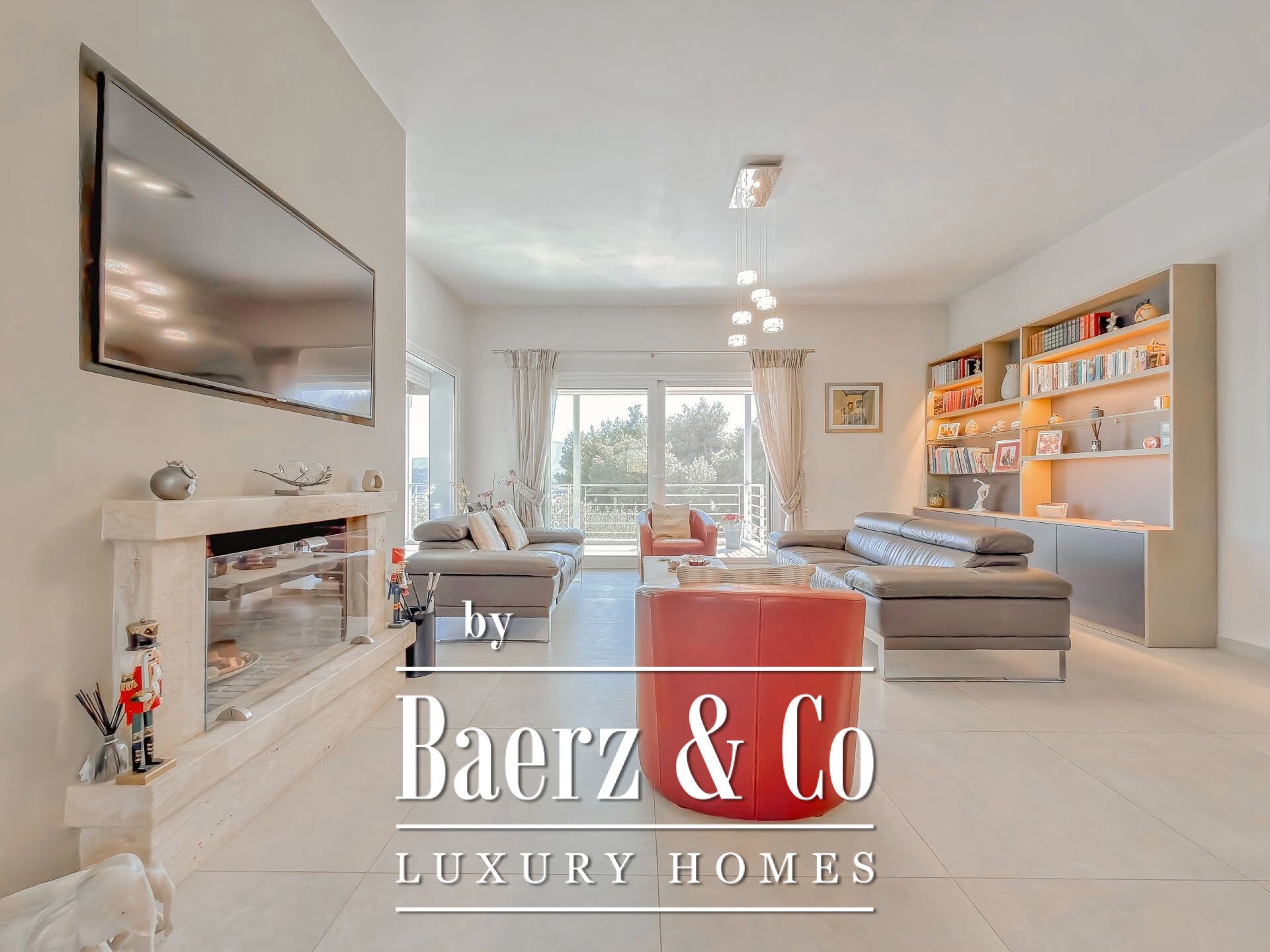 The villa presents eight rooms, five bathrooms, and dual full kitchens, each level anchored by its own living room and fireplace. Crafted for comfort and functionality, the ground floor comes fully furnished, while the first floor is partially furnished and features expansive balconies for immersive sea and mountain vistas. Outdoor living is elevated by a 78 m² swimming pool, a covered BBQ and outdoor kitchen, spaces for wellness, and ample secure parking.