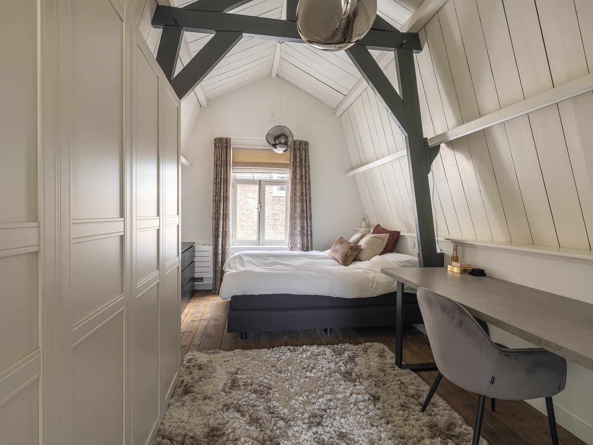 Bedroom with pine flooring and smooth plastered walls. The beautiful original roof structure is fully visible in this room as well.
