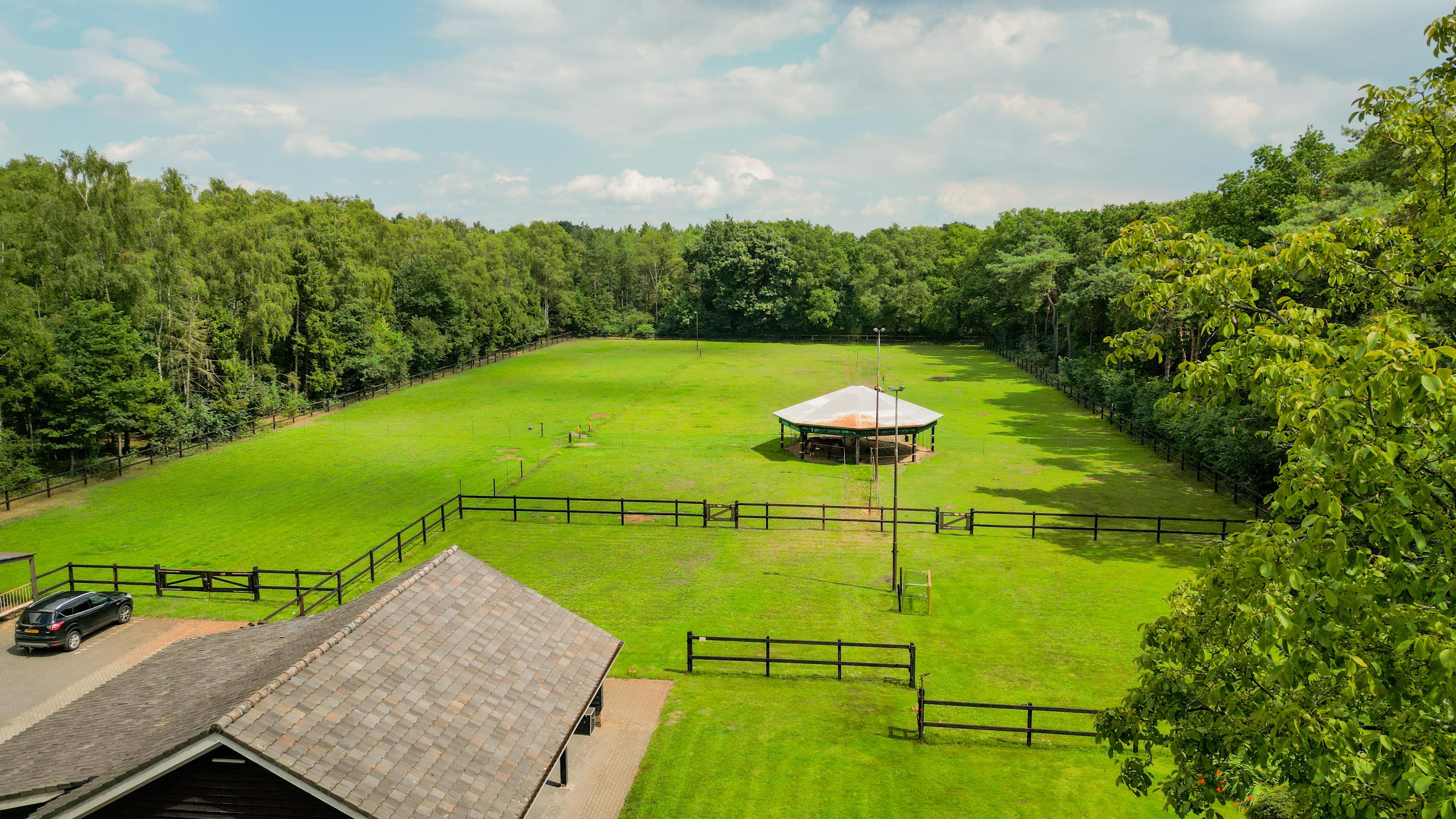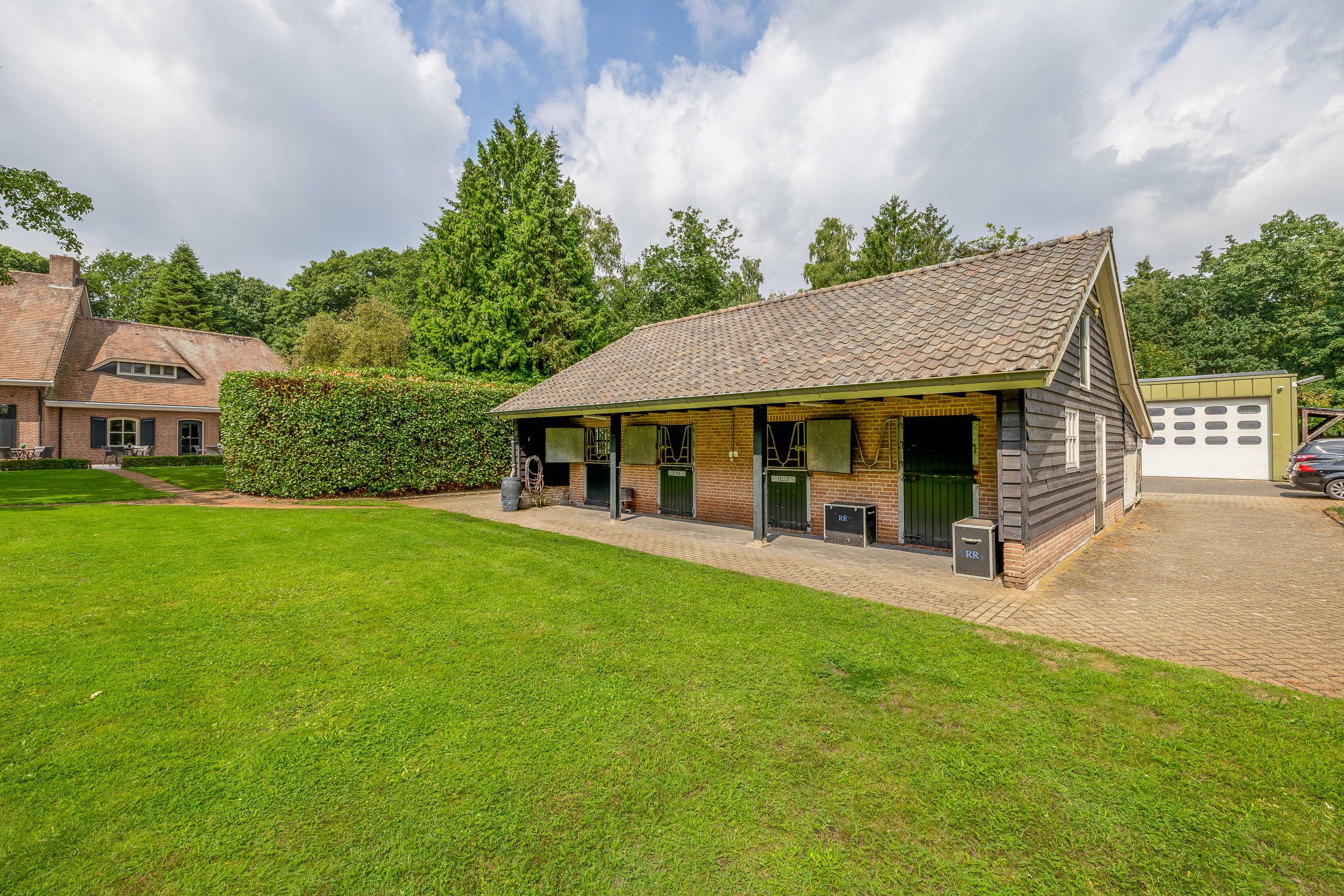 The detached horse stable has five stalls with outdoor hatches and weave racks, a hayloft, pasture access and additional facilities such as a shelter and a drained outdoor arena (20 x 40 metres) with professional flooring. Everything has been taken care of down to the last detail, including lighting, sprinklers and fencing.