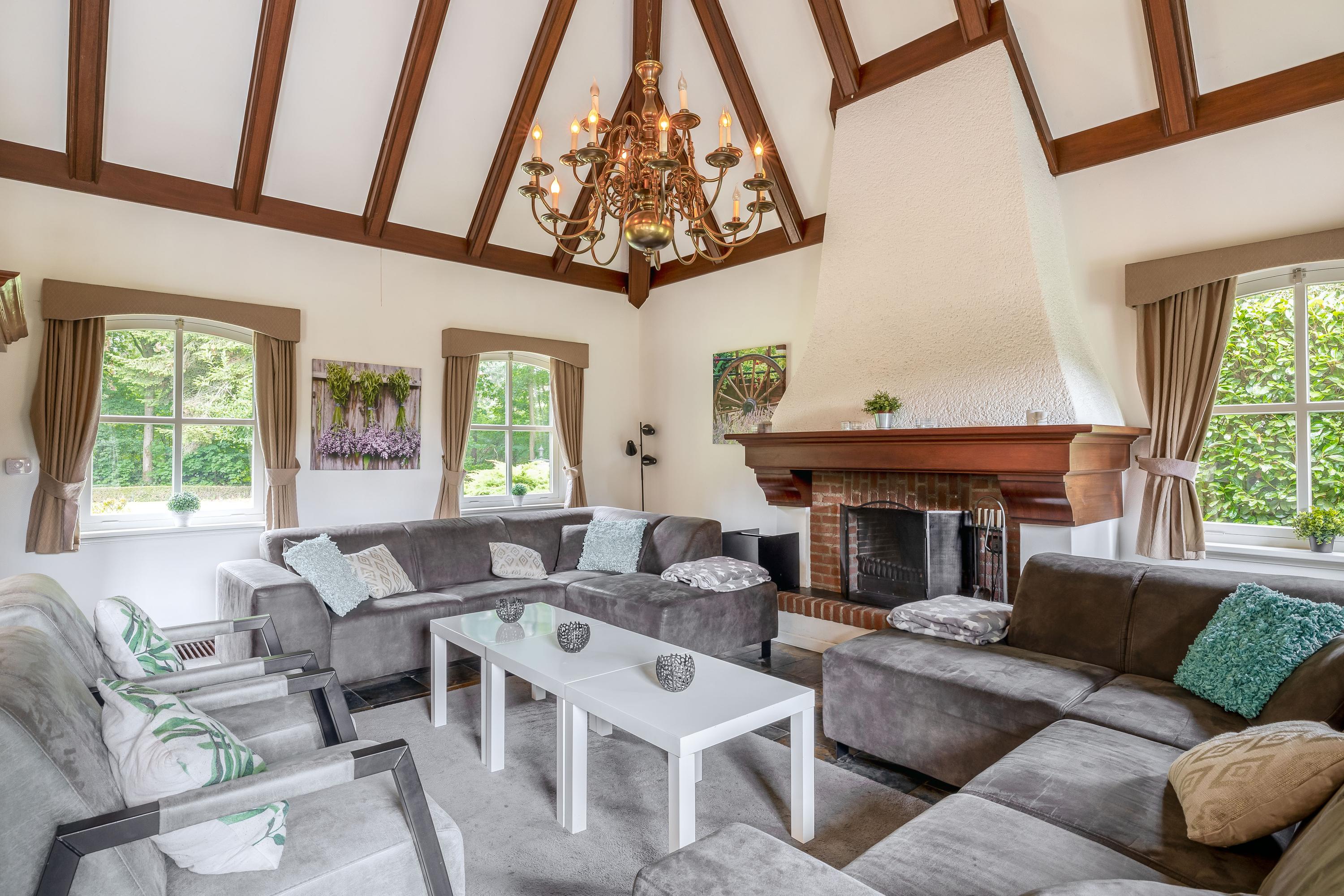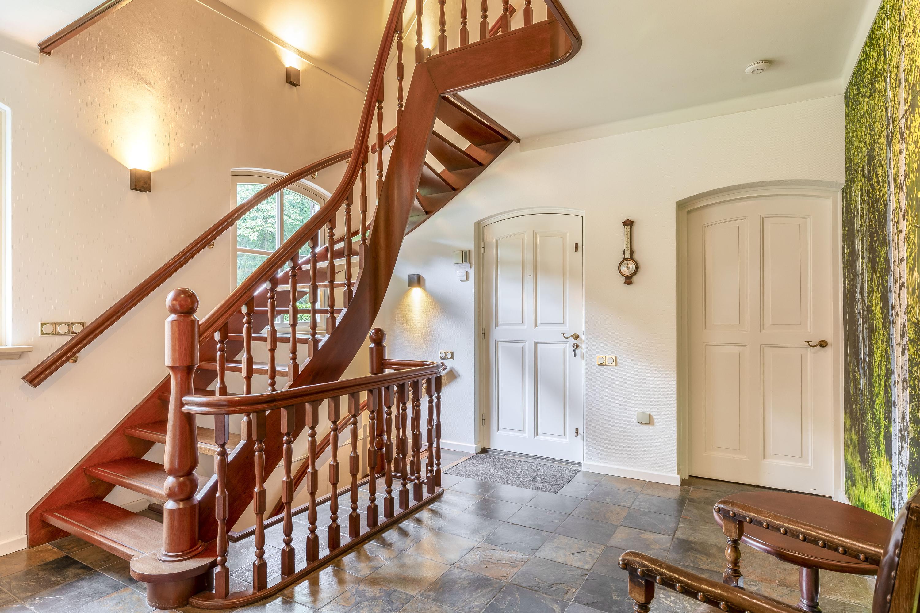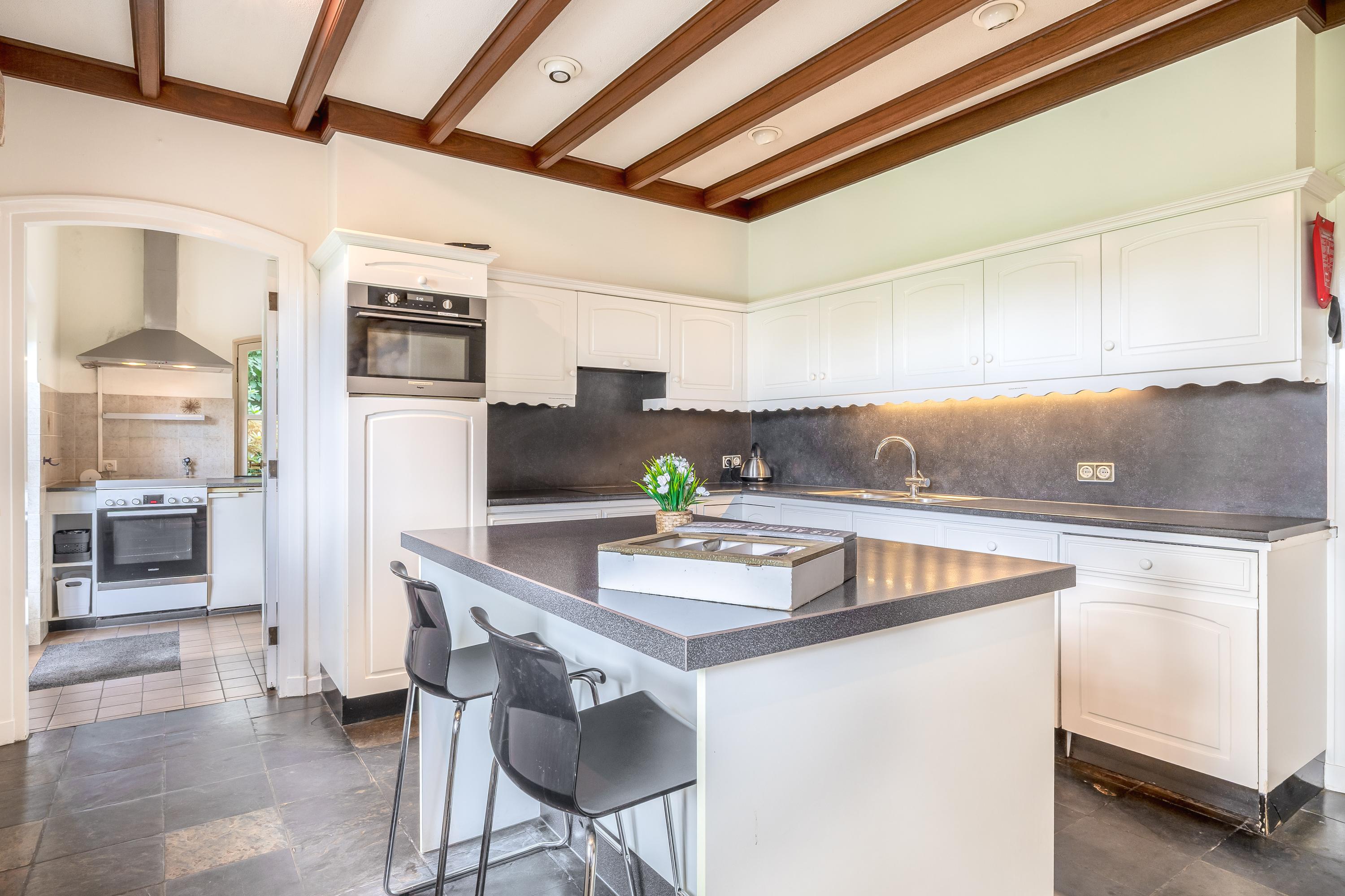 The country house exudes atmosphere and comfort. On the ground floor, you will find an impressive entrance hall with a mezzanine, a spacious living room with a sitting area with a cosy fireplace, a dining area and a separate television room, a spacious kitchen, a utility room and a bedroom with an en-suite bathroom. Authentic details such as wooden beamed ceilings and natural stone floors enhance the rural character. On the first floor are four large bedrooms, one with an en-suite bathroom, a second bathroom and a separate toilet. All rooms have natural light, washbasins and two bedrooms have built-in wardrobes – ideal for guest accommodation or family living. In the basement you will find even more space: an extra bedroom, a recreation/party/hobby room with bar, bathroom, storage room, central heating system and separate entrance to the outside. This makes the basement ideal as guest accommodation or a practice space.