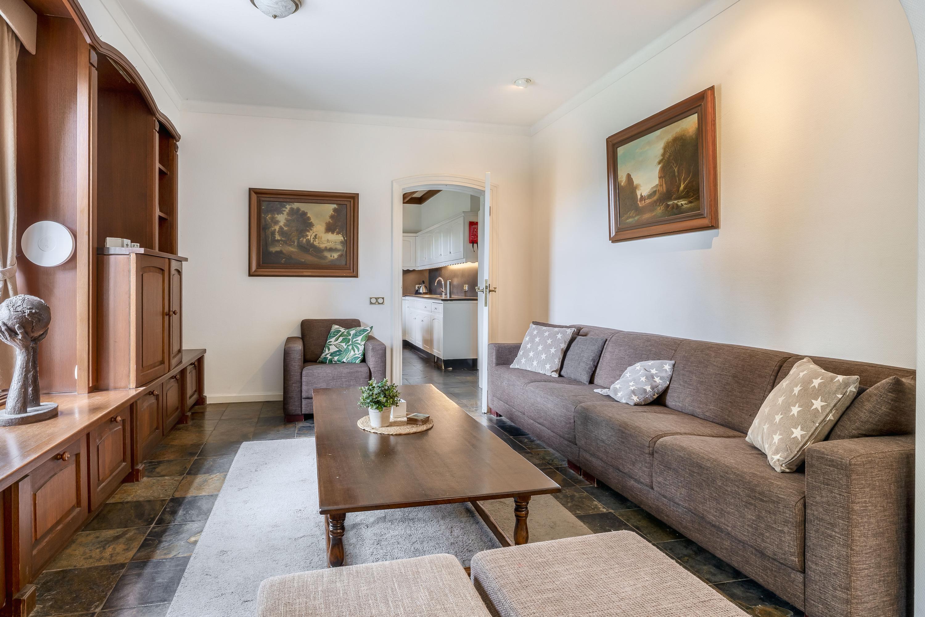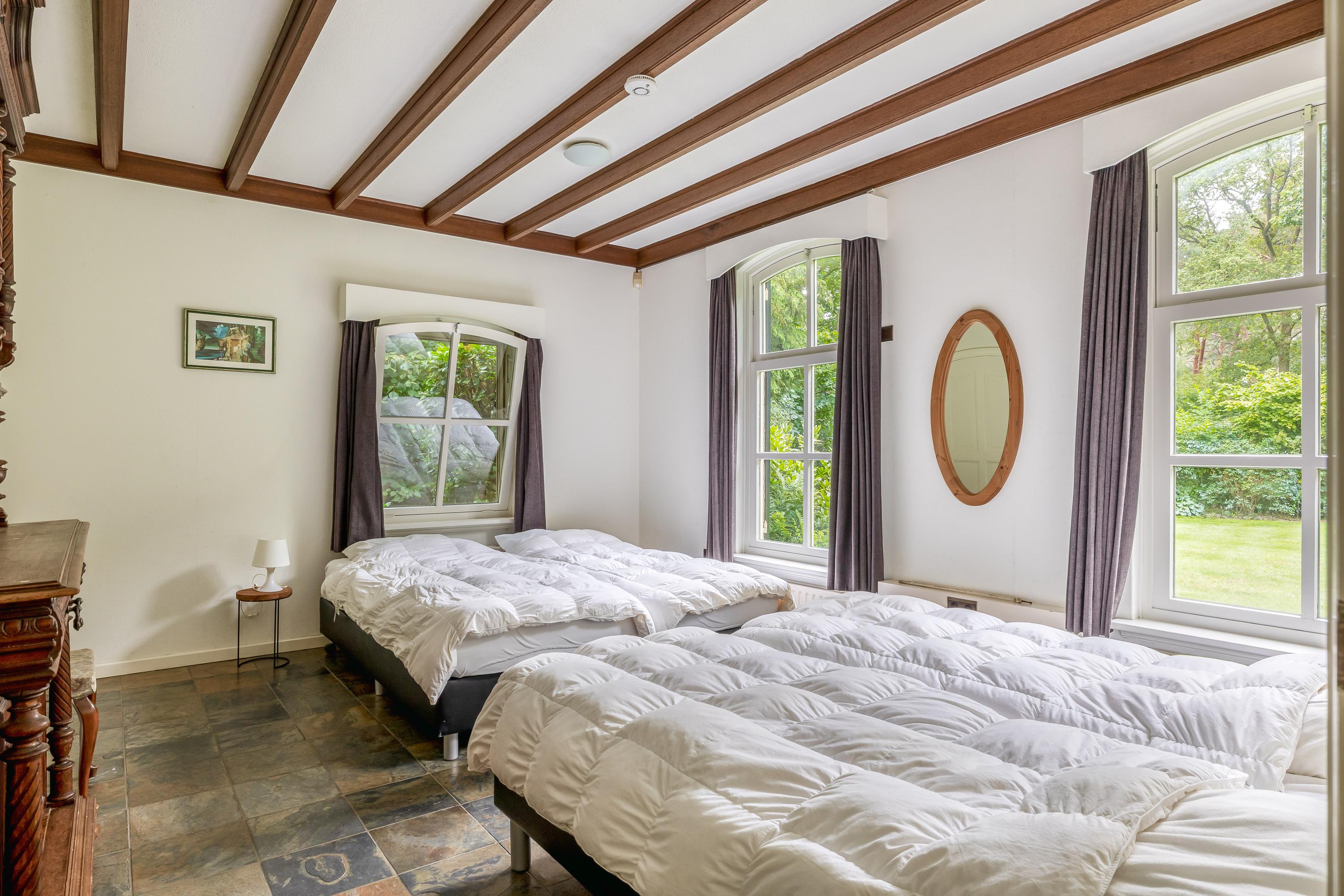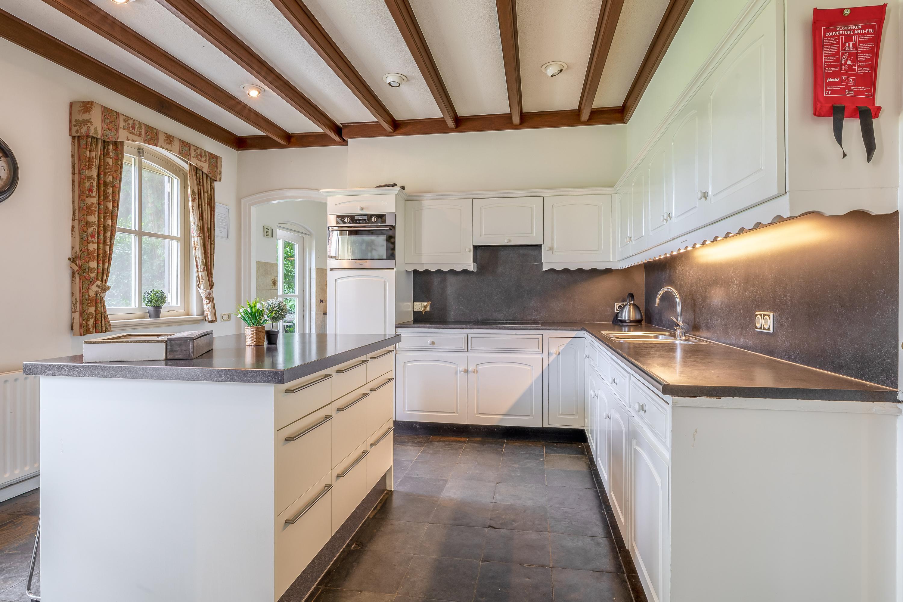 The country house exudes atmosphere and comfort. On the ground floor, you will find an impressive entrance hall with a mezzanine, a spacious living room with a sitting area with a cosy fireplace, a dining area and a separate television room, a spacious kitchen, a utility room and a bedroom with an en-suite bathroom. Authentic details such as wooden beamed ceilings and natural stone floors enhance the rural character. On the first floor are four large bedrooms, one with an en-suite bathroom, a second bathroom and a separate toilet. All rooms have natural light, washbasins and two bedrooms have built-in wardrobes – ideal for guest accommodation or family living. In the basement you will find even more space: an extra bedroom, a recreation/party/hobby room with bar, bathroom, storage room, central heating system and separate entrance to the outside. This makes the basement ideal as guest accommodation or a practice space.