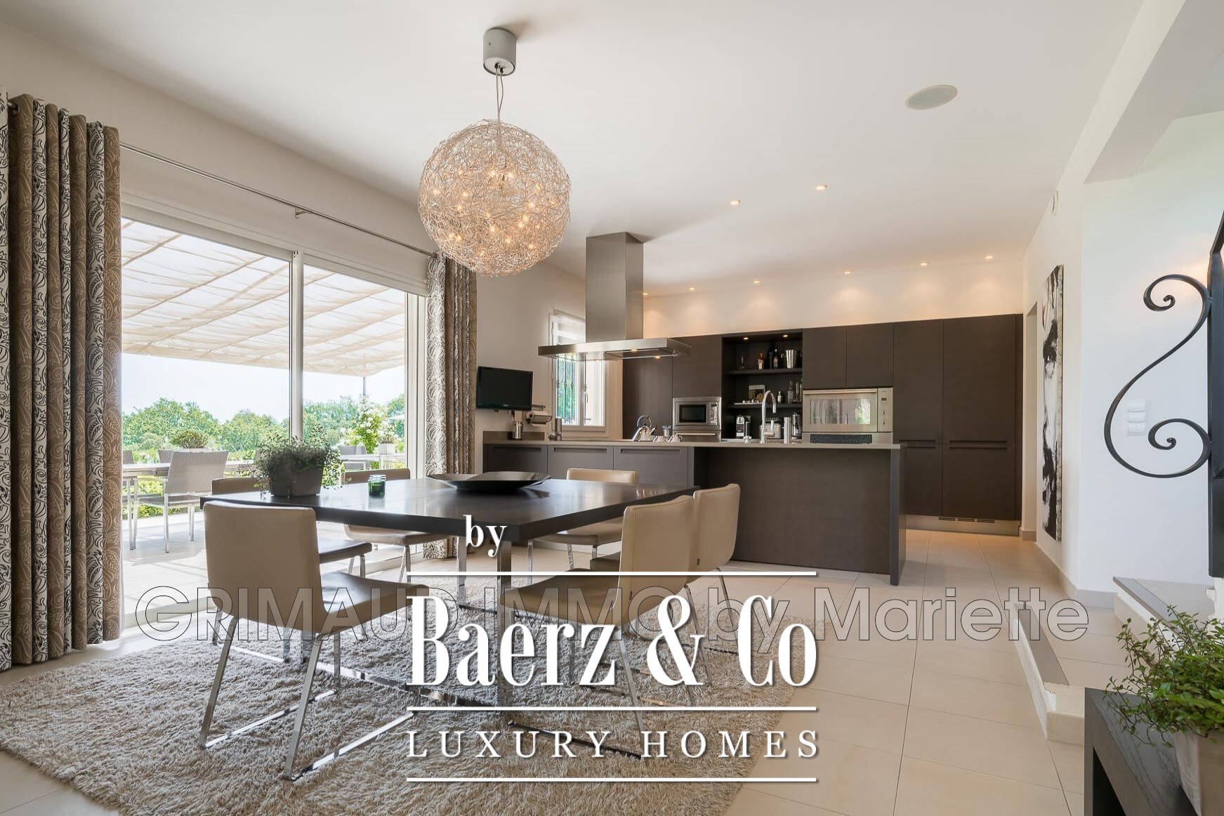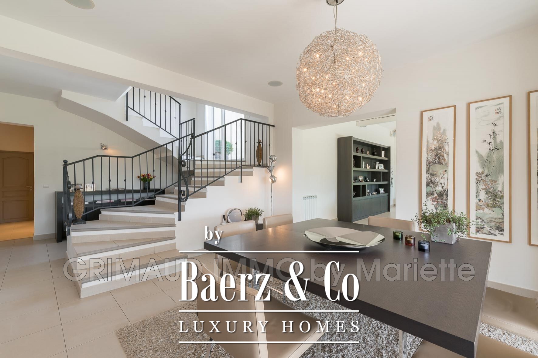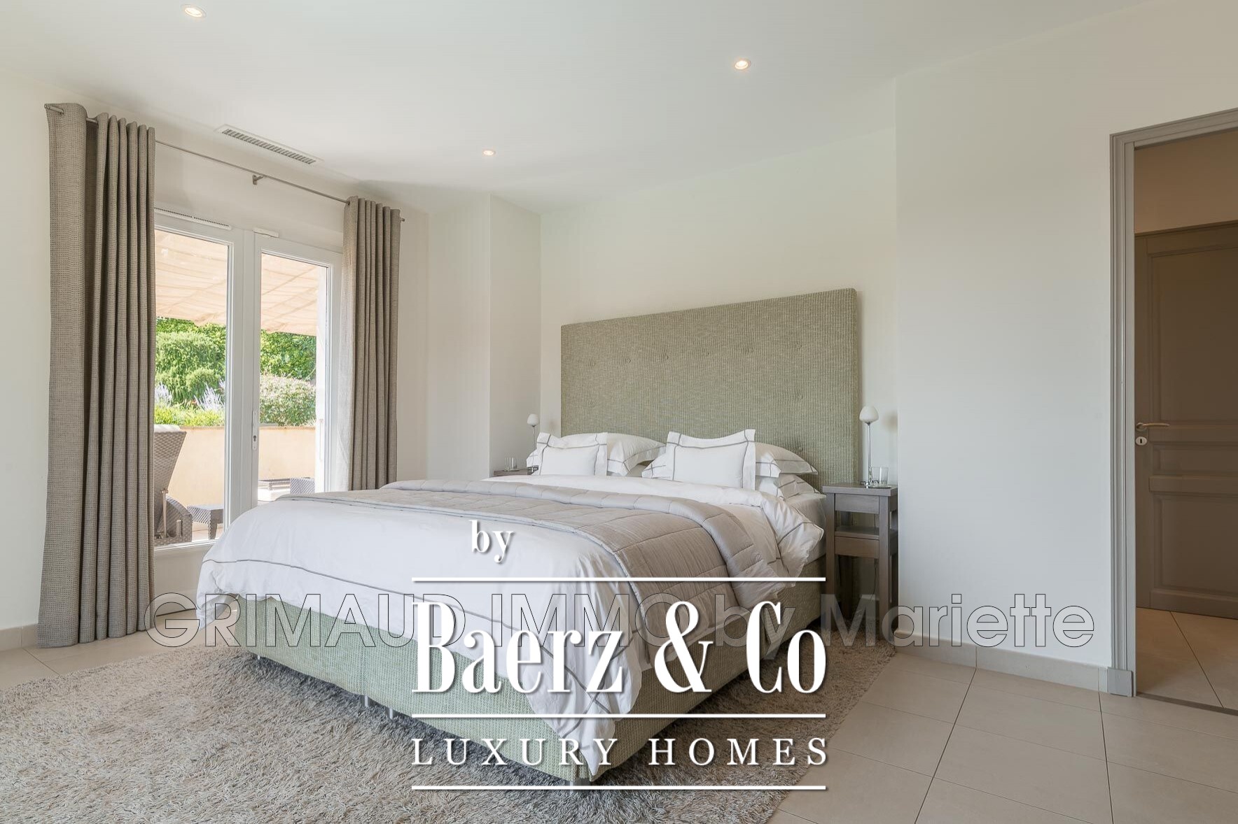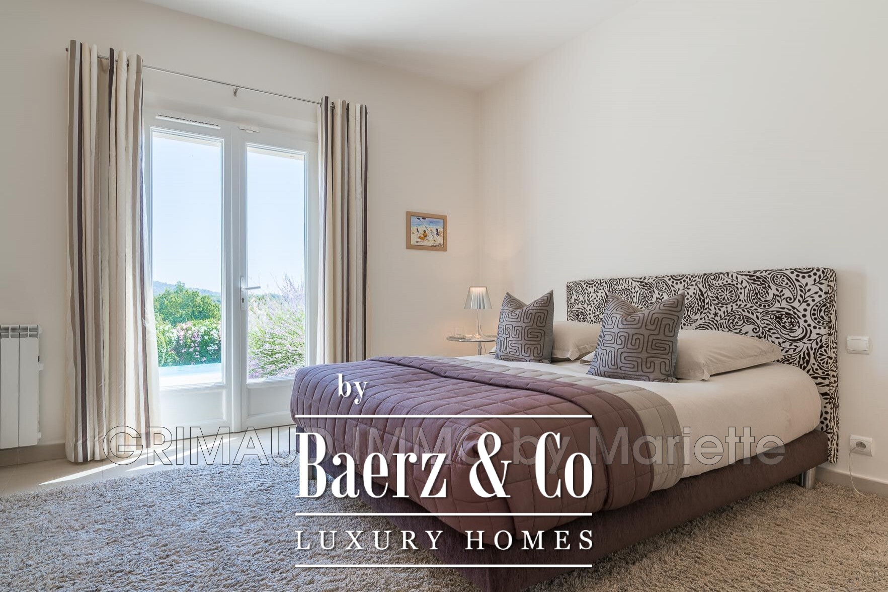In a secure estate, in complete tranquility, with an unobstructed view of the Grimaud countryside, just steps from the village: This stunning villa with high-end features is laid out as follows: On the main level: an entrance leading to a double garage, two bedrooms each with their own private bathroom and direct access to a rooftop terrace. On the garden level: a spacious, bright living room with fireplace,