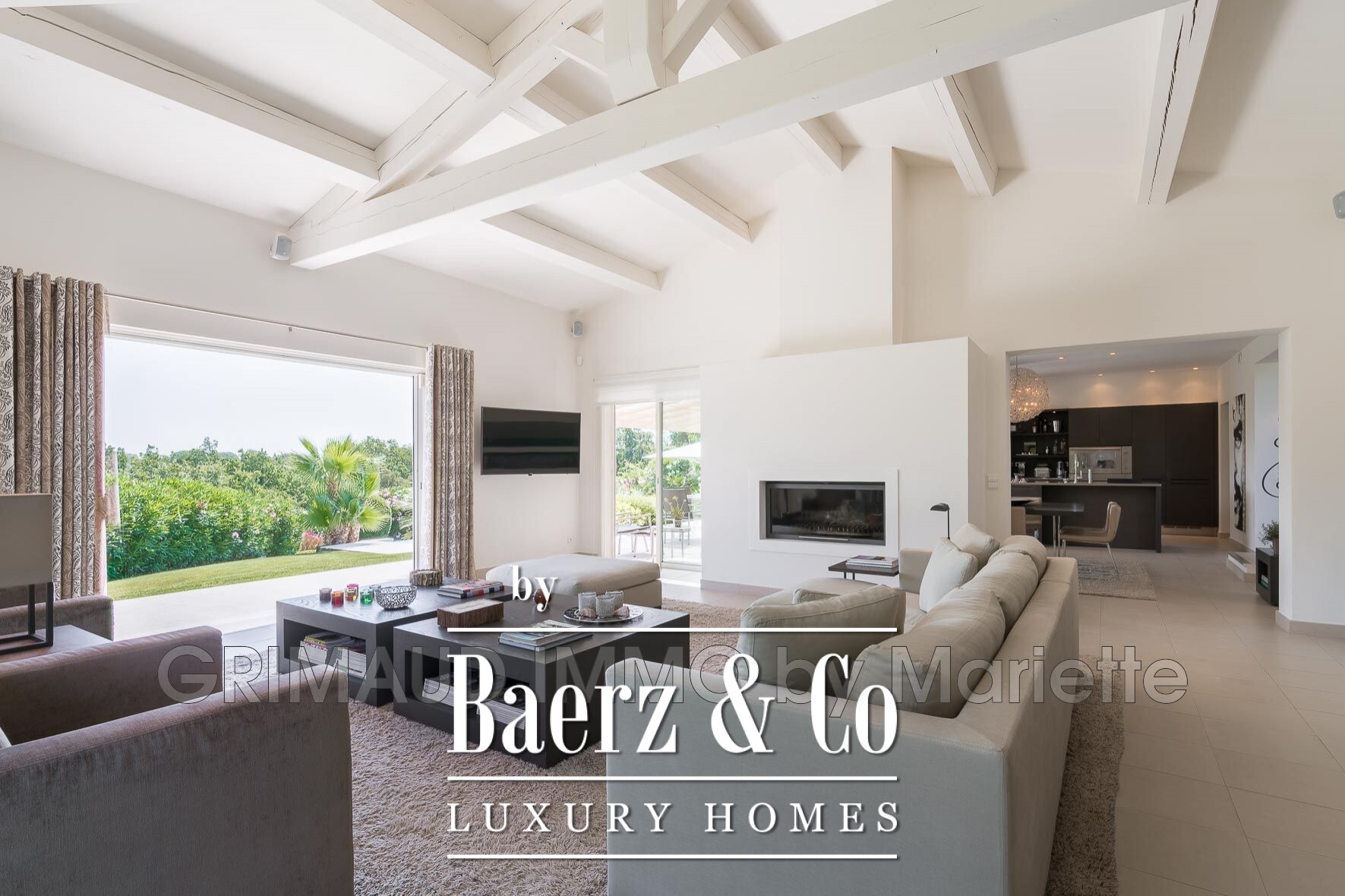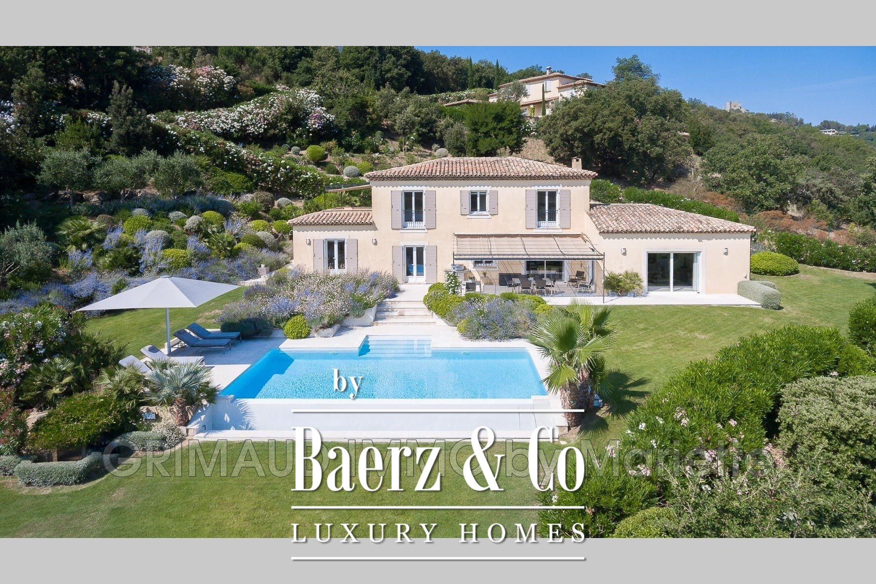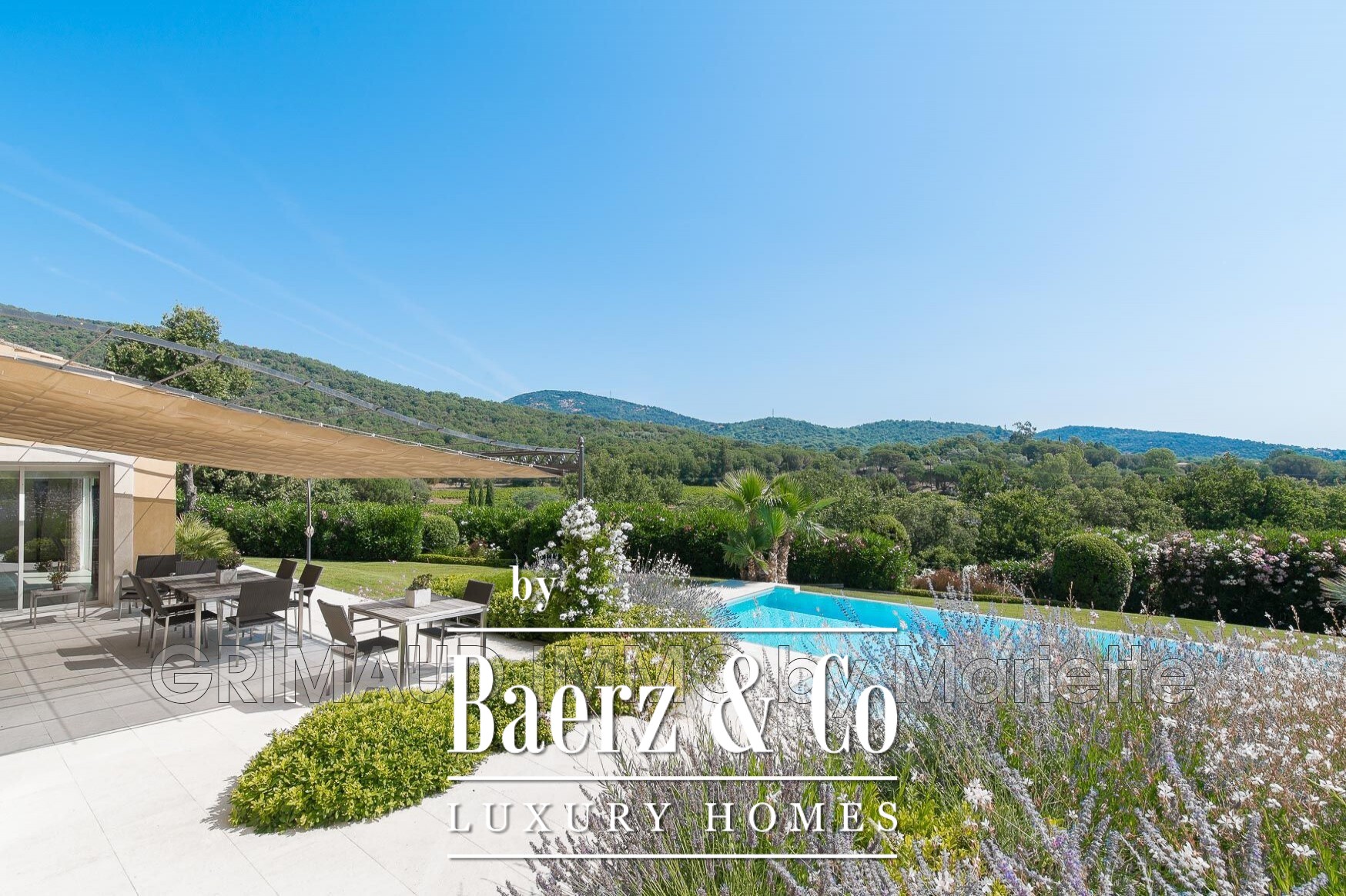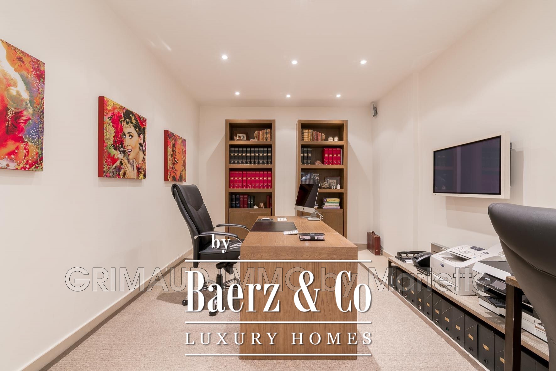 In a secure estate, in complete tranquility, with an unobstructed view of the Grimaud countryside, just steps from the village: This stunning villa with high-end features is laid out as follows: On the main level: an entrance leading to a double garage, two bedrooms each with their own private bathroom and direct access to a rooftop terrace. On the garden level: a spacious, bright living room with fireplace,