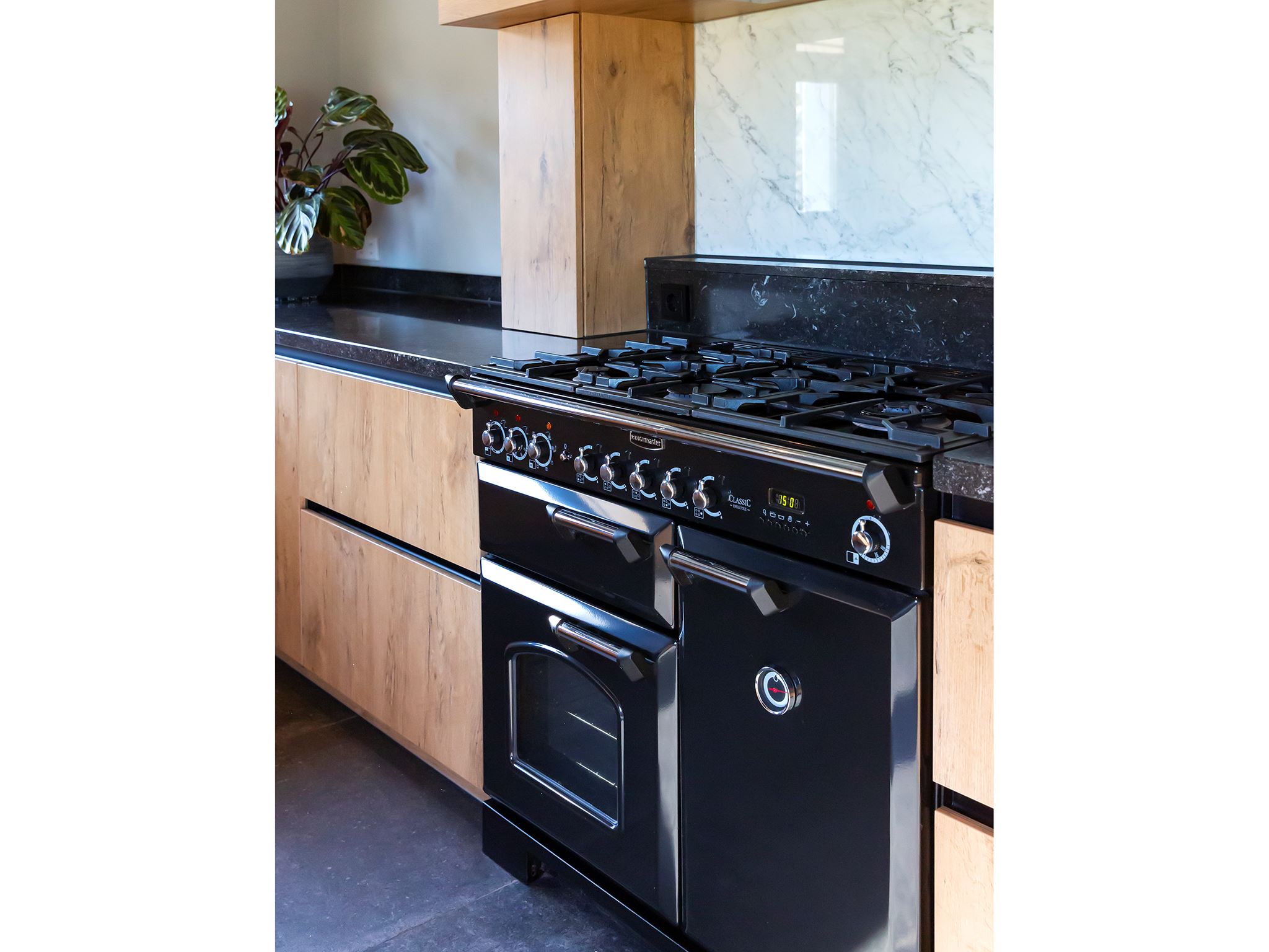 At the front is the luxurious kitchen, spacious, square layout, equipped with a Belgian bluestone countertop, various built-in appliances including a steam oven, dishwasher, fridge/freezer and a large, sturdy 6-burner gas stove with two ovens. At the end there is a cozy bar area.