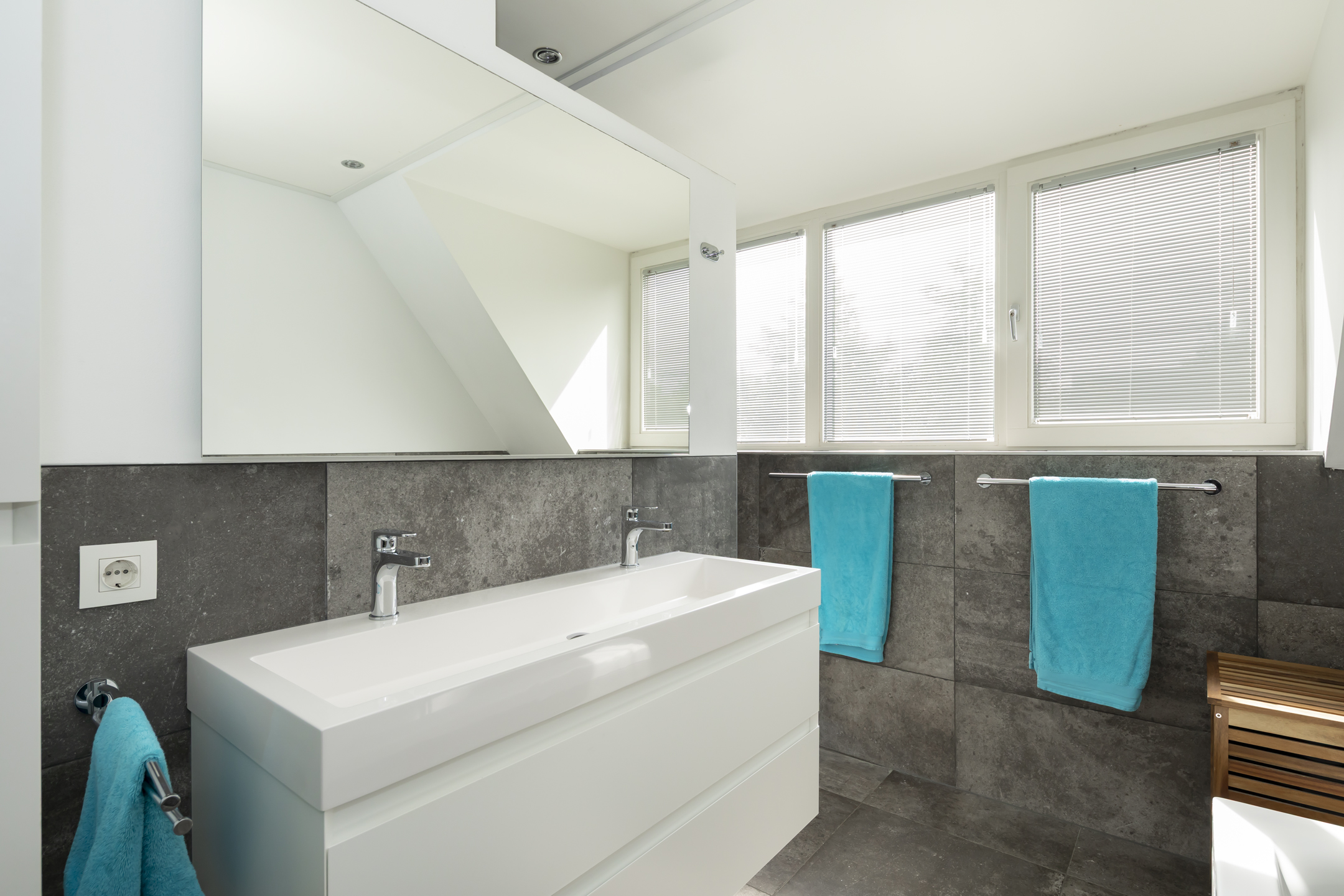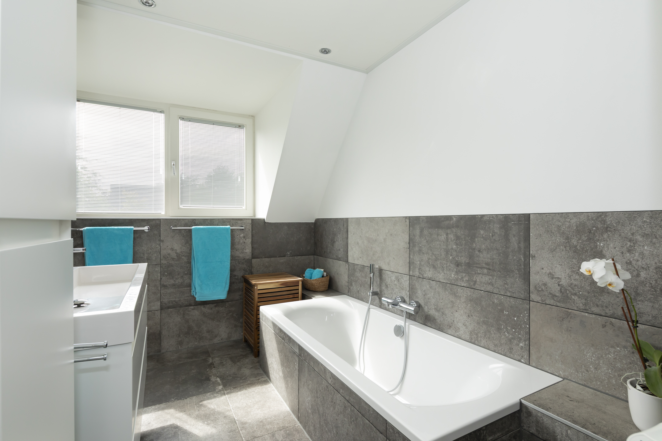 The bathroom is fully equipped with a large bathtub, a spacious walk-in shower, and a double sink integrated into a vanity unit. The bathroom enjoys pleasant natural daylight thanks to the large windows. It is neatly tiled and features comfortable underfloor heating and a designer radiator.