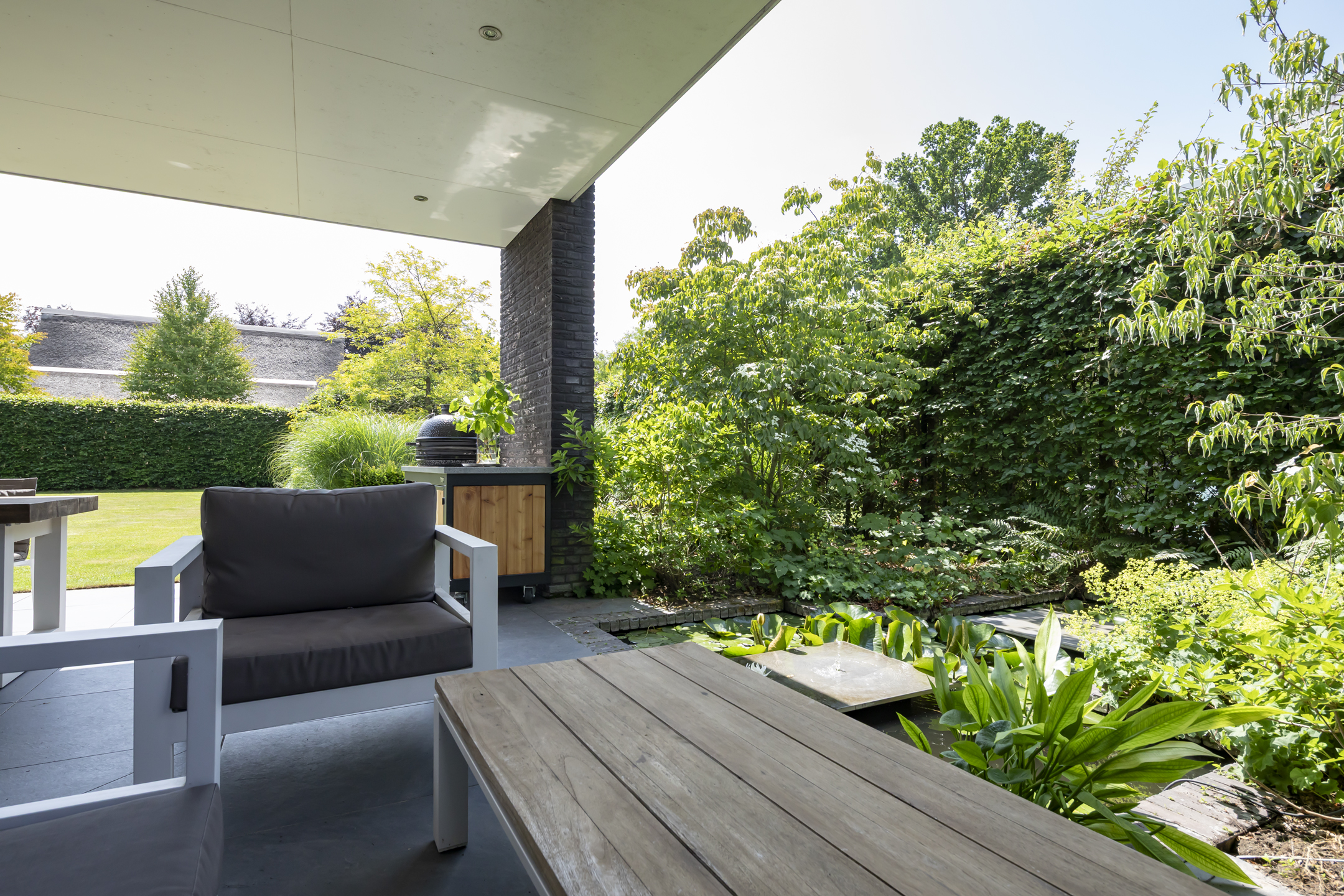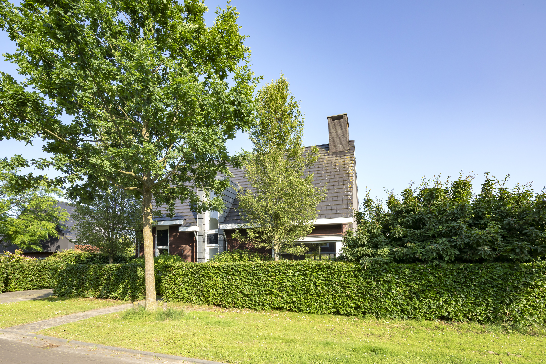 The garden is fantastic, offering wonderful privacy. The beautiful garden is bordered by green hedges, ensuring minimal views. A lovely lawn with a spacious sun terrace provides ample space for playing. In addition to the sun terrace, there is also a beautiful, spacious covered terrace adjacent to the rear of the house. The covered area has a large skylight, ensuring optimal daylight penetration into the living room. And then there's the unique sauna in the garden, where you can relax after a hard day's work. The front garden is also neatly landscaped and has a spacious driveway with space for 4 to 6 cars.