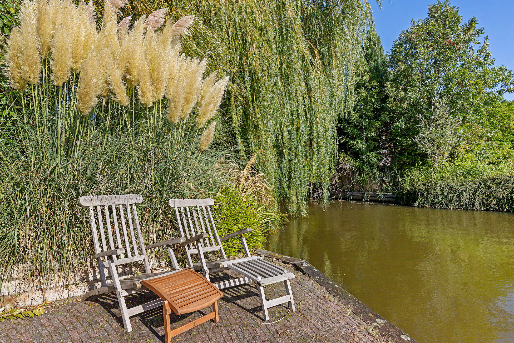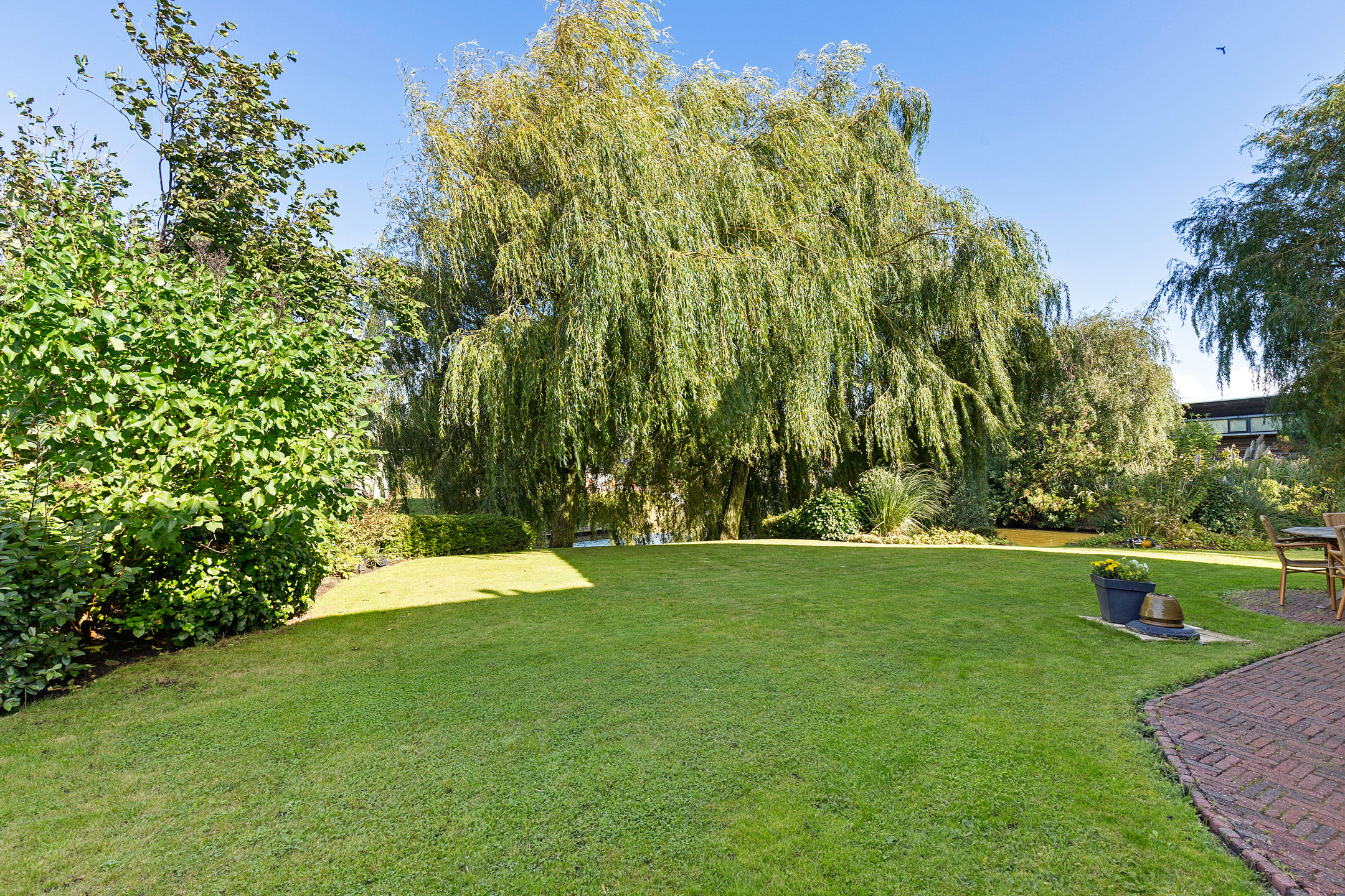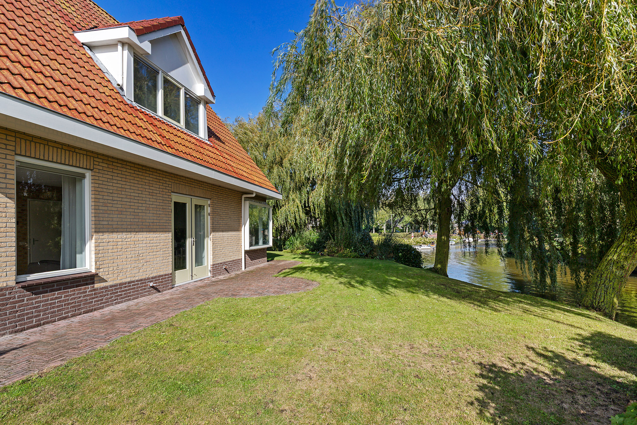 The beautifully landscaped garden with mature trees, shrubs, borders, and terraces ensures privacy and offers both sunny and shaded spots throughout the day. A sunken south-east facing terrace directly on the water, complete with a private swimming ladder, is the perfect place to enjoy your morning coffee or relax all day while watching boats pass by. The waterway is a branch of the famous *Bolswardervaart*, part of the historic Eleven Cities Route, and is accessible by boat.