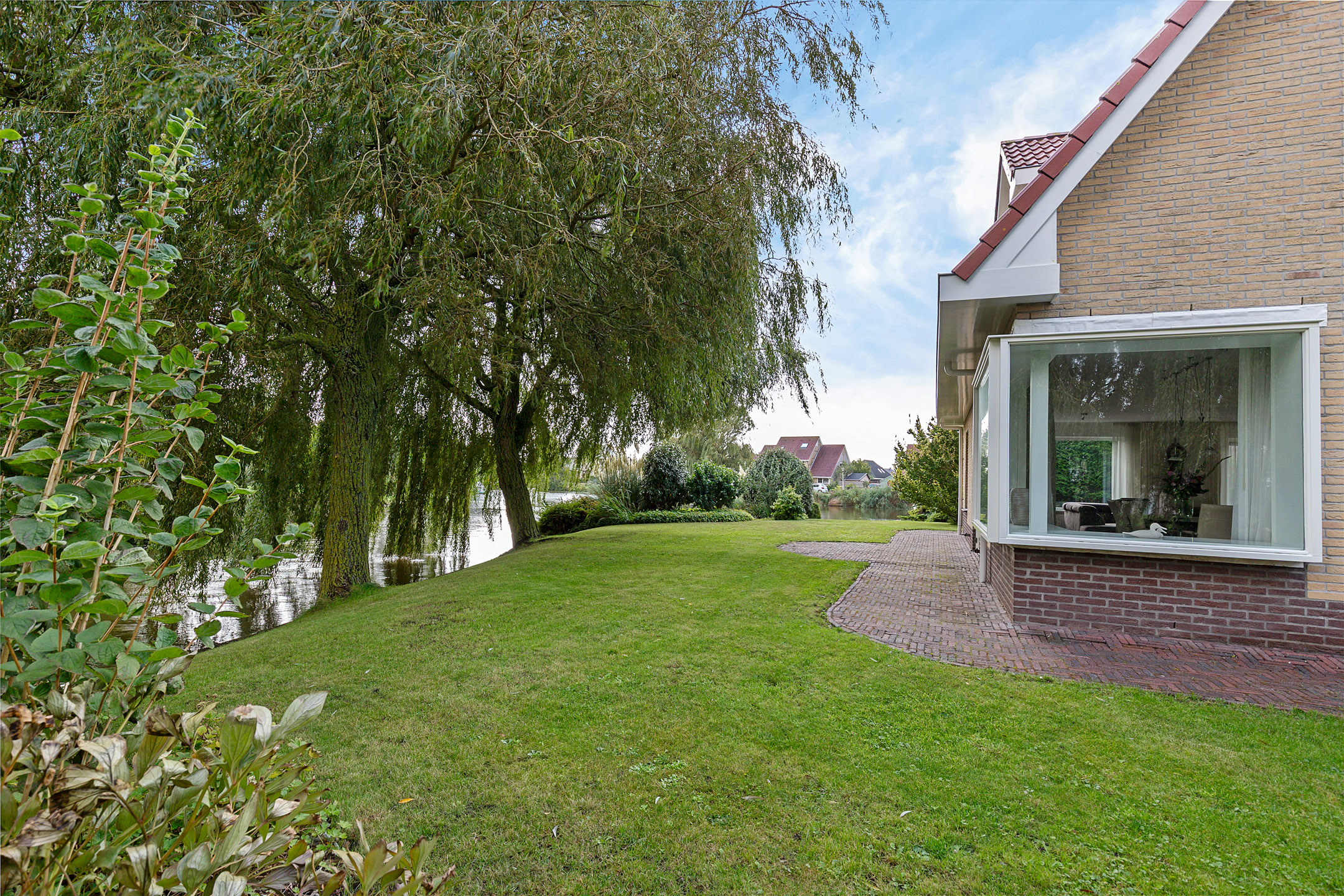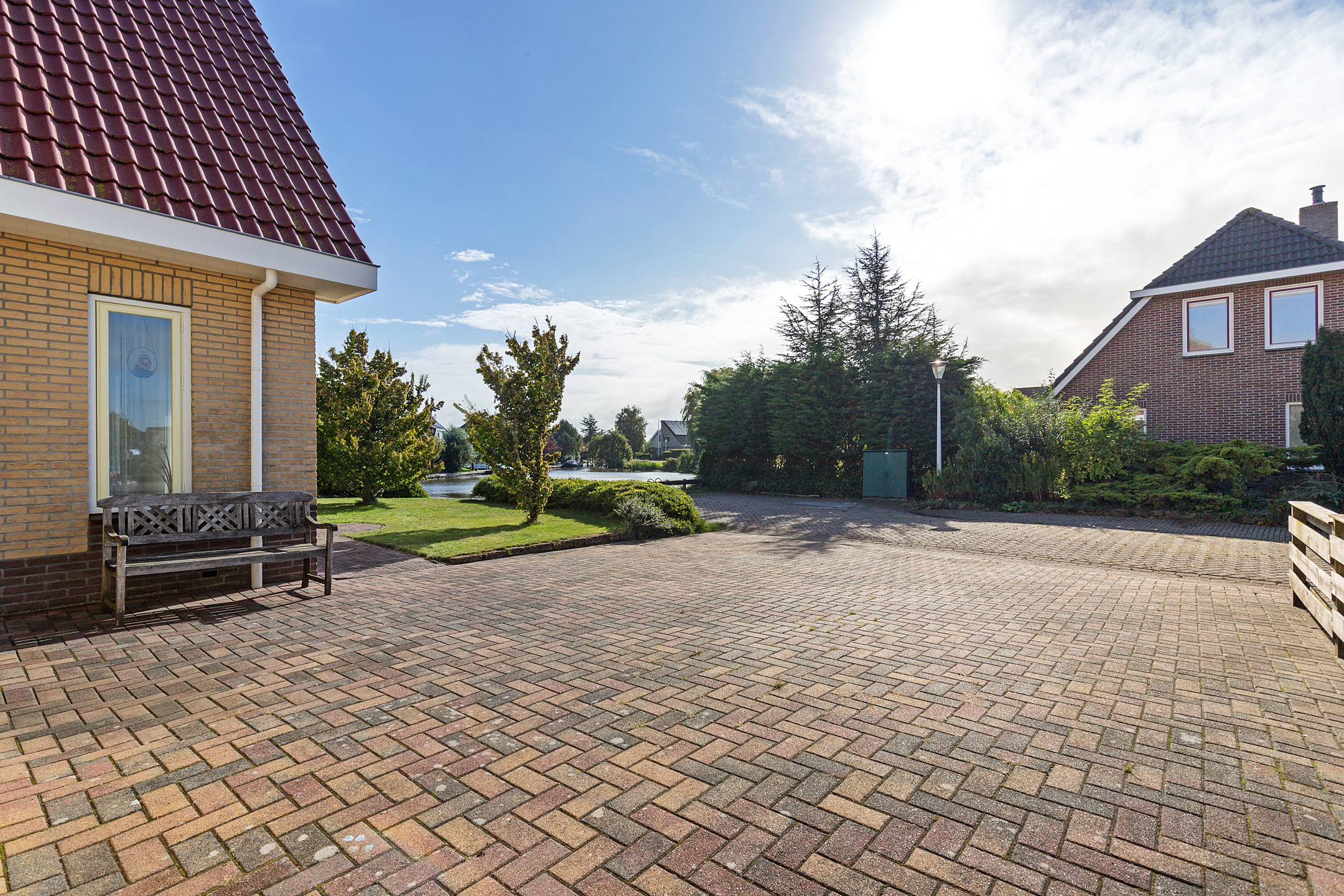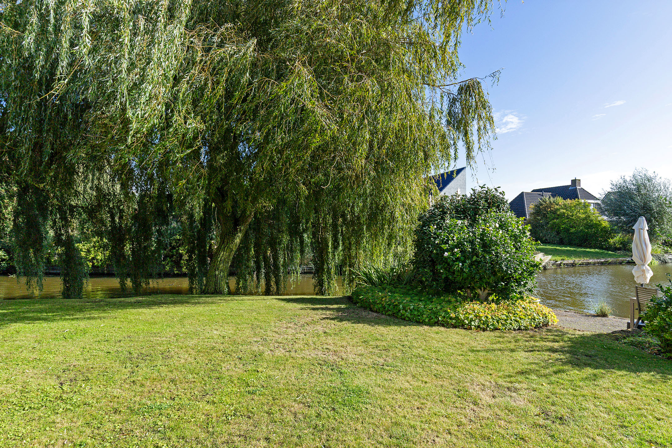 The beautifully landscaped garden with mature trees, shrubs, borders, and terraces ensures privacy and offers both sunny and shaded spots throughout the day. A sunken south-east facing terrace directly on the water, complete with a private swimming ladder, is the perfect place to enjoy your morning coffee or relax all day while watching boats pass by. The waterway is a branch of the famous *Bolswardervaart*, part of the historic Eleven Cities Route, and is accessible by boat.