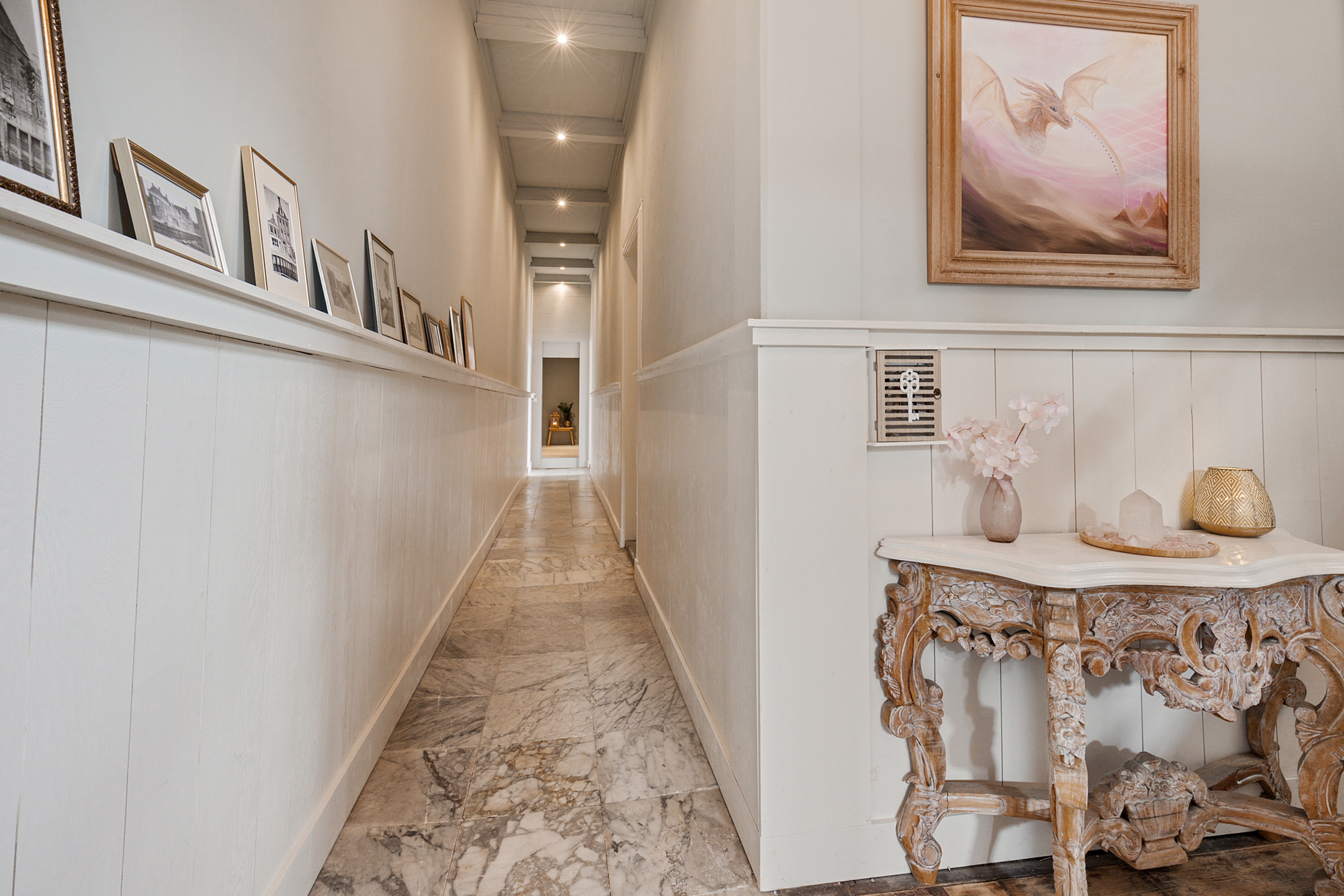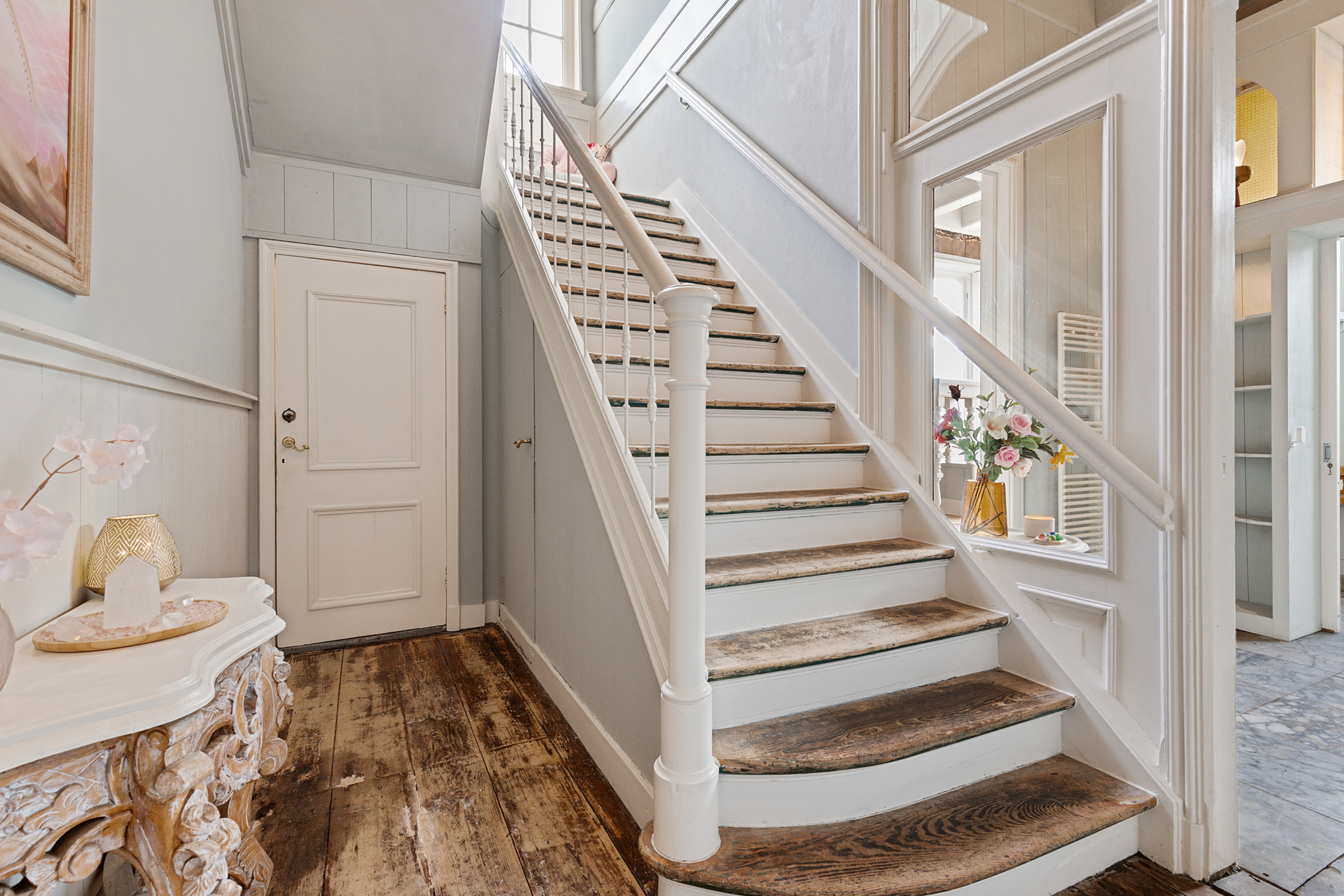Behind the monumental front door unfolds a stately hall with marble floor and vestibule. The long corridor provides access to three generous rooms an internal storage space and the original wide staircase.