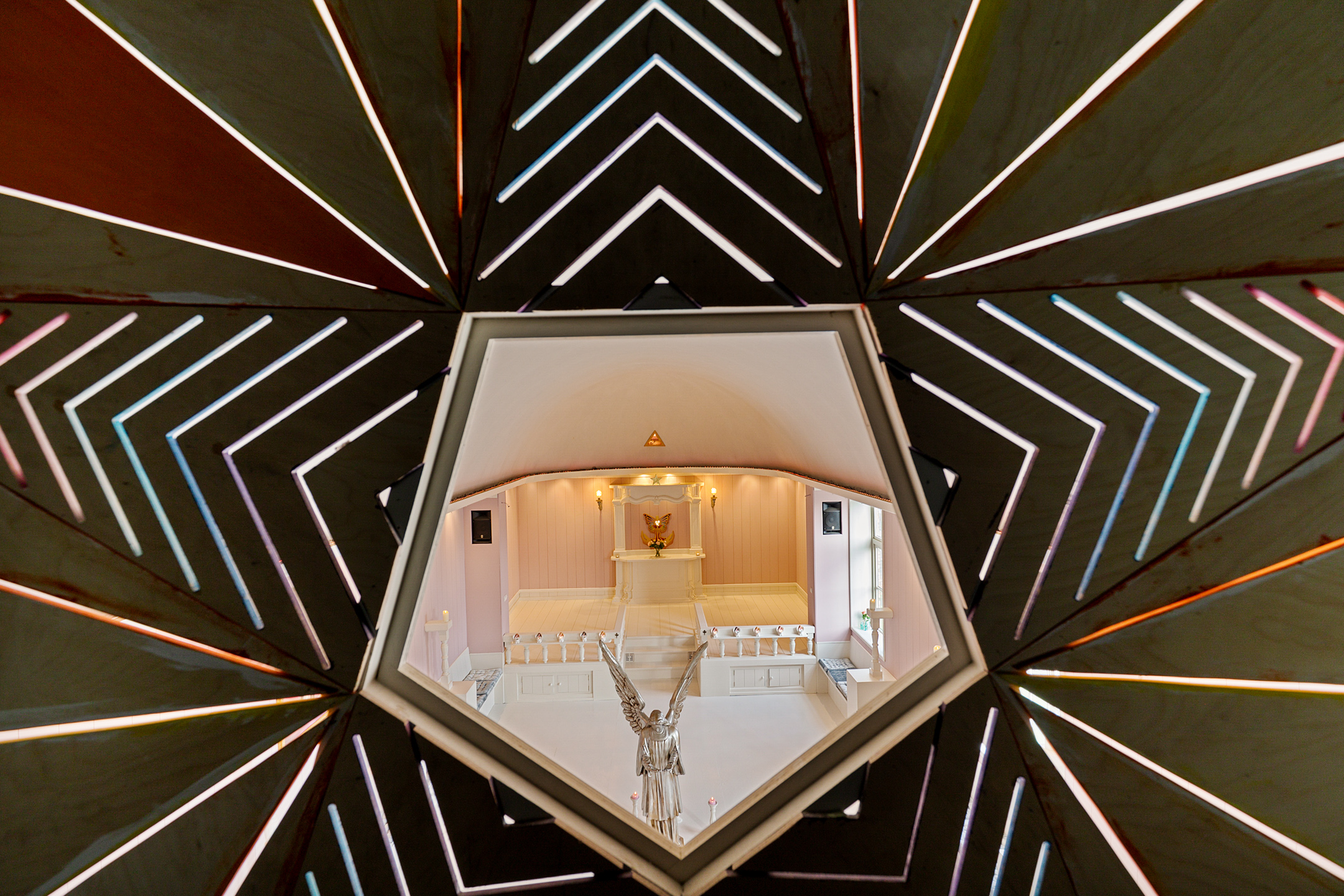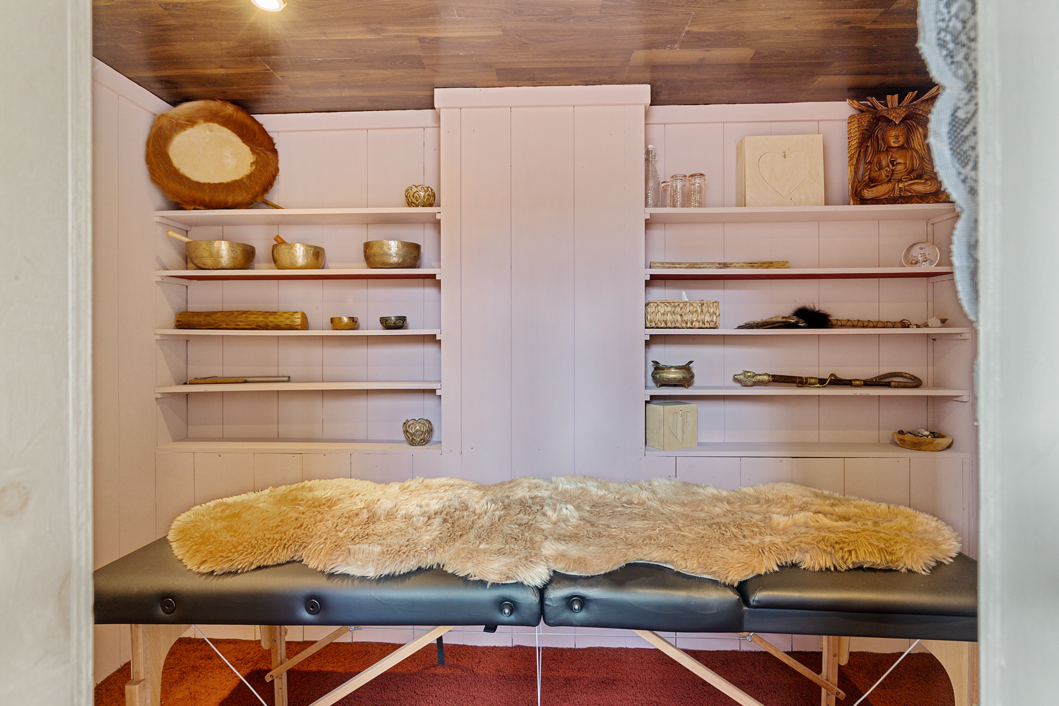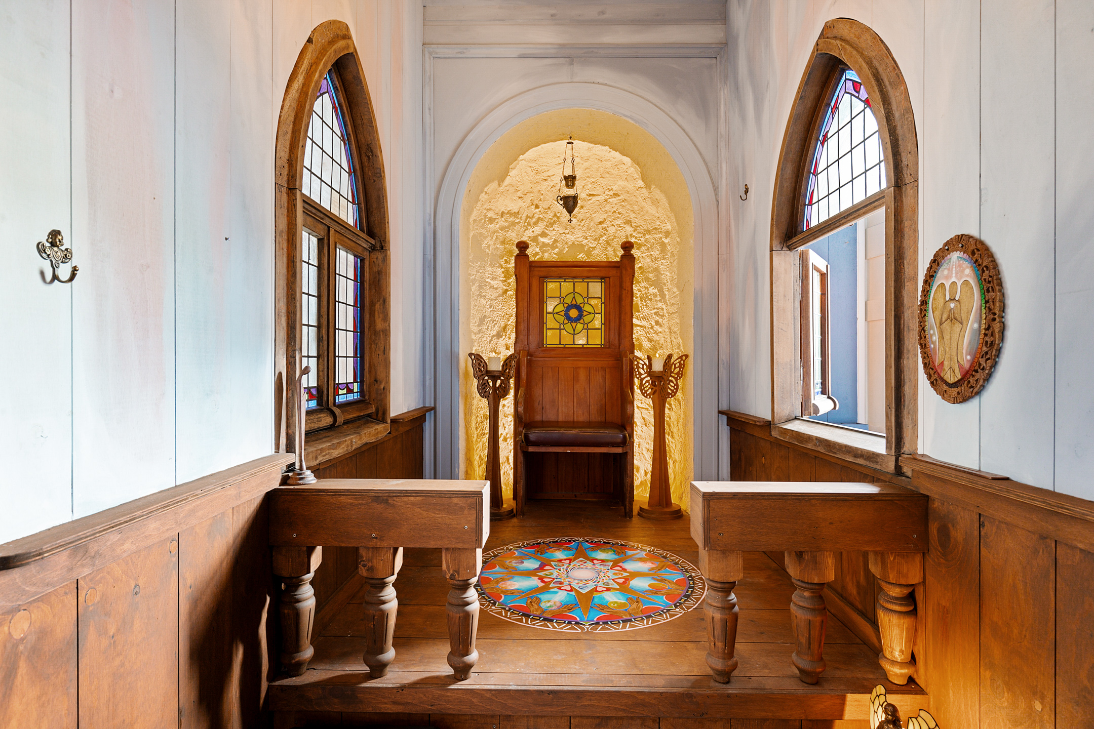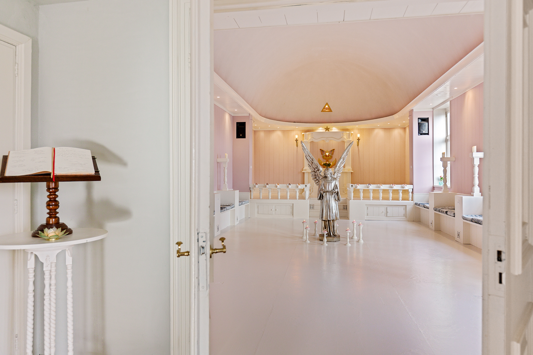 The rear room now a practice space is playfully arranged with a mezzanine and a treatment room below. From here there is access to the chapel, a transitional space with an original decorative niche in the side wall.