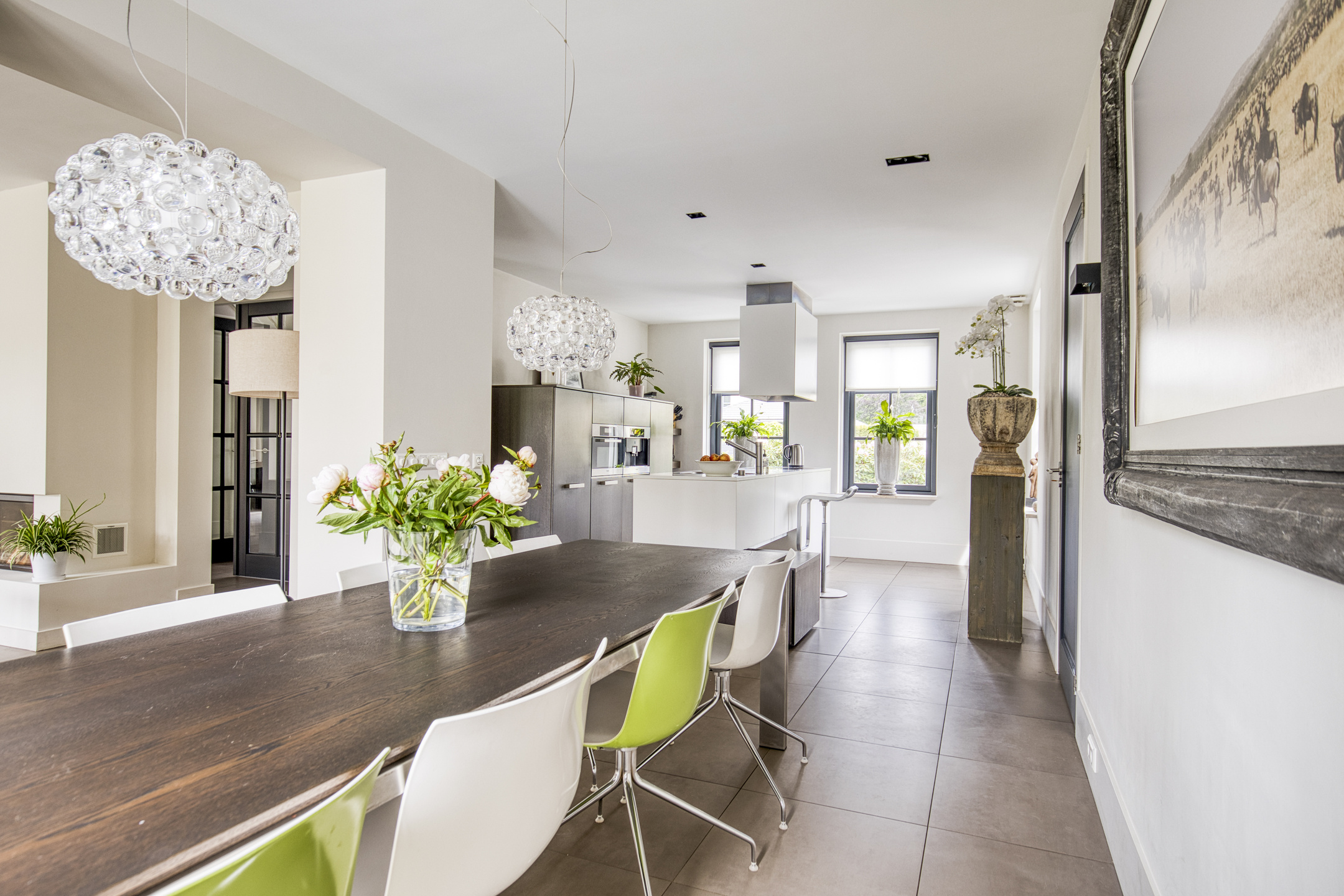 Bij binnenkomst valt direct de imposante entree op: licht en ruimte komen u tegemoet, een voorbode van wat deze villa te bieden heeft. De halfopen living vormt het hart van het huis, met prachtig zicht op de tuin en openslaande deuren naar het terras.