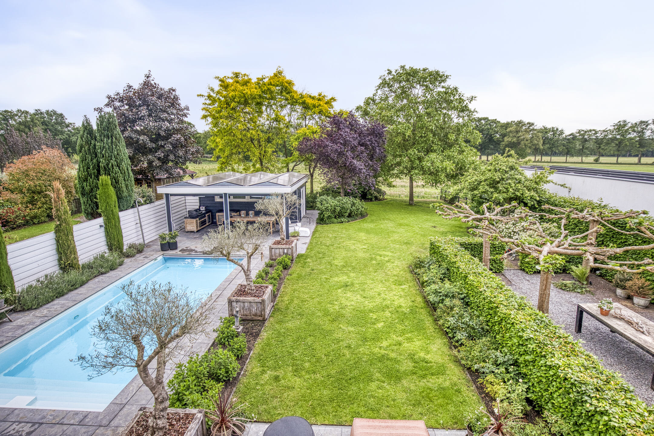 De fraai aangelegde achtertuin biedt ultieme privacy en een prachtig vrij uitzicht over aangrenzende weilanden waar regelmatig paarden grazen, een plaatje dat nooit verveelt. Meerdere terrassen zorgen ervoor dat u de hele dag door kunt kiezen tussen zon of schaduw.