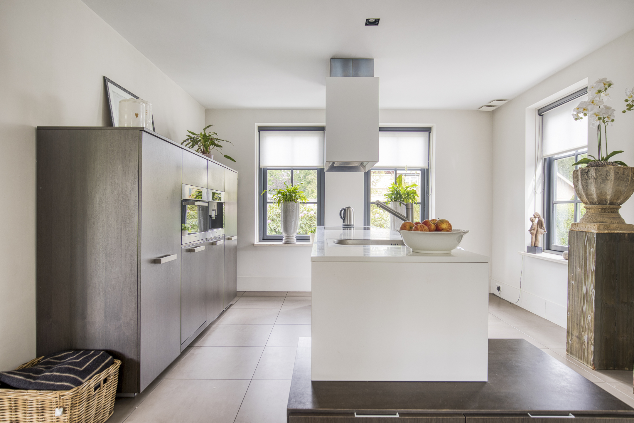 De Boffi keuken links van de living is een echte blikvanger. Voorzien van een kookeiland, een vaste kastenwand met inbouwapparatuur en ruimte voor een grote eettafel. Ideaal voor lange diners met vrienden en familie. Ook hier brengen openslaande deuren naar de tuin veel licht en een heerlijk vrij gevoel.