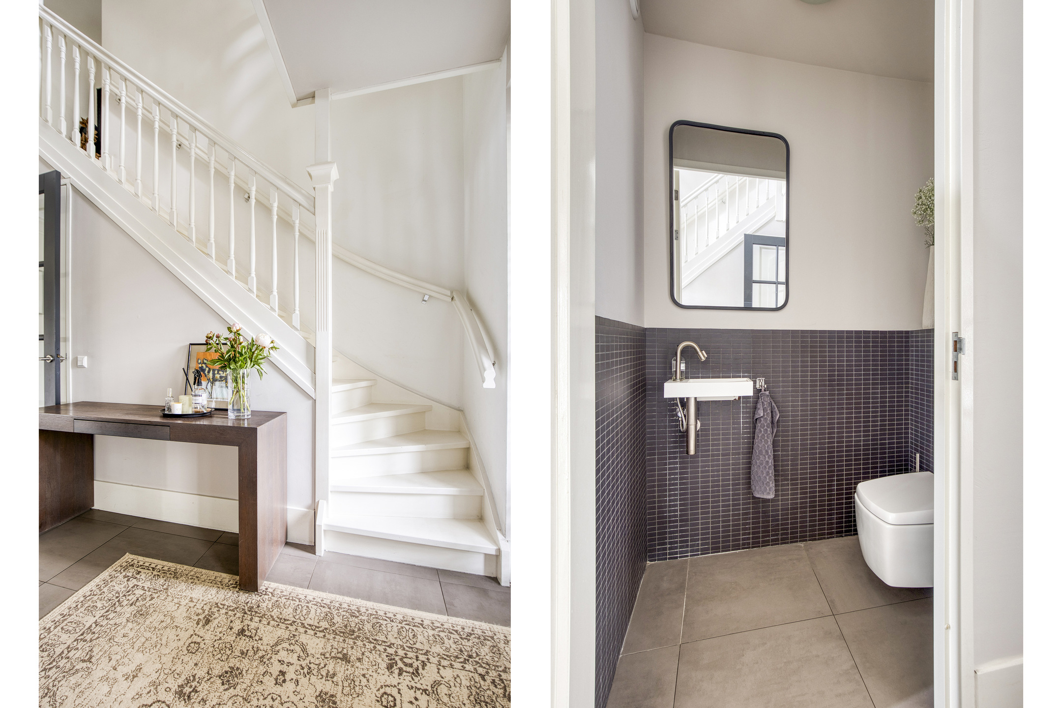 Hal/entree met een trapkast, wandafwerking stucwerk, tegelvloer (60x60), plafond afgewerkt met stucwerk;