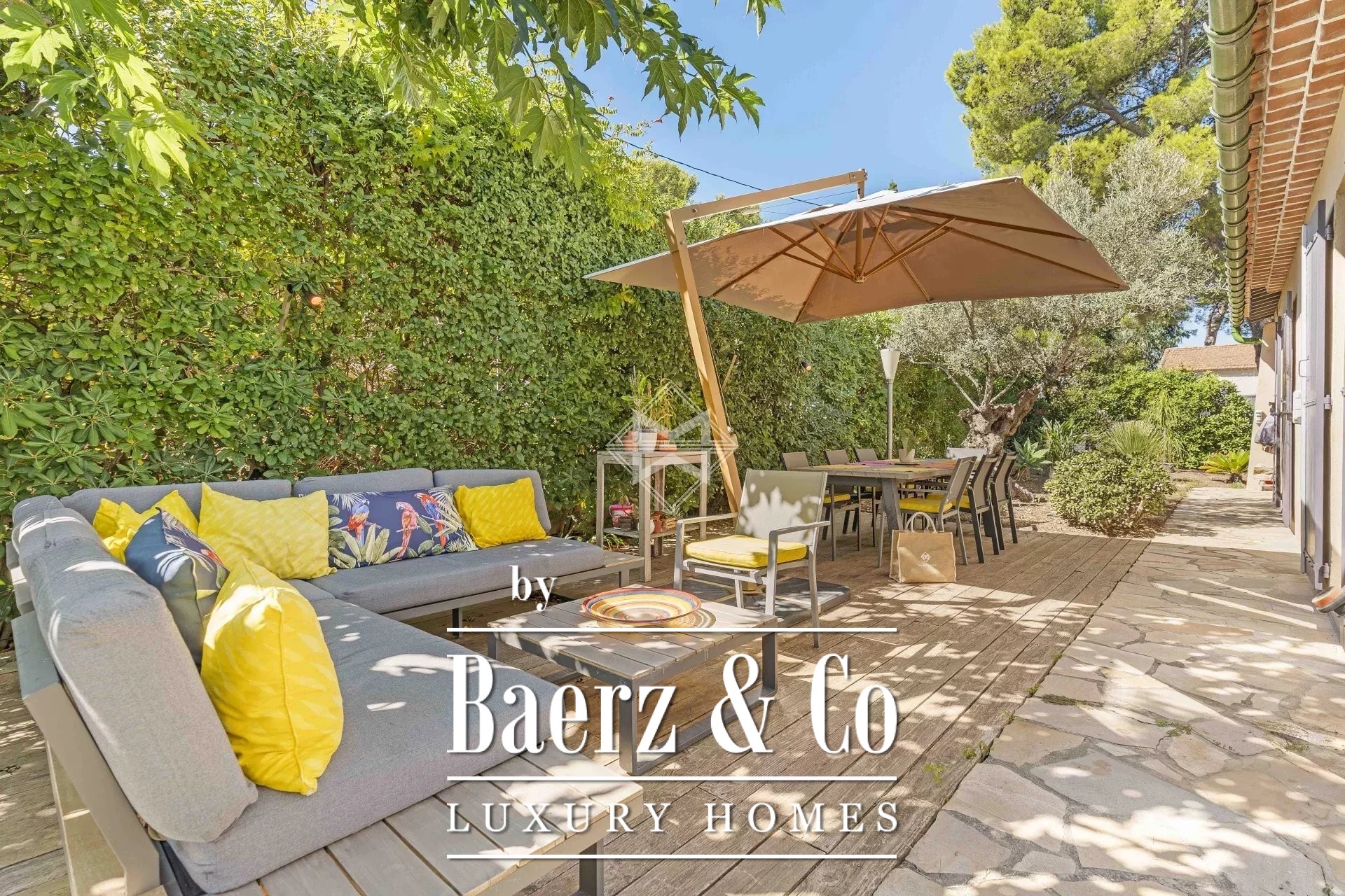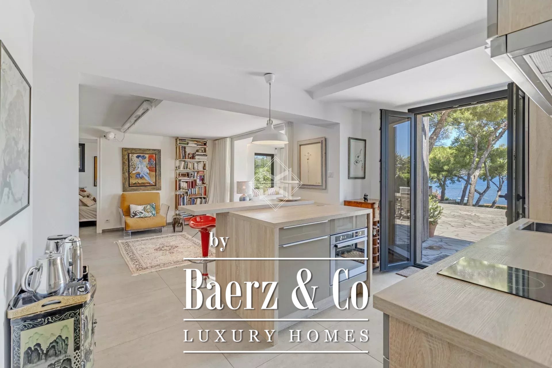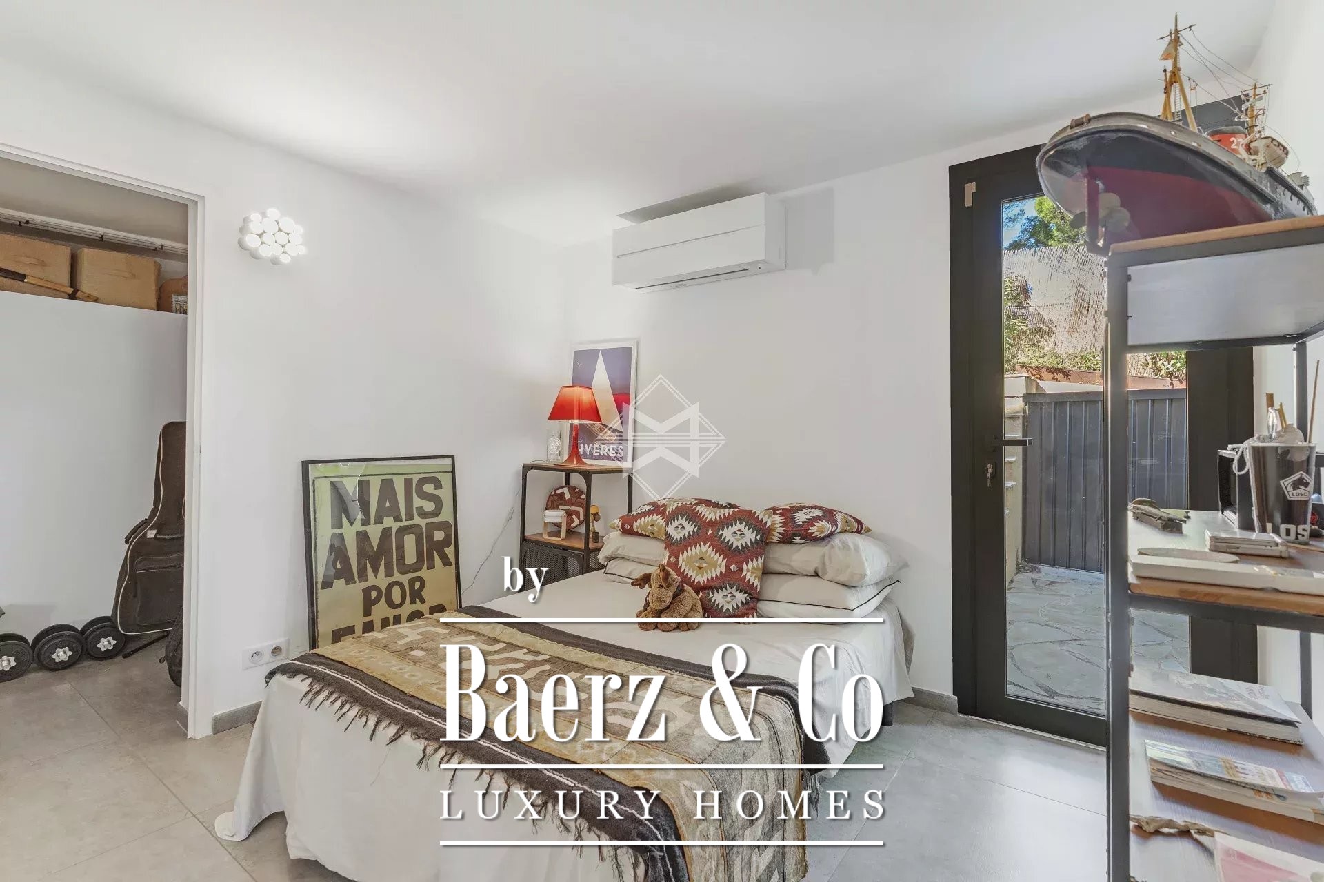 Outside, a landscaped garden of 1,300 sqm provides privacy and serenity. The property also benefits from a privileged access to the Port des Barques, with the possibility to acquire a mooring for your boat directly in front of the villa.