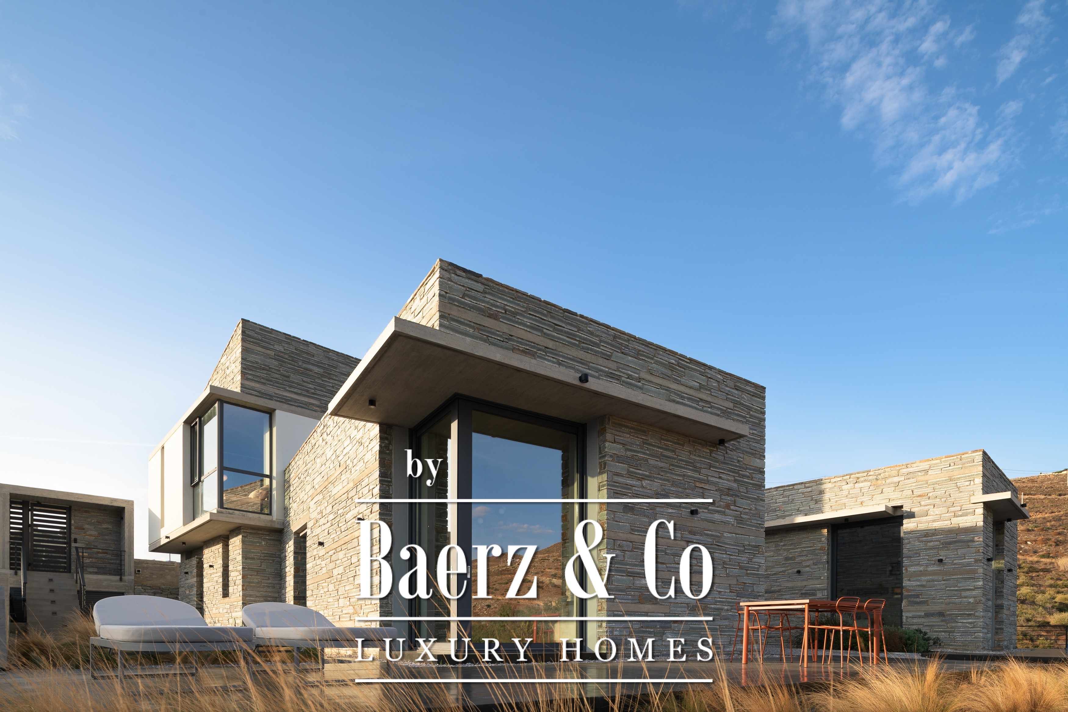 Architecture here speaks in the language of Karystos stone, combining contemporary precision with regional authenticity. Open-plan living and dining areas flow effortlessly into fully equipped kitchens, while expansive glass frames the unfolding seascape from nearly every room. The villa’s four bedrooms, each with its own en-suite bathroom, preserve privacy and comfort, with additional outdoor showers, storage, and designer furnishings completing the sense of preparedness for immediate living or hosting.