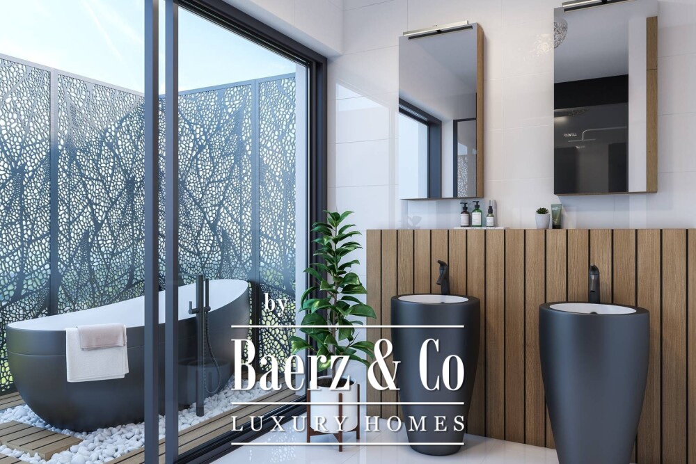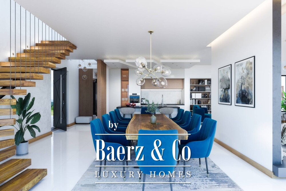 The heart of the villa is an open-plan living space, blending a generous lounge, formal dining area, kitchen, and billiards room. A striking double staircase leads to upper levels, where relaxation areas and accommodations are meticulously designed. Thoughtful openings along the roof and staircase allow light to shift gracefully throughout the day, providing glimpses of the sky and an evolving sense of connection to the surrounding elements.