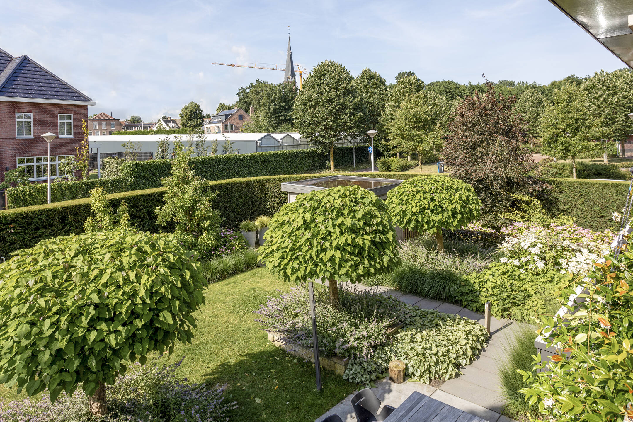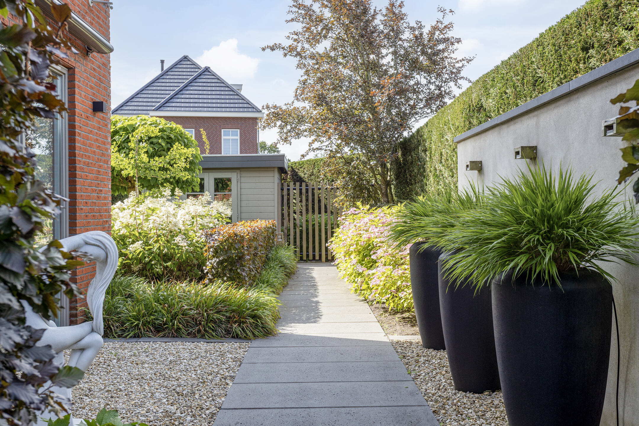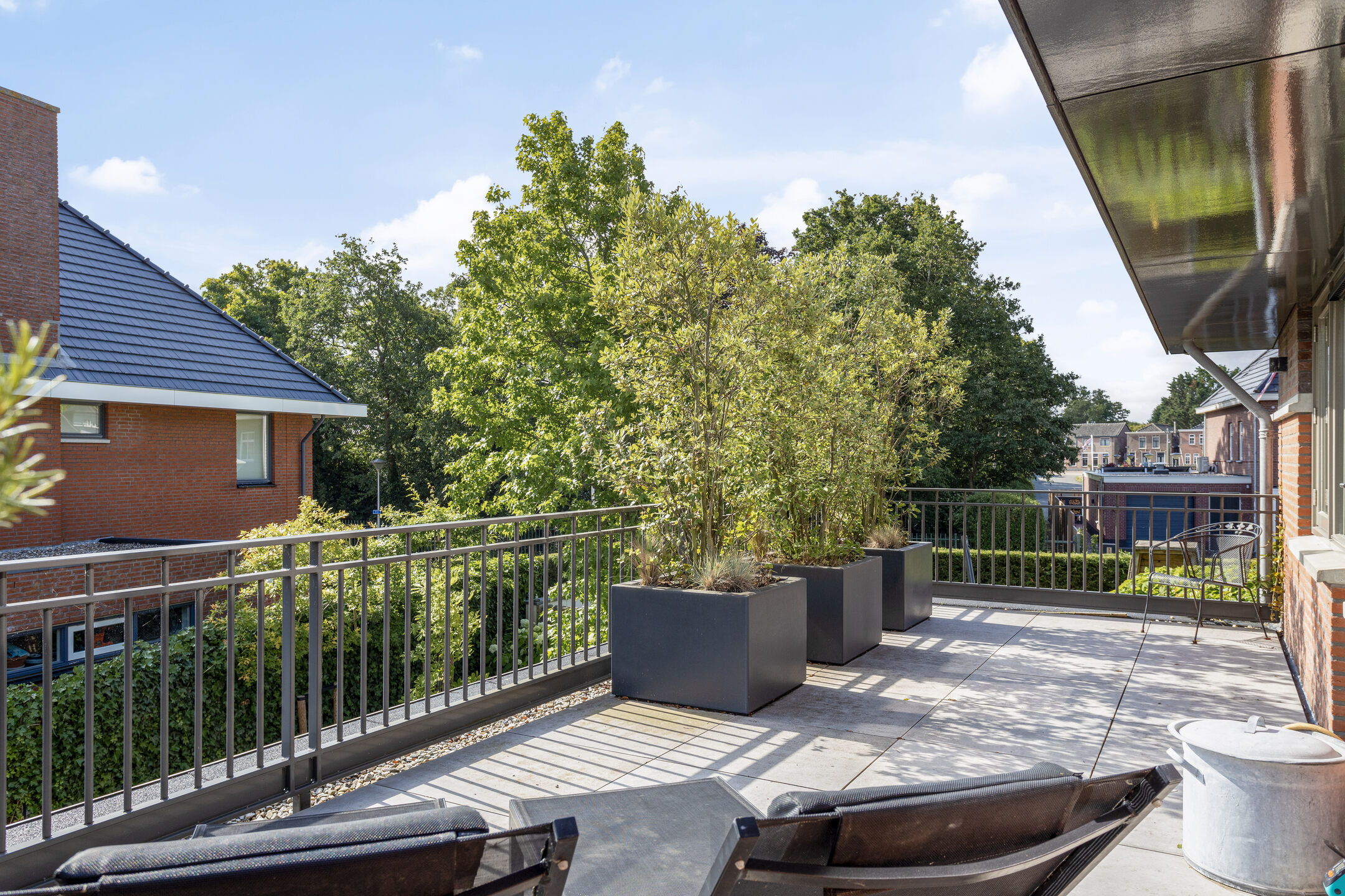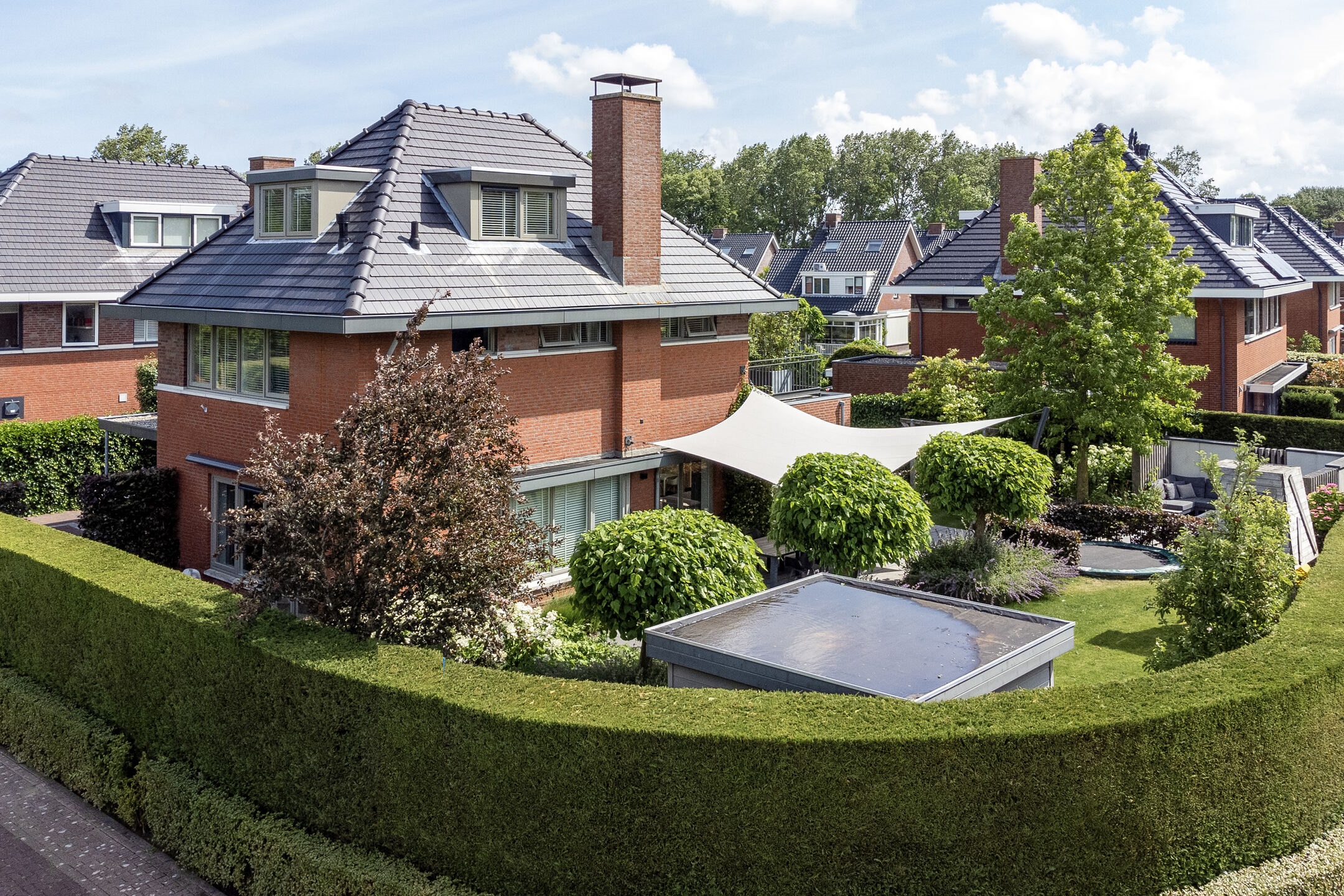 The beautifully landscaped garden has several terraces, grass, planters, flower borders, hedges and an outdoor shower. The spacious terrace facing the living room (Z) has a large sunshade. The garden is surrounded by a beautiful green hedge and can be closed with an electrically operated ornamental fence, which not only provides privacy but also extra security.