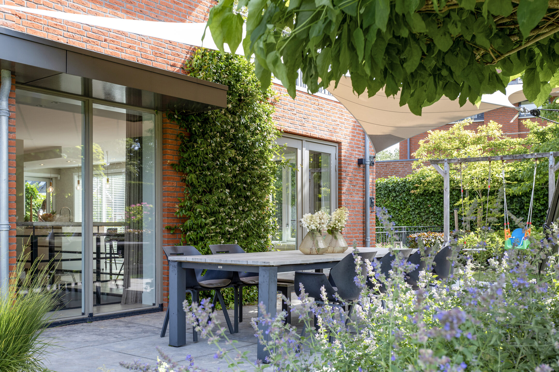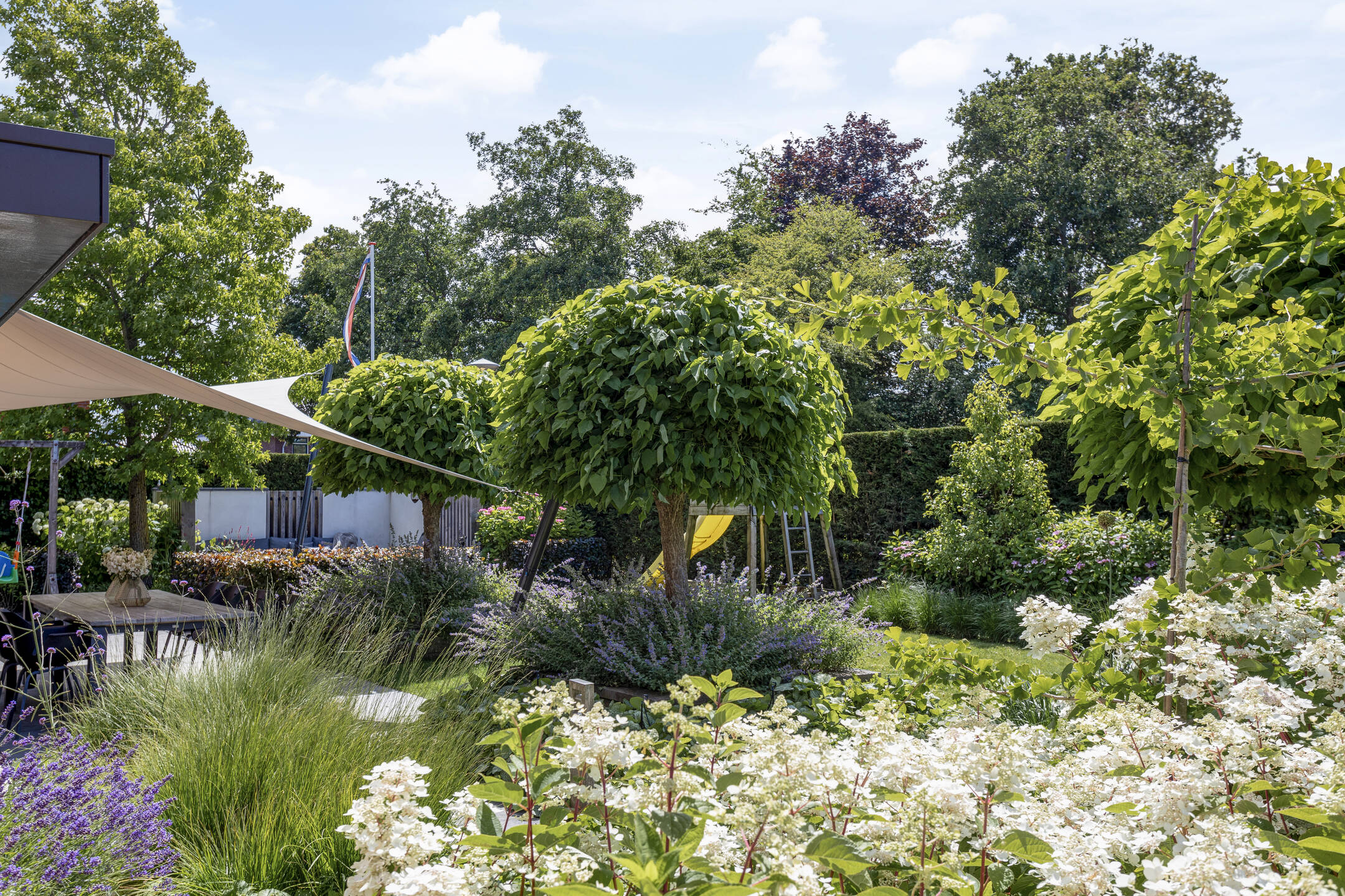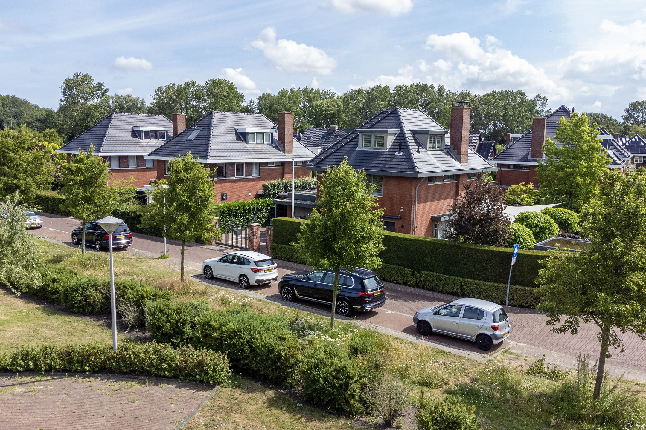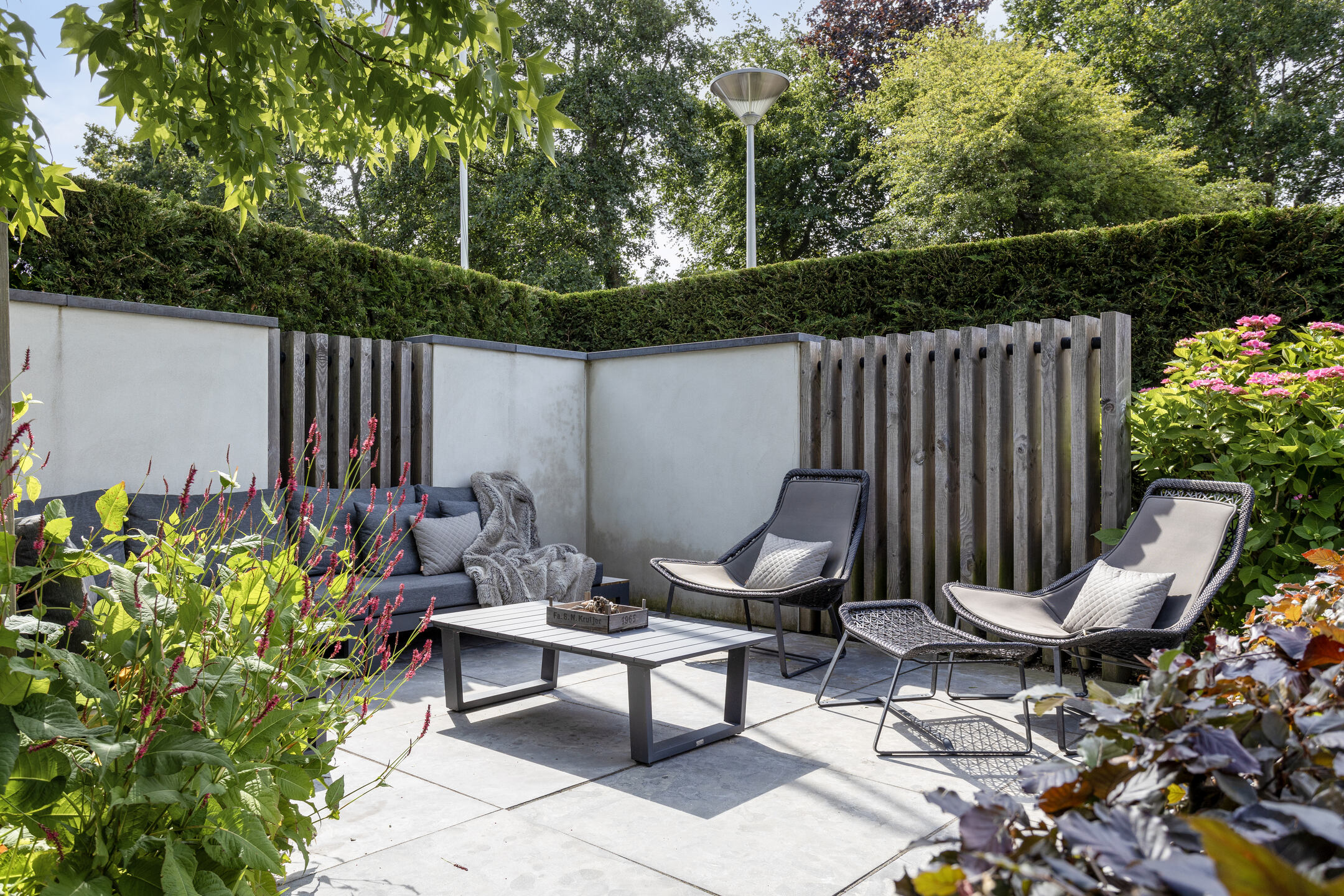 The beautifully landscaped garden has several terraces, grass, planters, flower borders, hedges and an outdoor shower. The spacious terrace facing the living room (Z) has a large sunshade. The garden is surrounded by a beautiful green hedge and can be closed with an electrically operated ornamental fence, which not only provides privacy but also extra security.