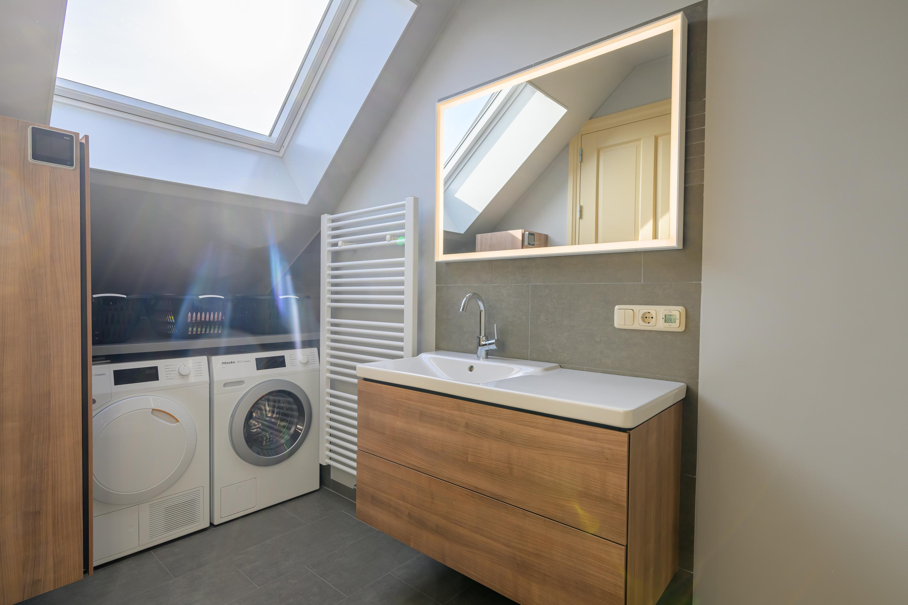 De eerste verdieping is toegankelijk via zowel de binnen- als de buitentrap. Ook hier is de ruimte verdeeld in twee delen. Het ene deel bevat een royale overloop, technische ruimte, zeer ruime slaapkamer en een bergzolder. Aan de andere kant bevindt zich een zelfstandig appartement, compleet uitgerust voor autonoom wonen. Via de buitentrap komen we binnen in een hal met toilet. Vanuit hier bereiken we de royale woon-/eetkamer. Deze is voorzien van een luxe keuken. De badkamer is uitgerust met: een wastafel, inloopdouche en witgoedaansluitingen. De slaapkamer heeft een handige schuifdeurenkast. Ook deze verdieping beschikt over vloerverwarming en profiteert van veel daglicht door de dakramen.