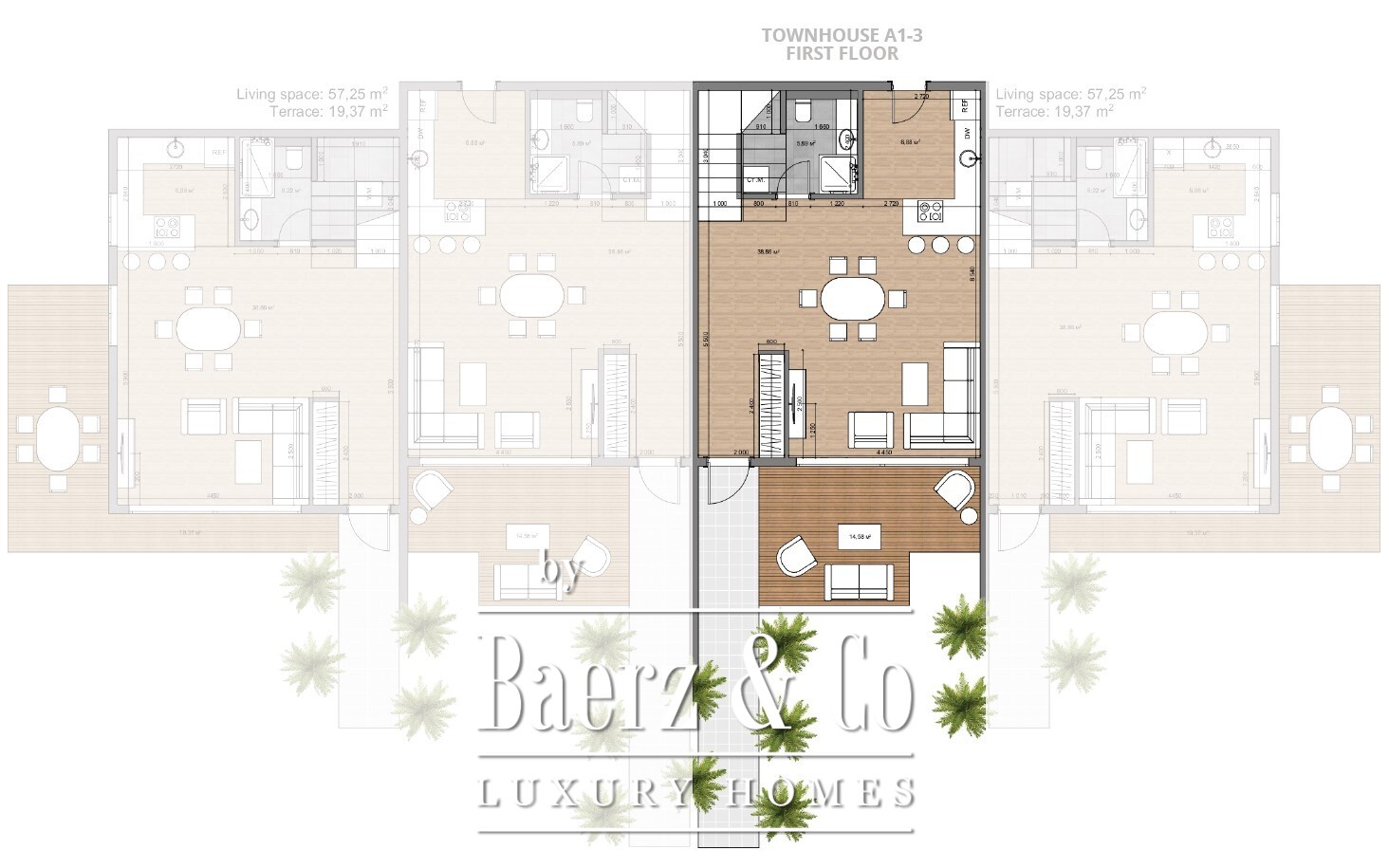 Townhouse with an area of 110 m2 and own plot of 200 sq.m. It consists of living room-kitchen, 2 or 3 bedrooms, 2 bathrooms, 2 terraces and a parking. There are 4 units in one townhouse. Kitchen equipment is included within the price.