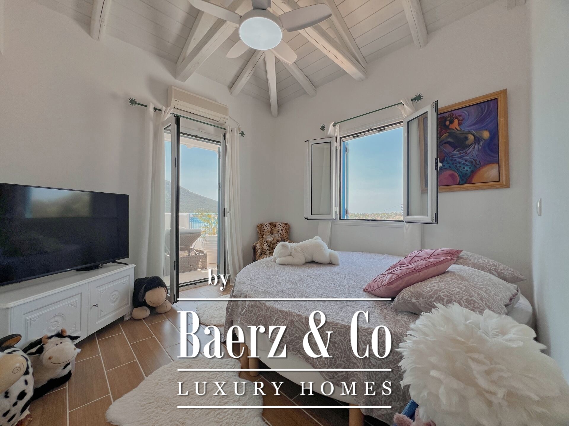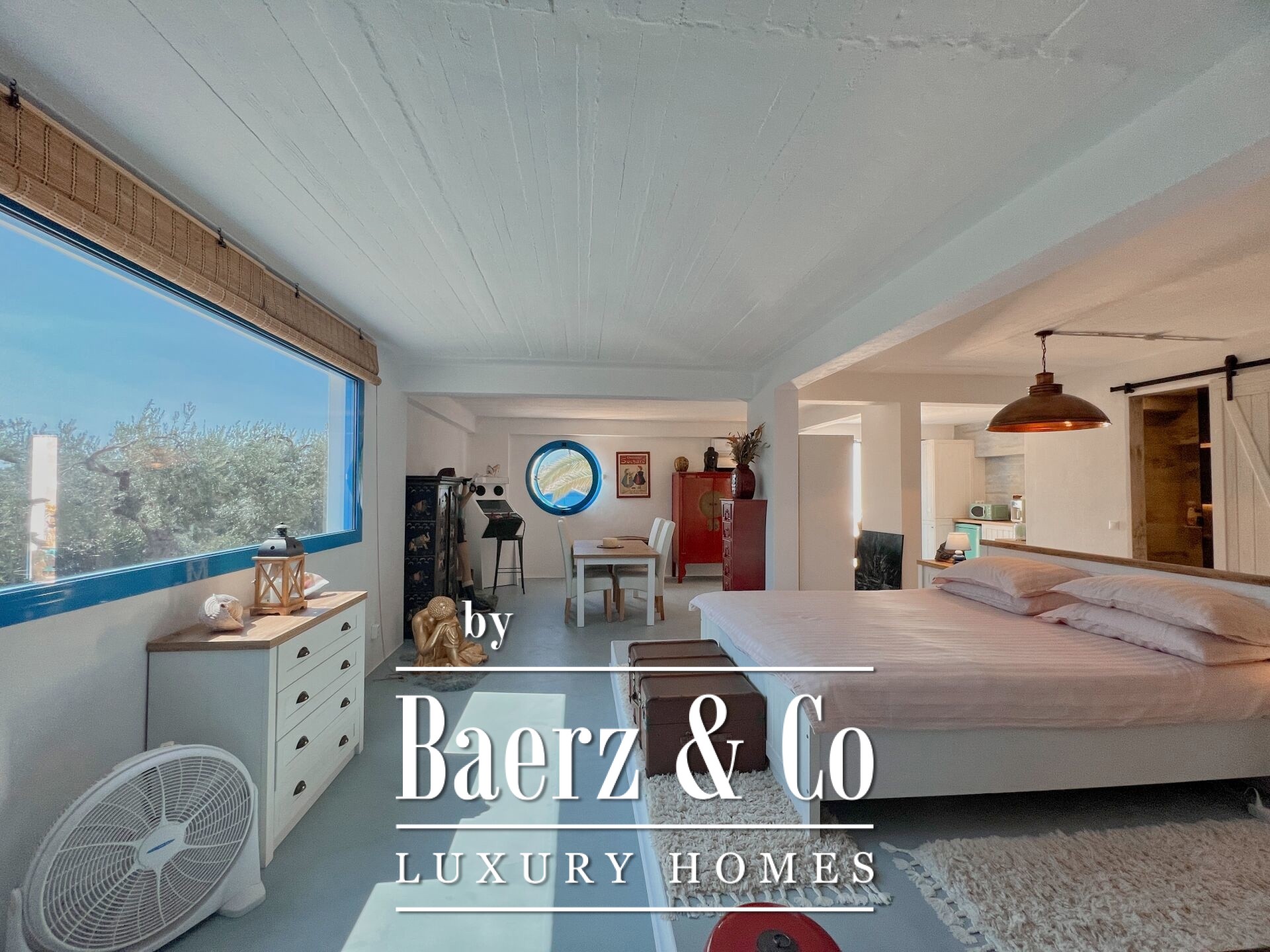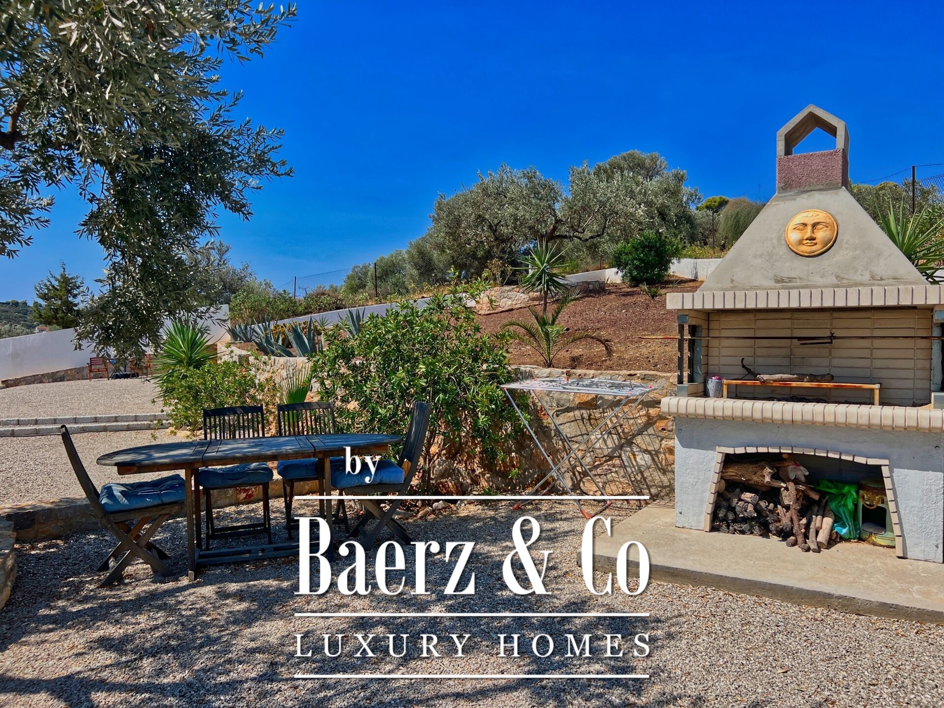Outdoors, mature olive trees settle the house in its landscape. The expansive garden, designed with automatic irrigation, sits beside a sheltered garage, ample storage, a dedicated barbecue, and space for a future pool. Security features such as security door, CCTV, and alarm complement the villa’s sense of discretion. This property is a rare offering for those seeking a villa Kouverta experience defined by privacy, luxury, and the elemental presence of Aegean light.