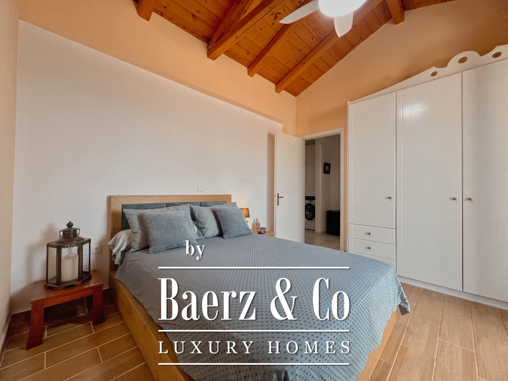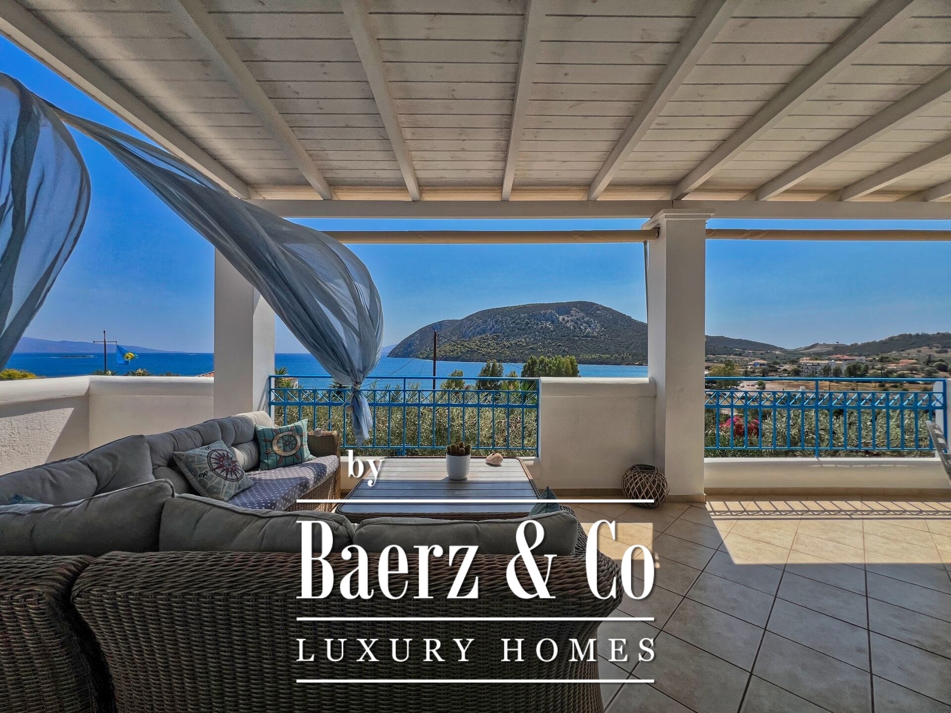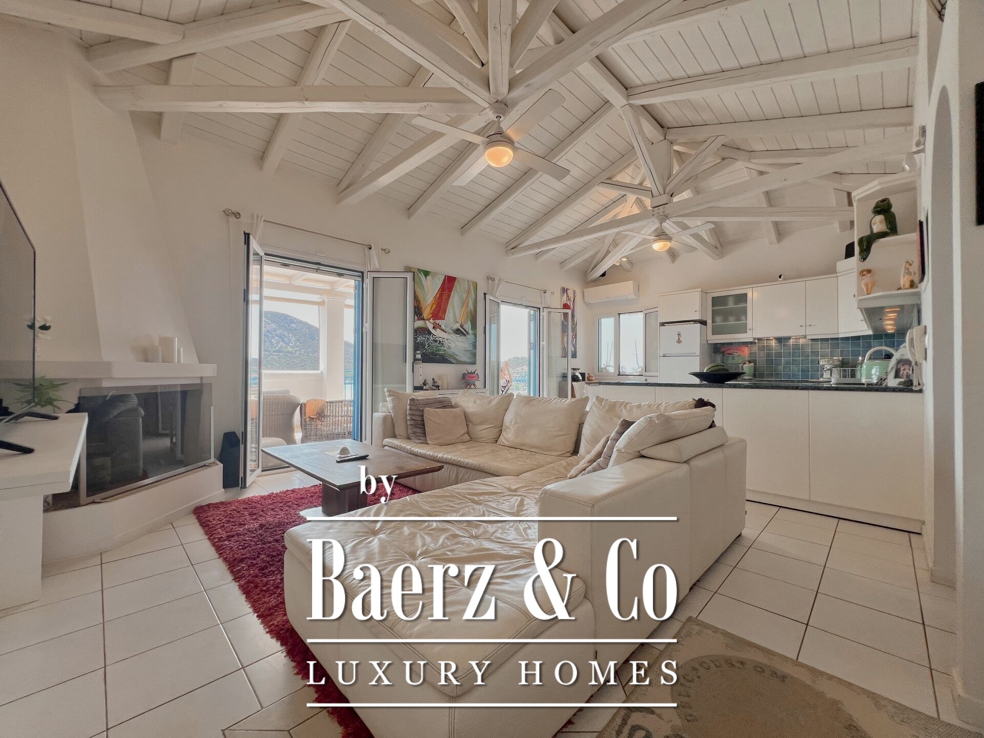 Outdoors, mature olive trees settle the house in its landscape. The expansive garden, designed with automatic irrigation, sits beside a sheltered garage, ample storage, a dedicated barbecue, and space for a future pool. Security features such as security door, CCTV, and alarm complement the villa’s sense of discretion. This property is a rare offering for those seeking a villa Kouverta experience defined by privacy, luxury, and the elemental presence of Aegean light.