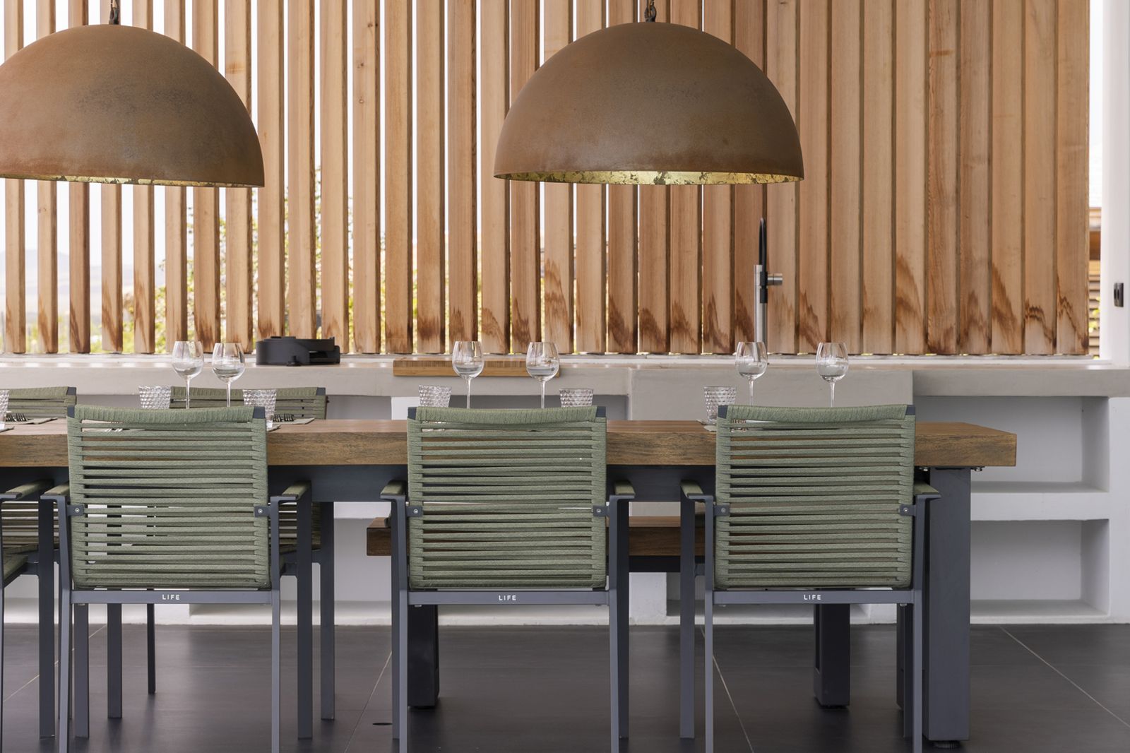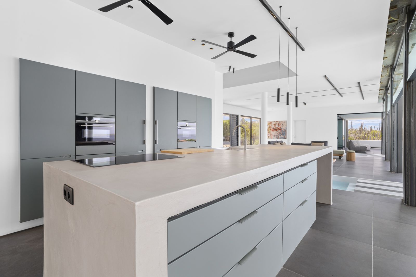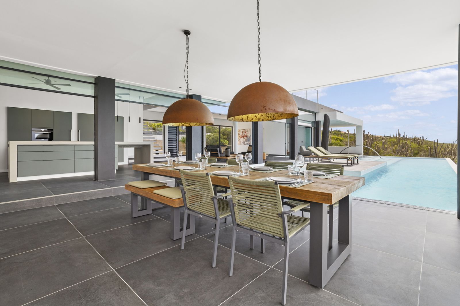 Exemplifying sustainable independence, this property operates fully off-grid, powered by 36 solar panels and a complete Victron battery system. The outdoor setting is equally compelling: an infinity pool measuring nearly 19 meters, with an impressive 116m² surface, stands as one of the largest private pools on Bonaire. Multiple terraces, an outdoor kitchen equipped with Green Egg and wok burner, cold storage, and dedicated dive gear facilities expand the possibilities for both leisure and entertaining.