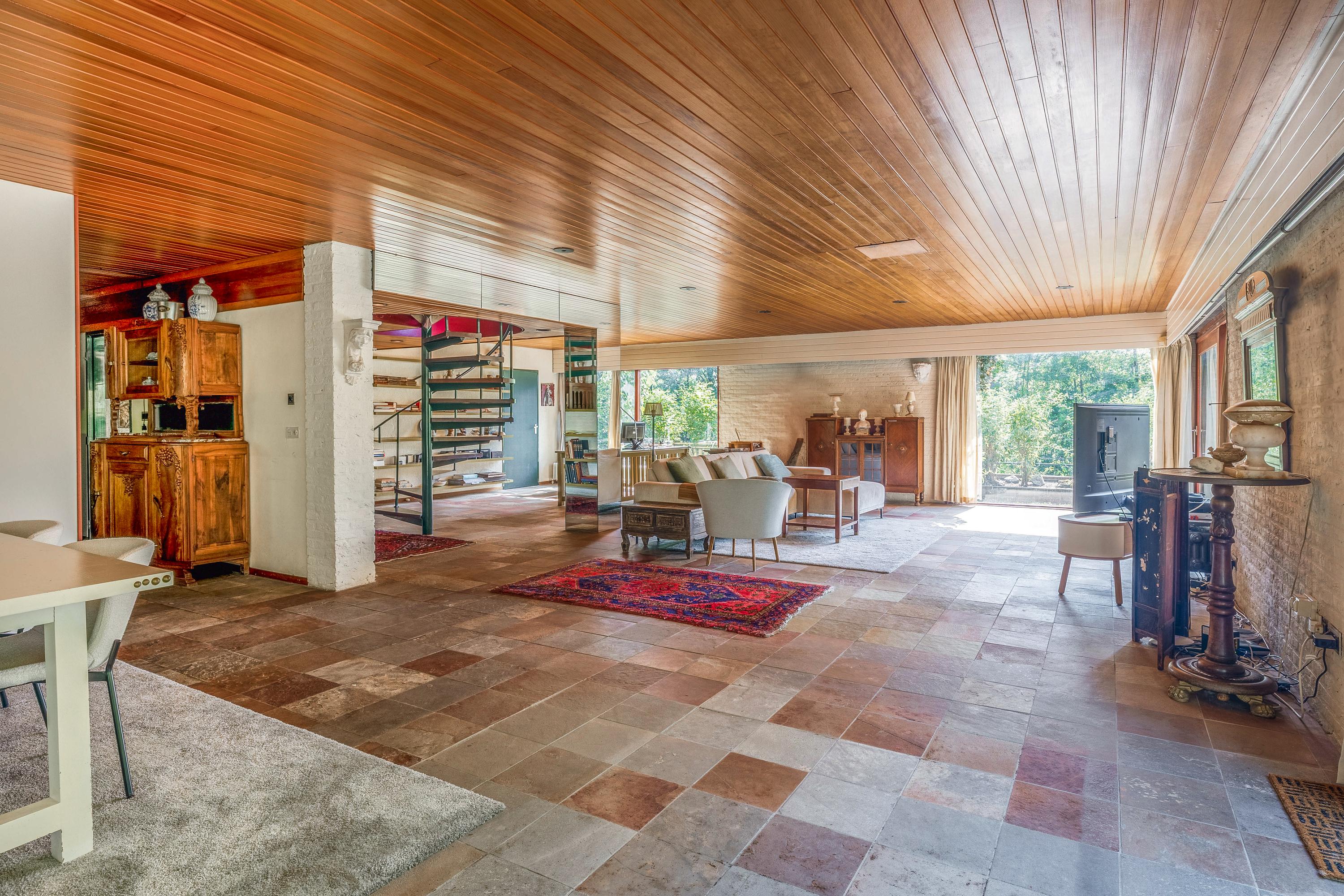 Inside, you’ll find a spacious, garden-oriented living room with large windows that bring in lots of light and offer views of the surrounding greenery. The warm atmosphere and generous layout provide plenty of options for different interior arrangements to suit your personal living style. The adjacent open-plan kitchen is roomy and forms the heart of the home.