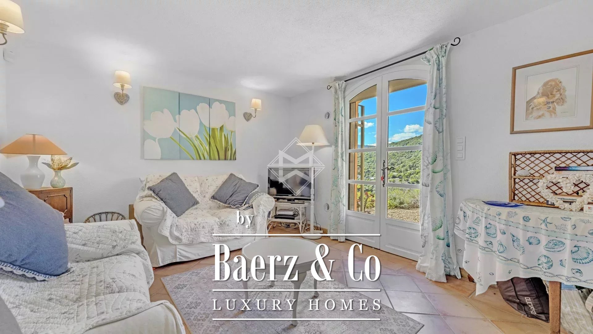 The 2300sqm plot ensures complete privacy and includes a pétanque court, meticulously maintained Mediterranean plants, an 8x4 m swimming pool, double garage and multiple parking spaces, electric gate with intercom, automatic irrigation system, outdoor lighting, and mains drainage.