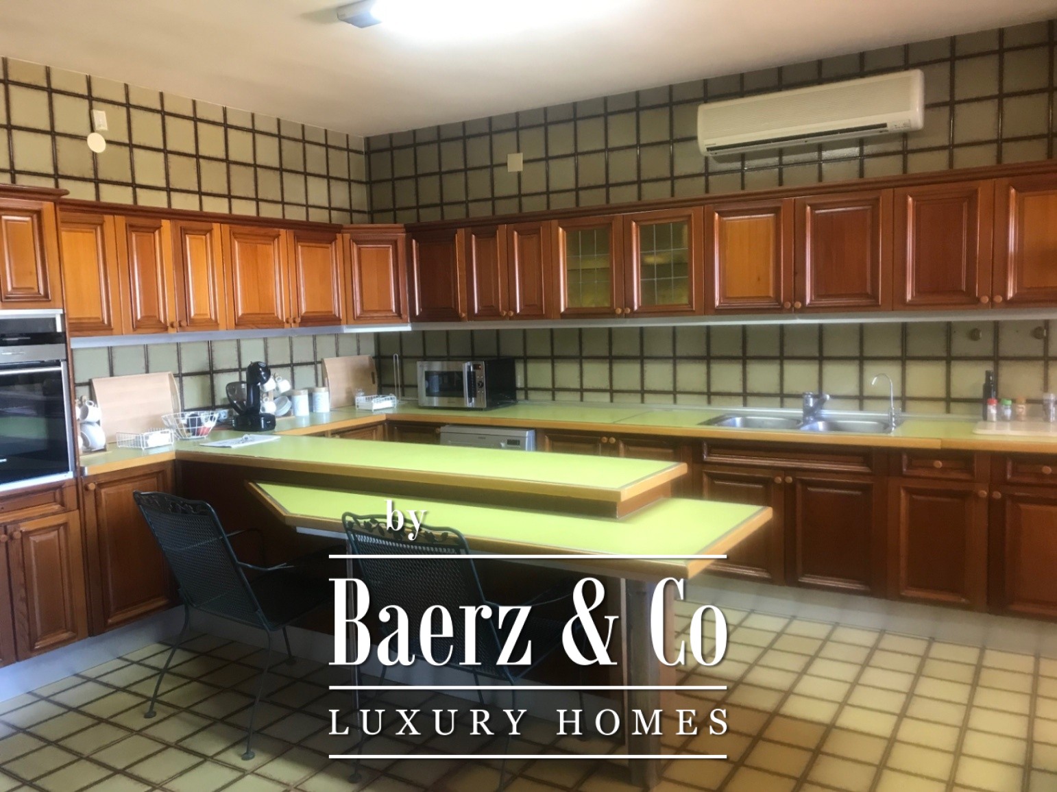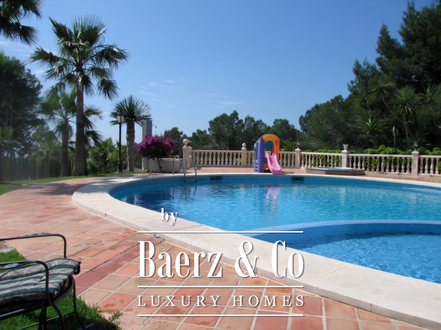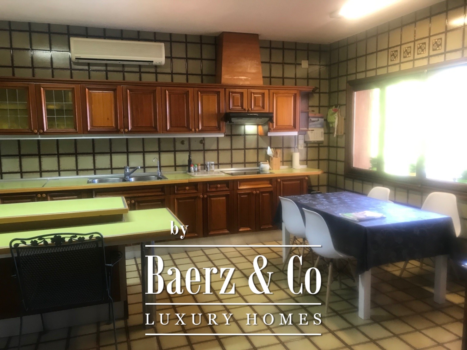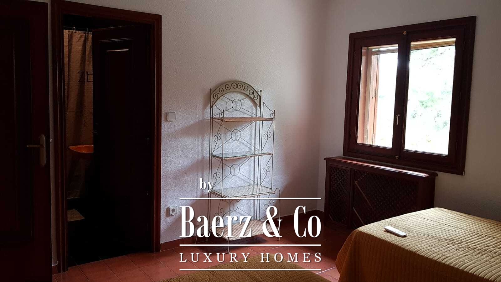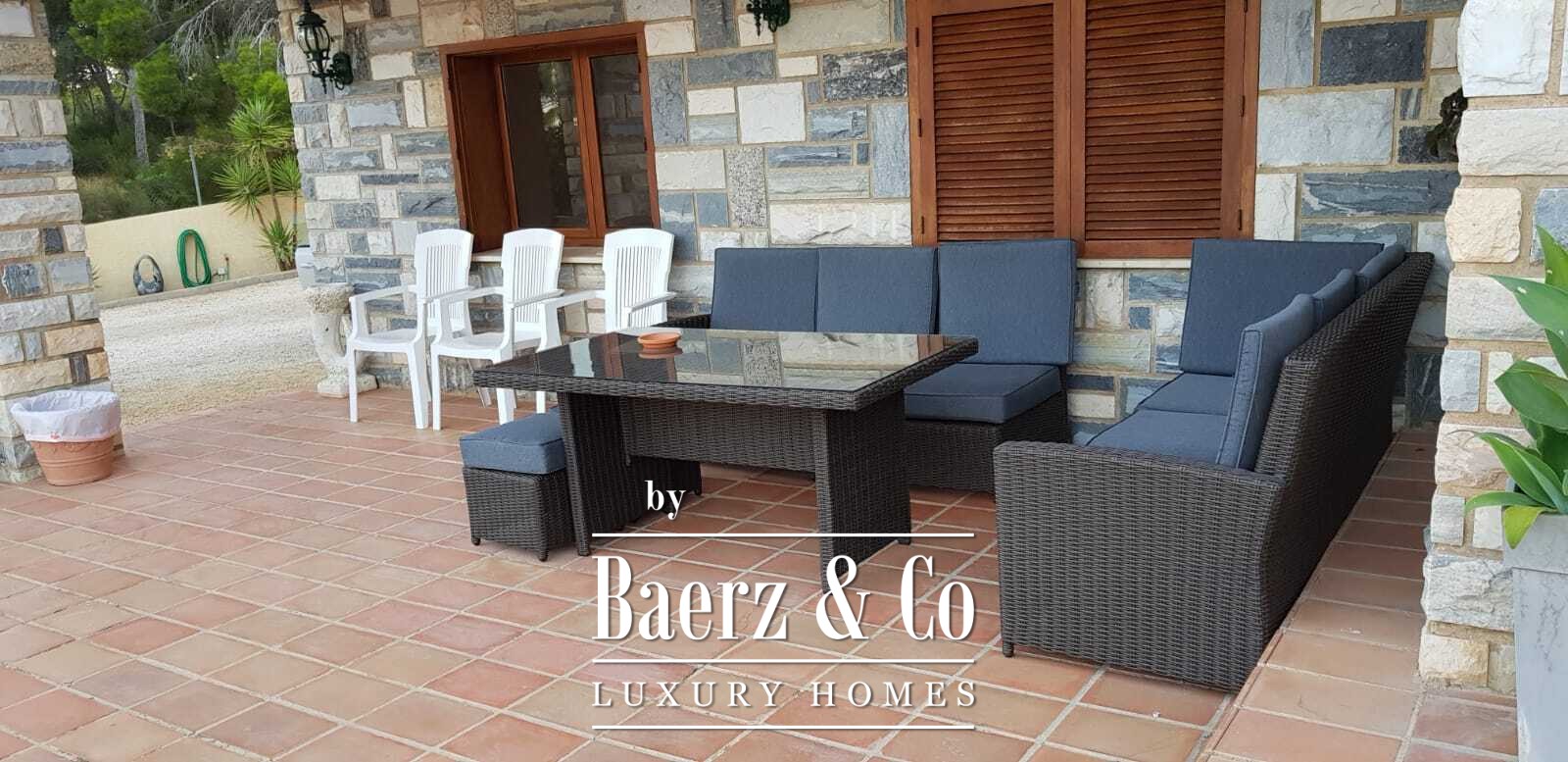 Inside, the layout flows around four generously proportioned double bedrooms and five full bathrooms, with an additional guest toilet for convenience. The main living area, a 100 m² expanse, moves seamlessly into a spacious kitchen and dining area, creating a natural rhythm for gatherings and quiet moments alike. The villa opens towards mature gardens and a swimming pool with a designated children’s area, further complemented by open and covered terraces for year-round enjoyment.