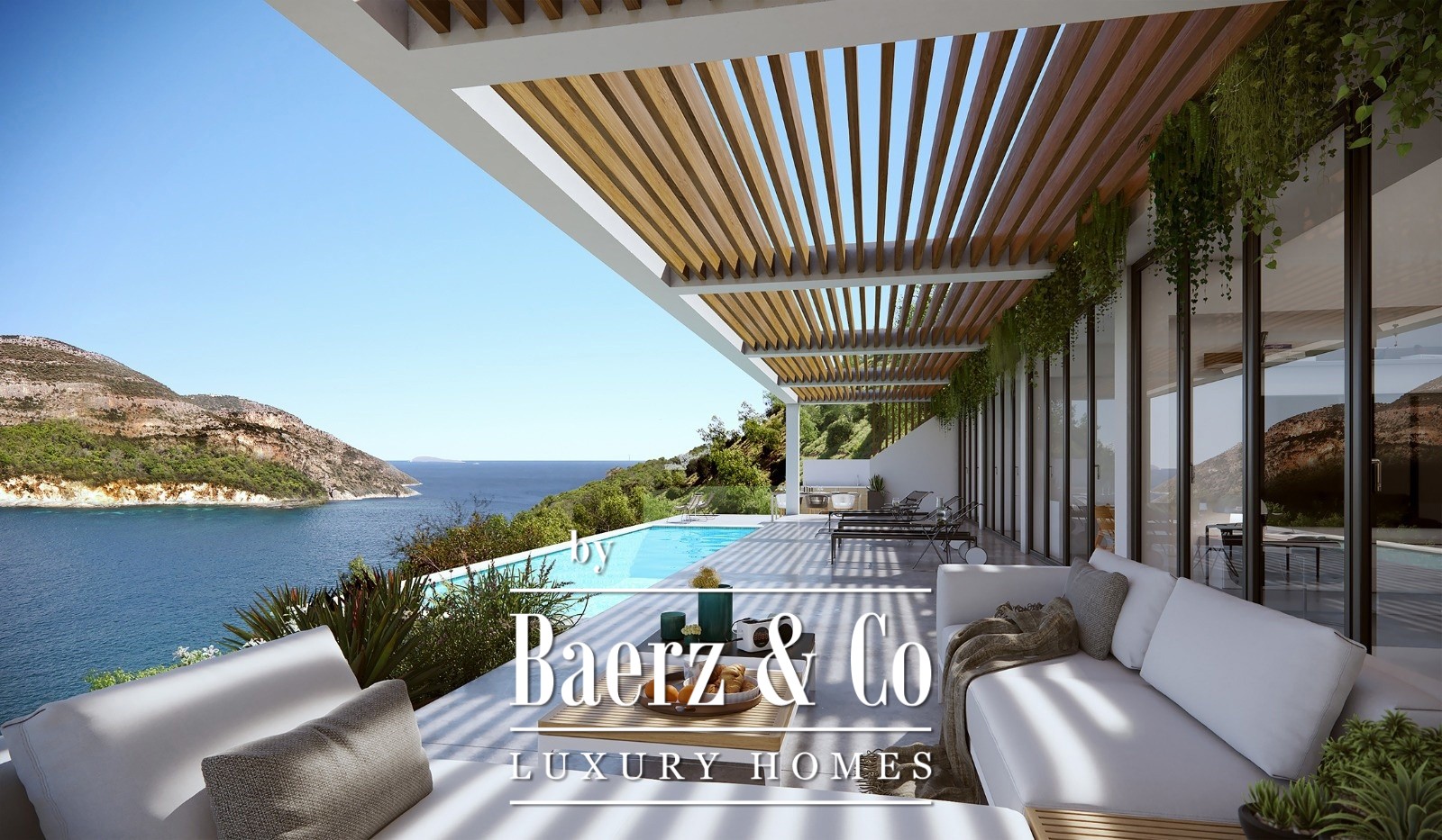 Outdoors, a private swimming pool anchors views of the Ionian Sea, the mountains, and a verdant natural panorama. The atmosphere is open and serene, ideal for a holiday retreat that celebrates nature’s pace and the luxury of well-resolved architecture. This luxury villa for sale in Lefkada balances the calm of the coastline with the security and elegance of true contemporary living.