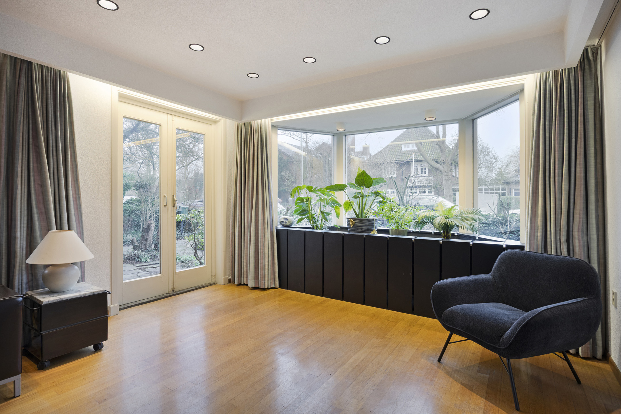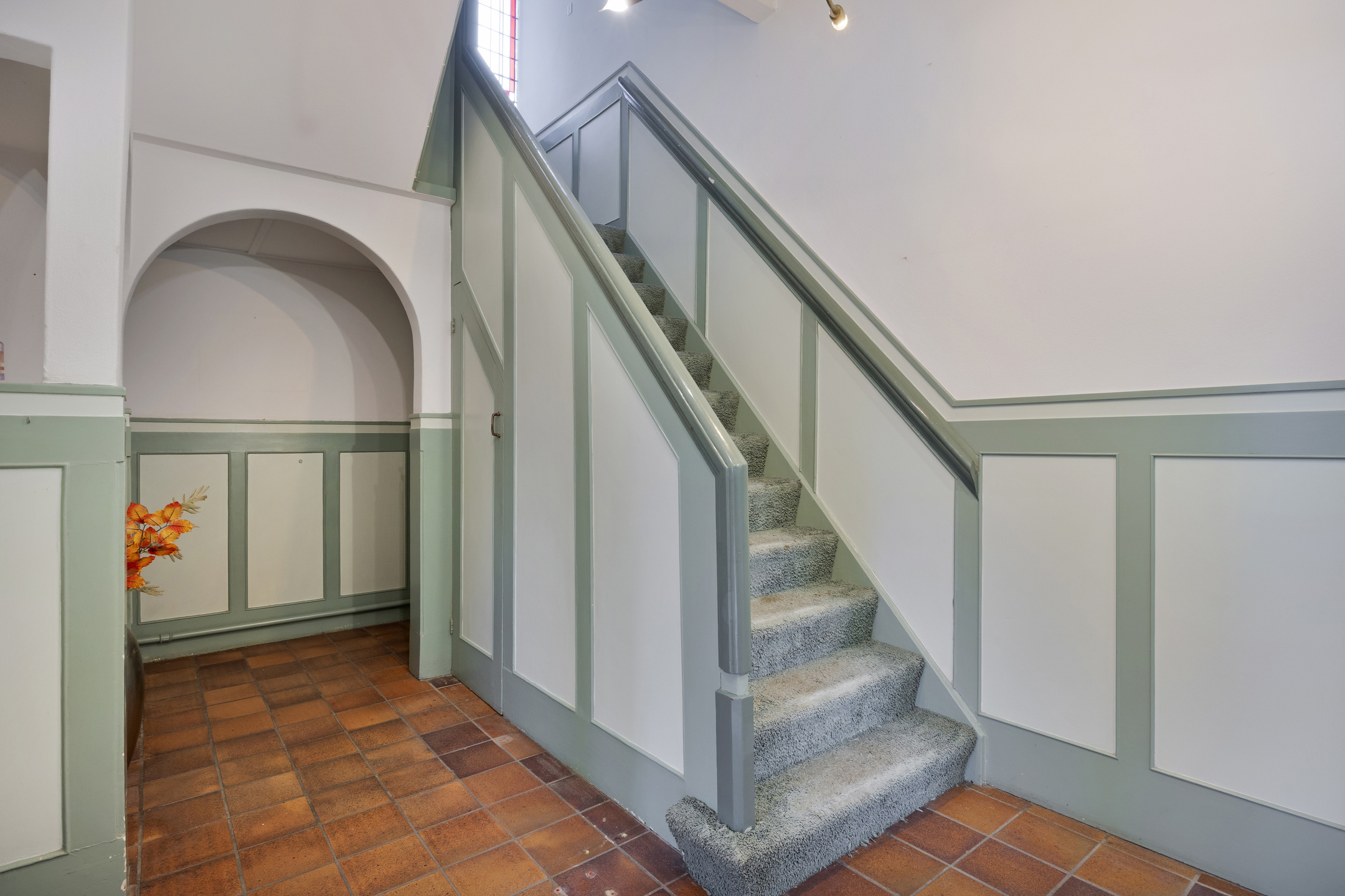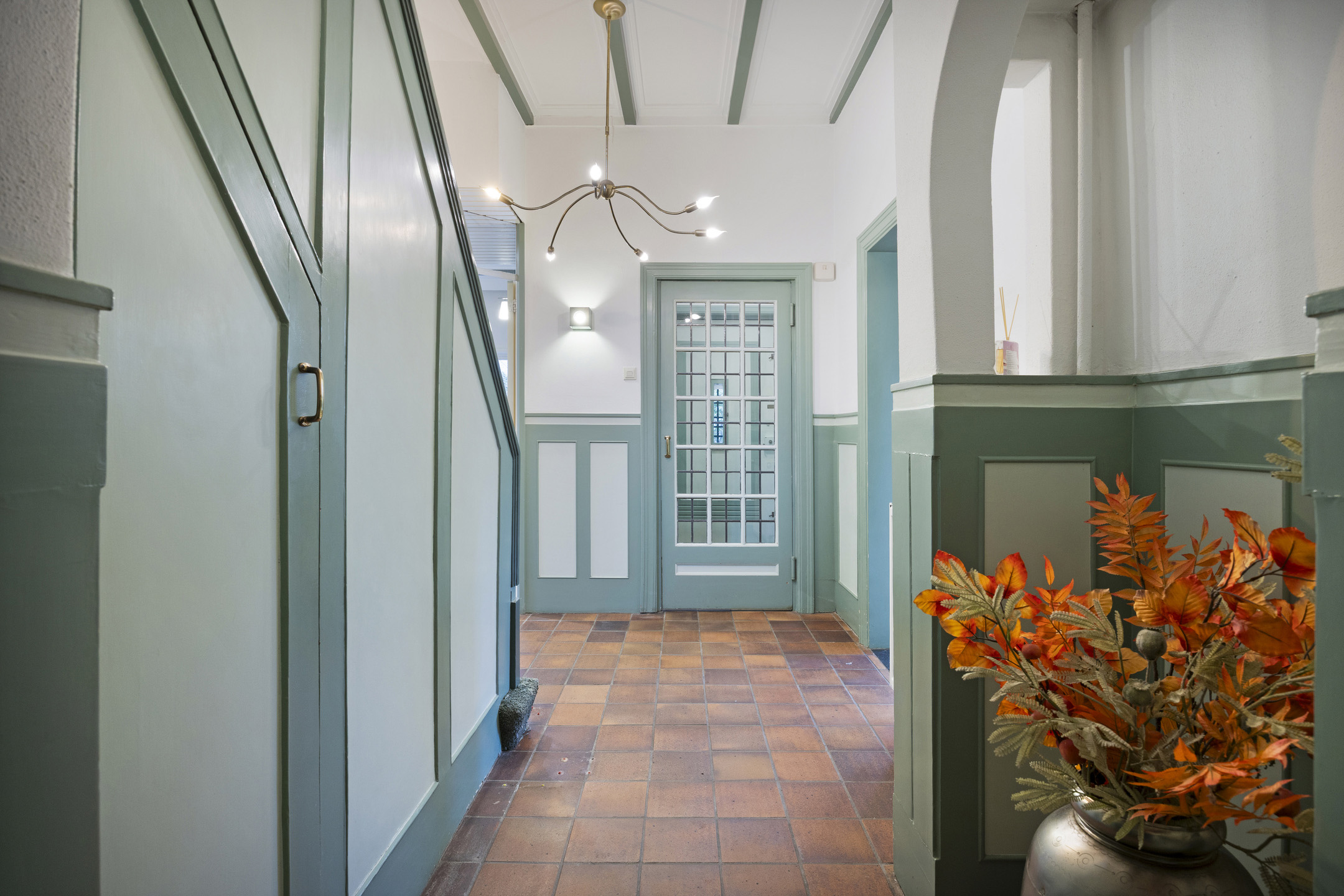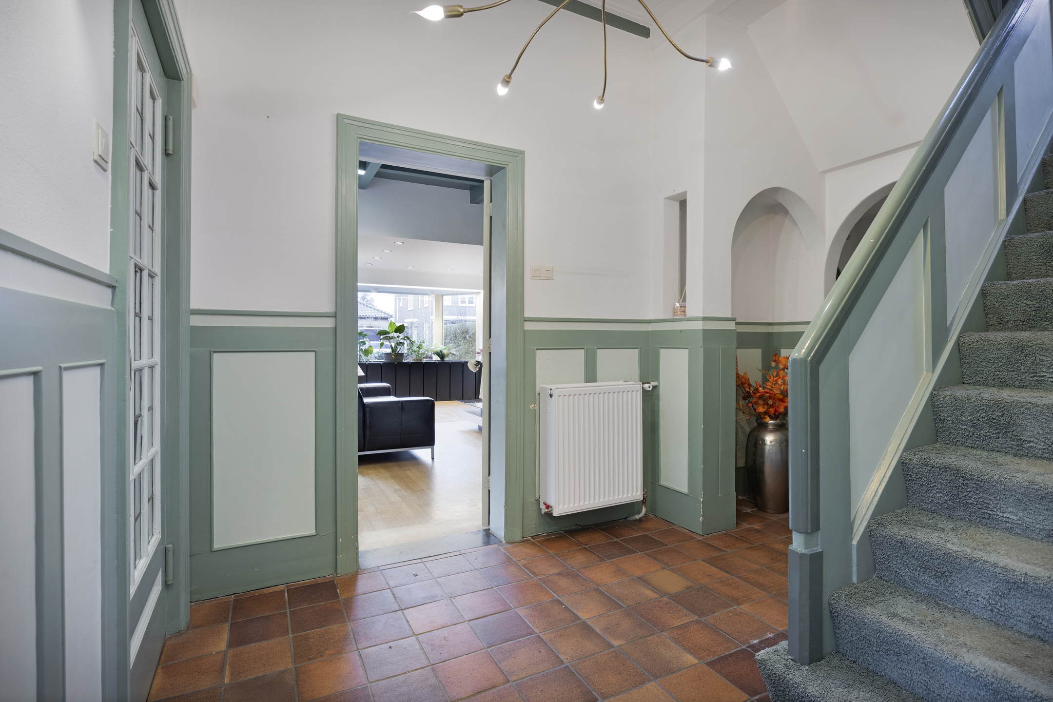 Na binnenkomst via de entree kom je in de centrale hal. De bordestrap, het glas-in-lood en de panelen vormen het statige hart van de woning en verbinden alle vertrekken en verdiepingen met elkaar. Aan de voorzijde ligt de L-vormige woonkamer met aan de ene zijde een zitgedeelte met haard en openslaande deuren naar de tuin en aan andere zijde plaats voor bureau, tv-hoek of formal dining.