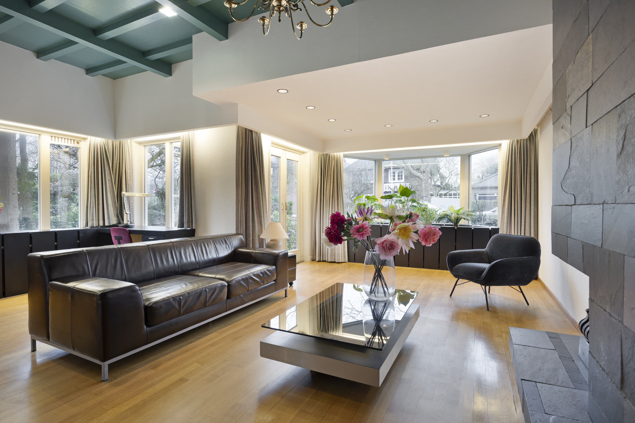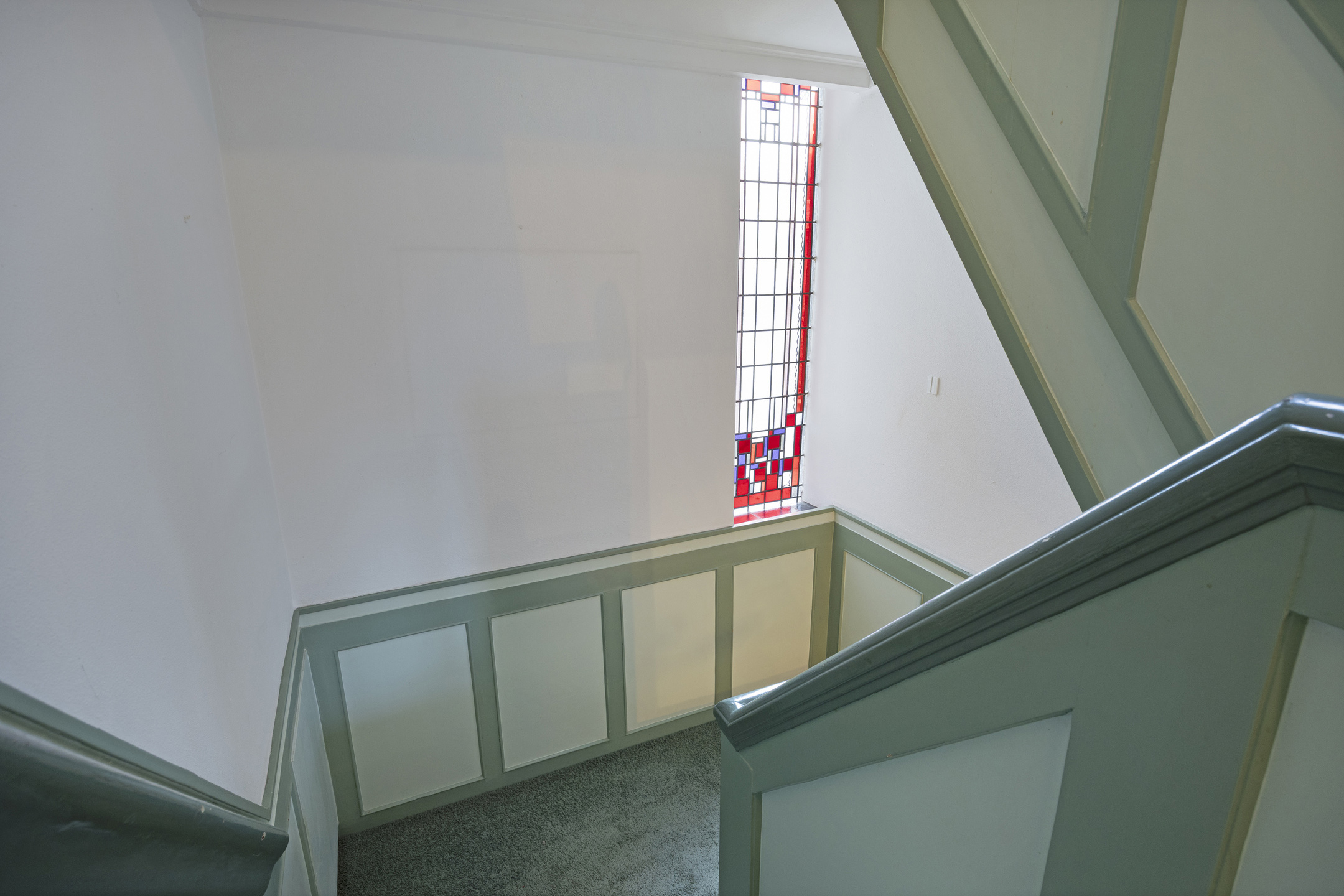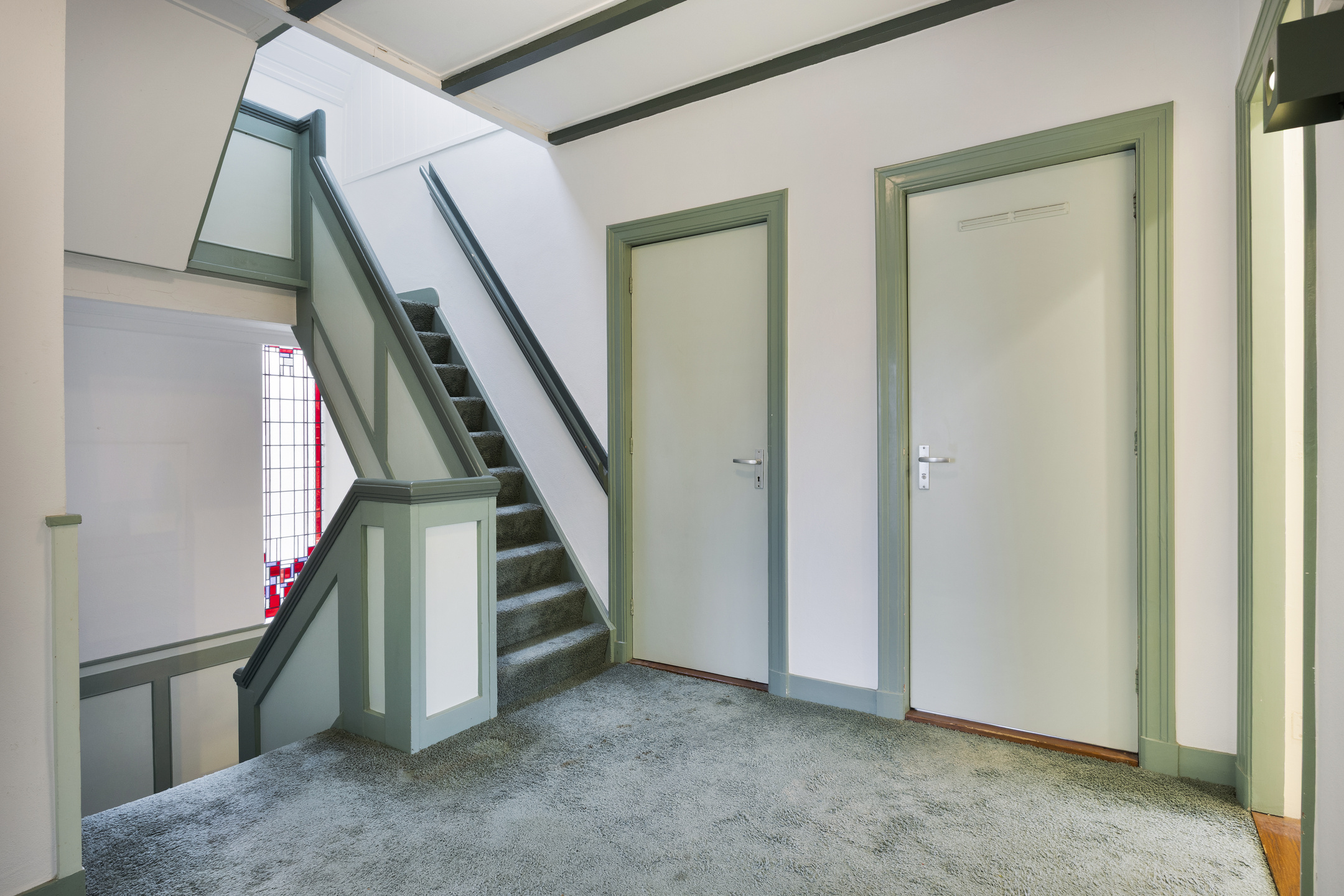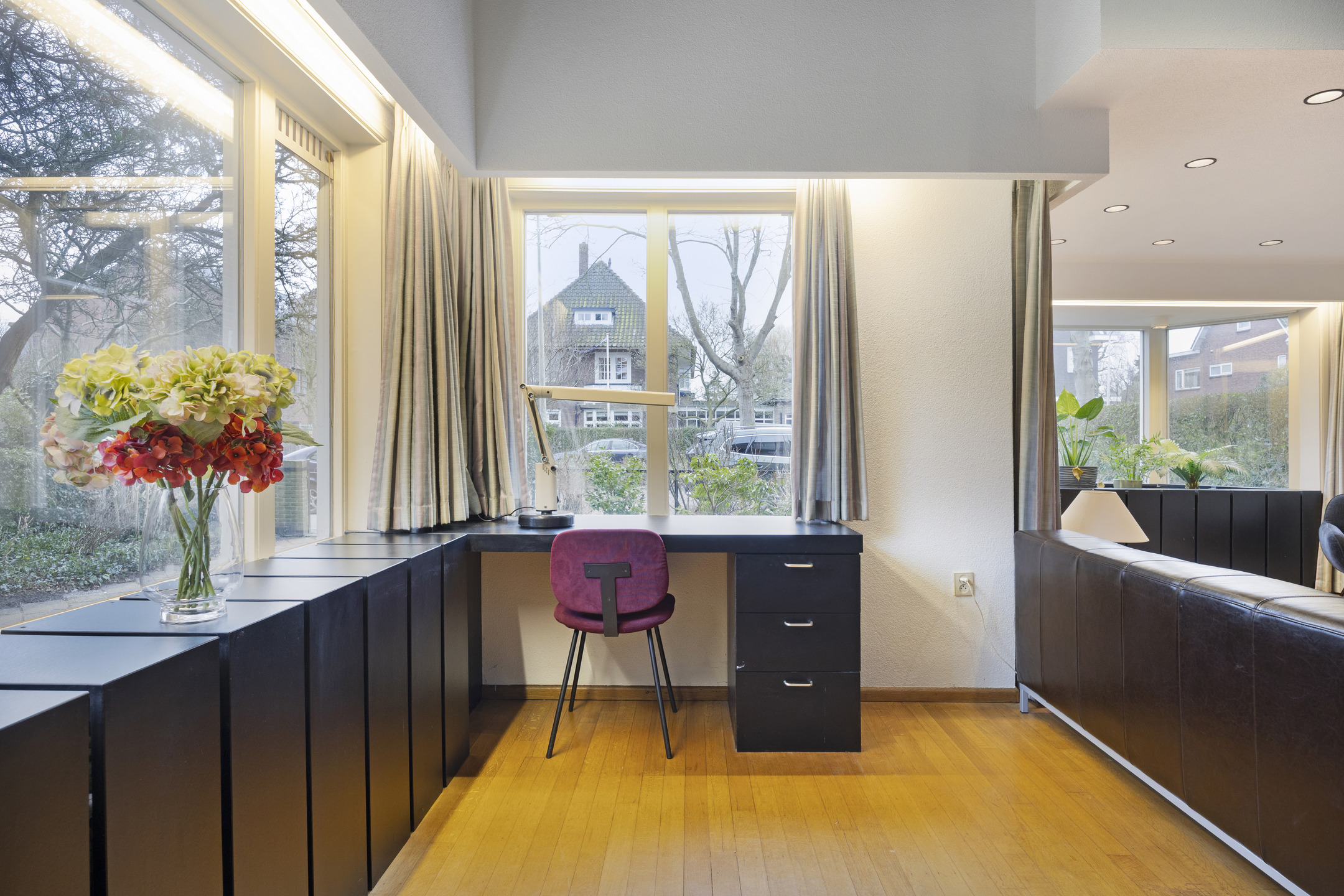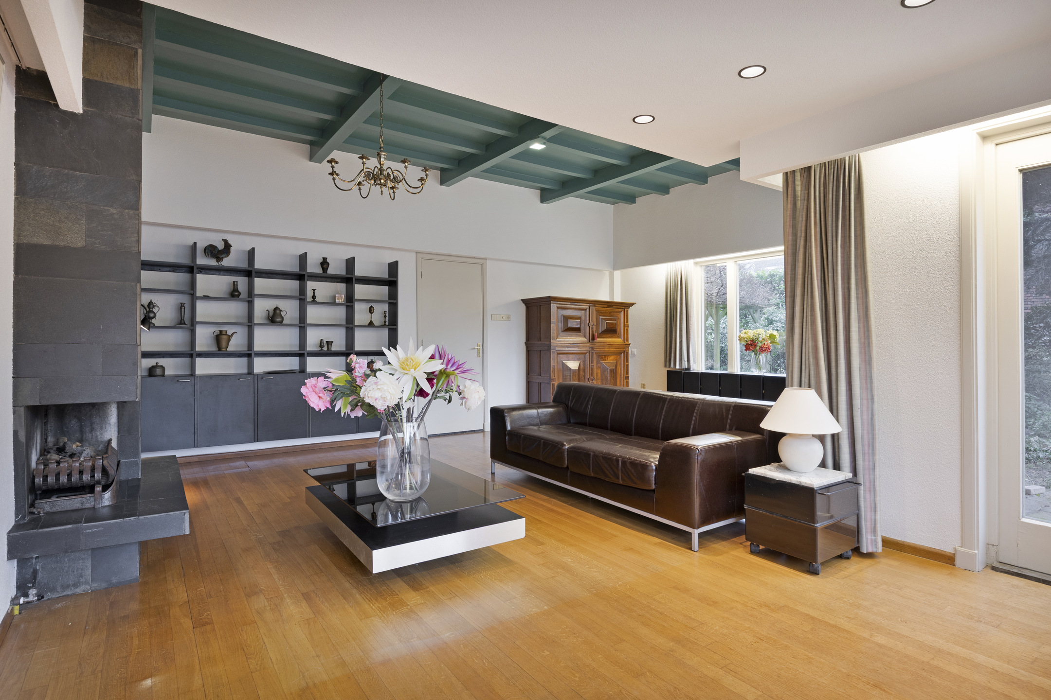 Na binnenkomst via de entree kom je in de centrale hal. De bordestrap, het glas-in-lood en de panelen vormen het statige hart van de woning en verbinden alle vertrekken en verdiepingen met elkaar. Aan de voorzijde ligt de L-vormige woonkamer met aan de ene zijde een zitgedeelte met haard en openslaande deuren naar de tuin en aan andere zijde plaats voor bureau, tv-hoek of formal dining.