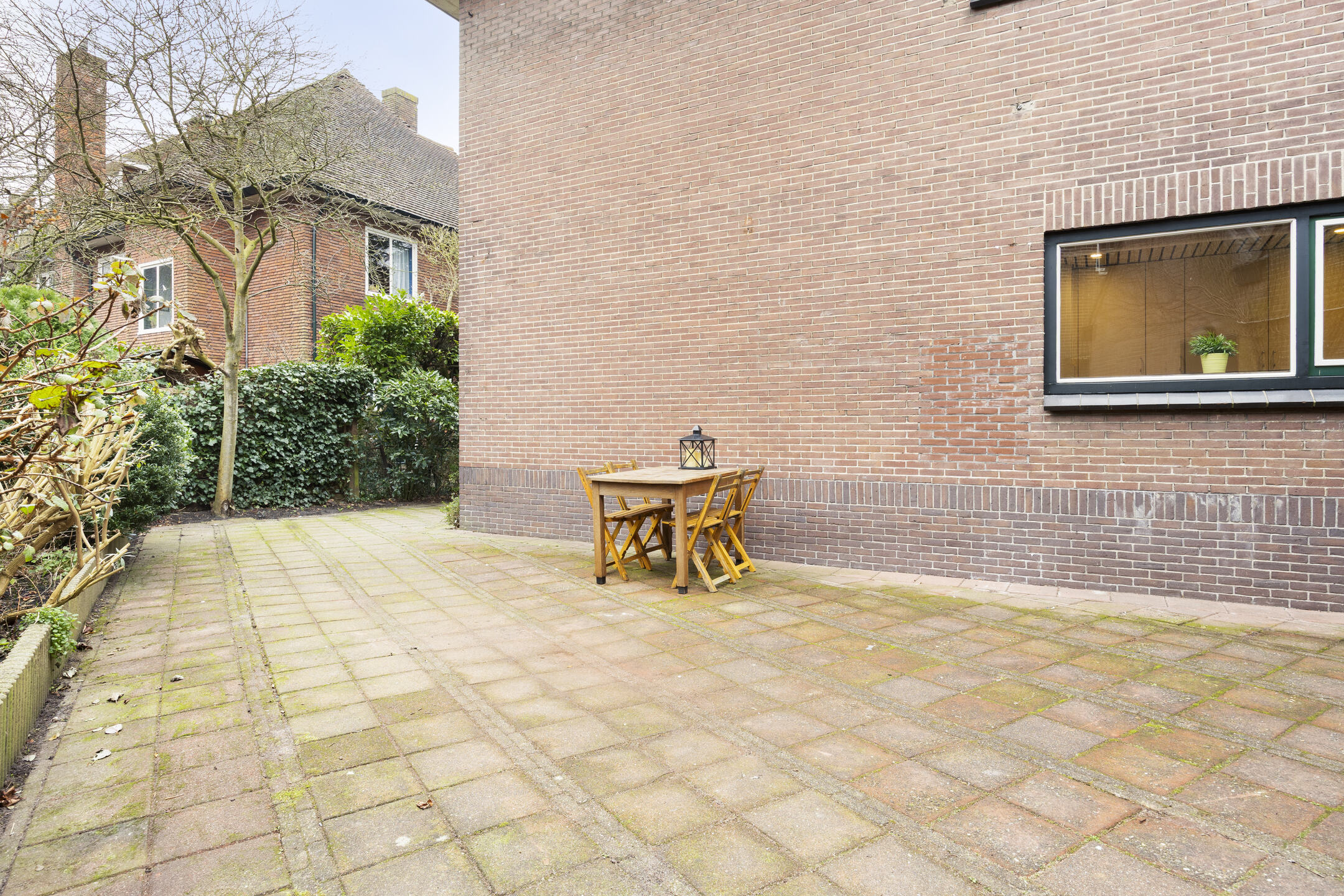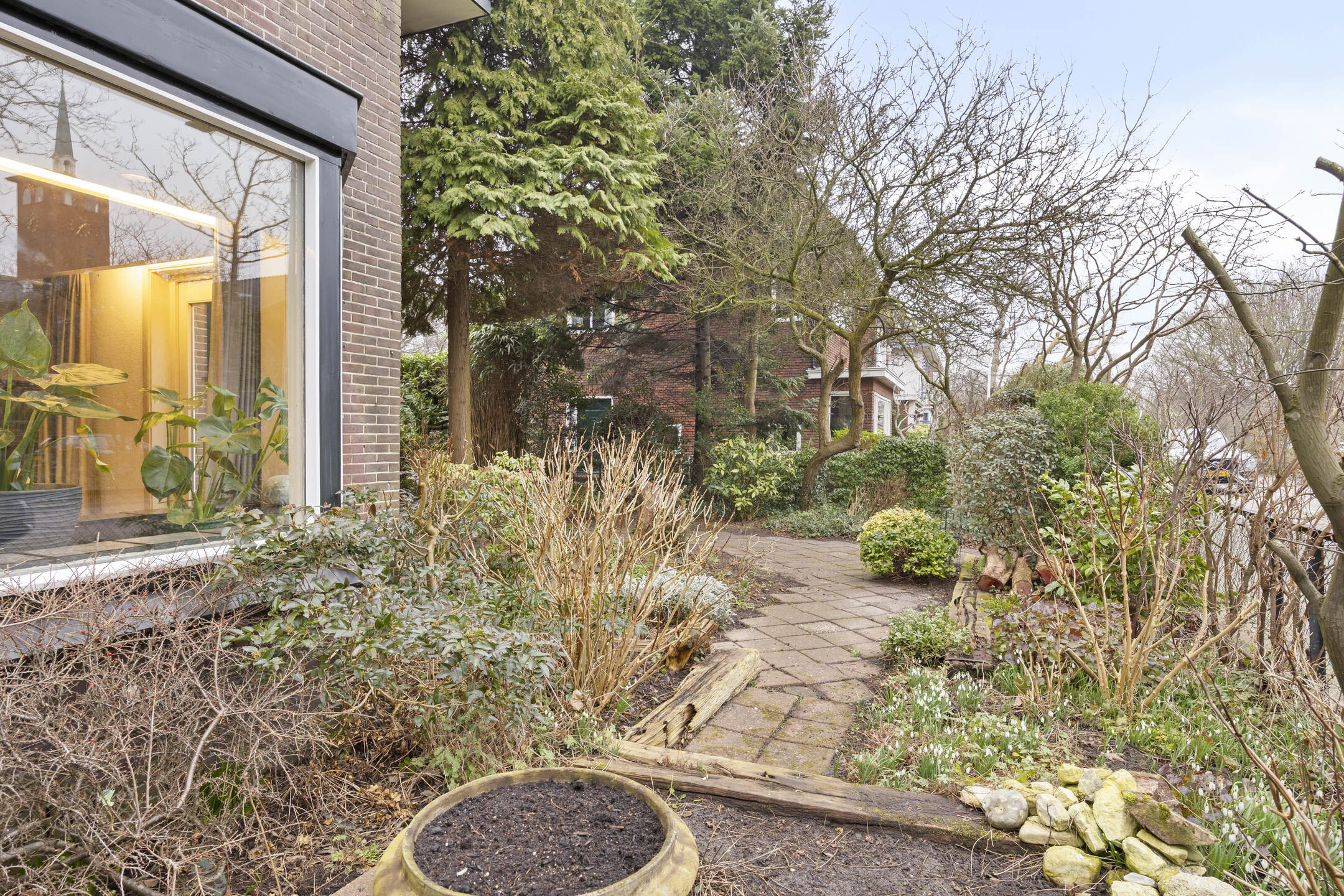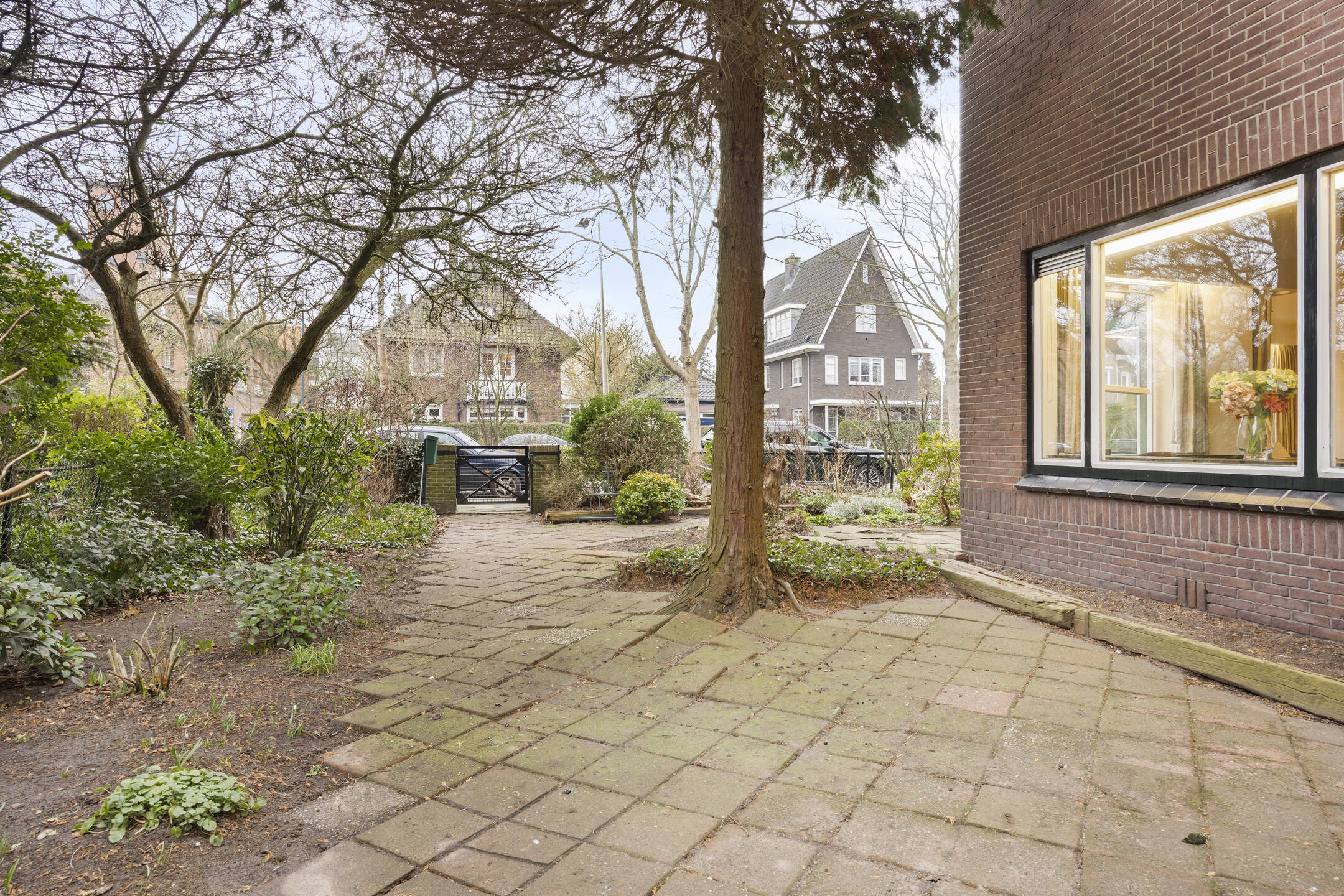 De woning ligt op een ruim perceel met aan drie zijden tuin, waarmee de mogelijkheid wordt geboden om op elk moment van de dag te genieten van de zon of juist de schaduw. De openslaande deuren vanuit de woonkamer, de deur vanuit de keuken, de achterdeur van de bijkeuken en de deur vanuit de garage verbinden huis en tuin vanuit alle vertrekken op de begane grond.