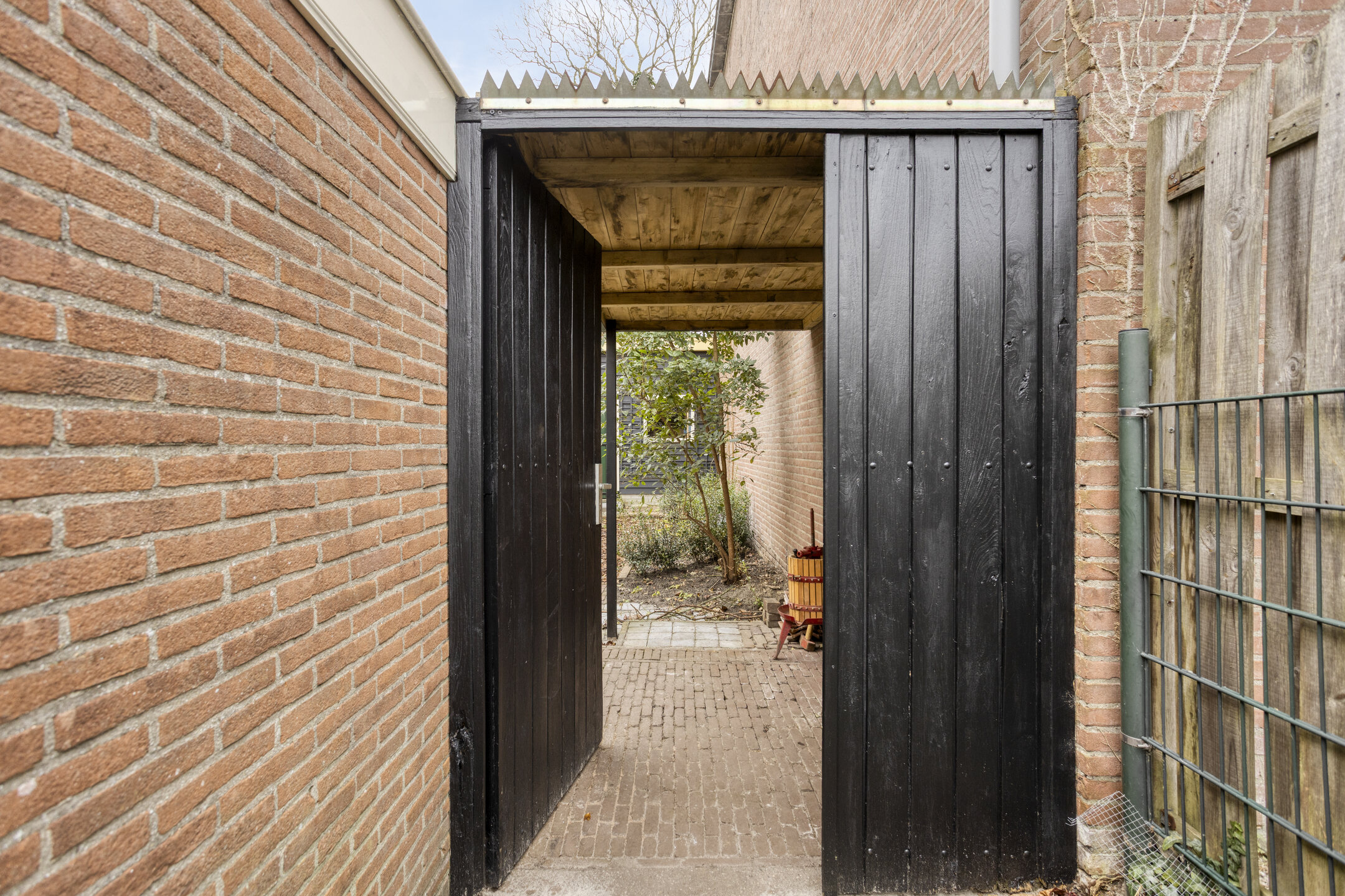 Achtertuin met veel privacy, schuur, fietsenberging en achterom aan twee zijden.
