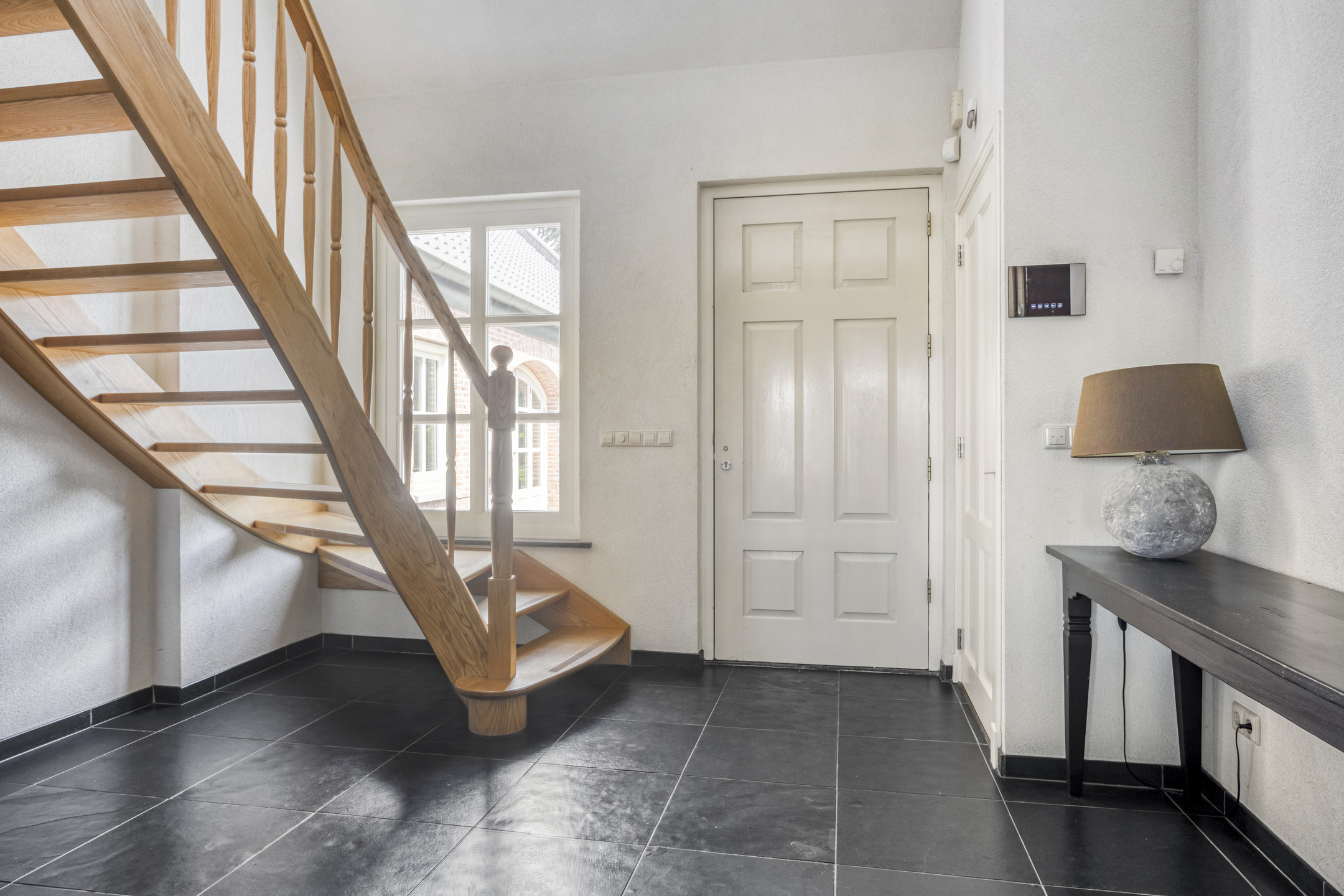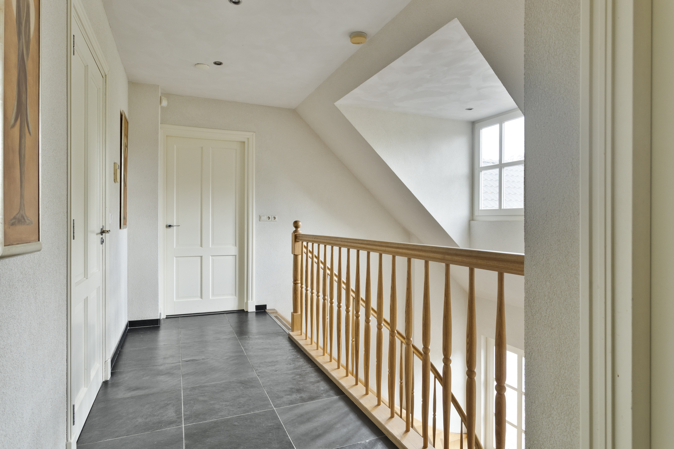 Overloop, wandafwerking sierpleister, natuurstenen vloer, schuurwerk plafond;