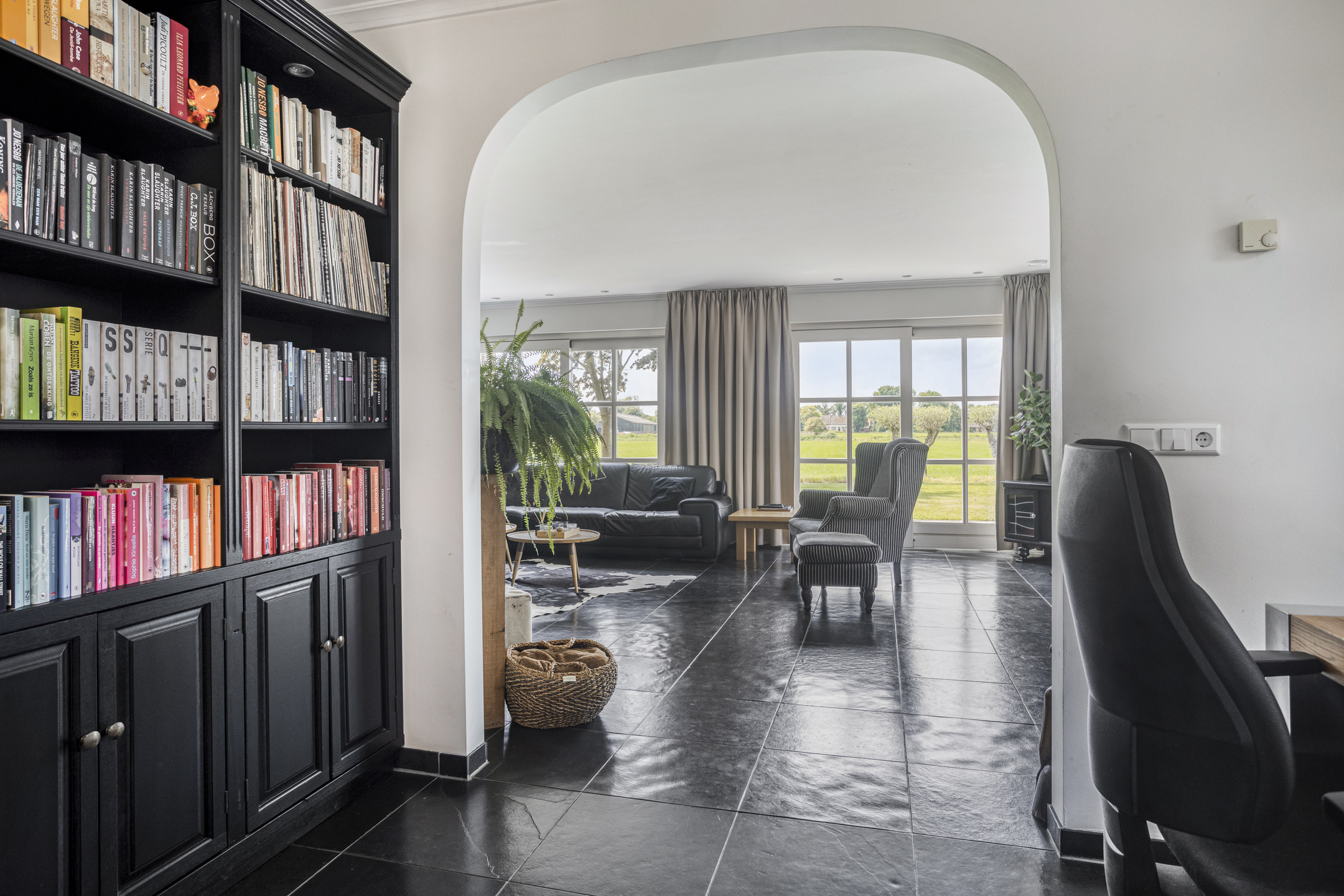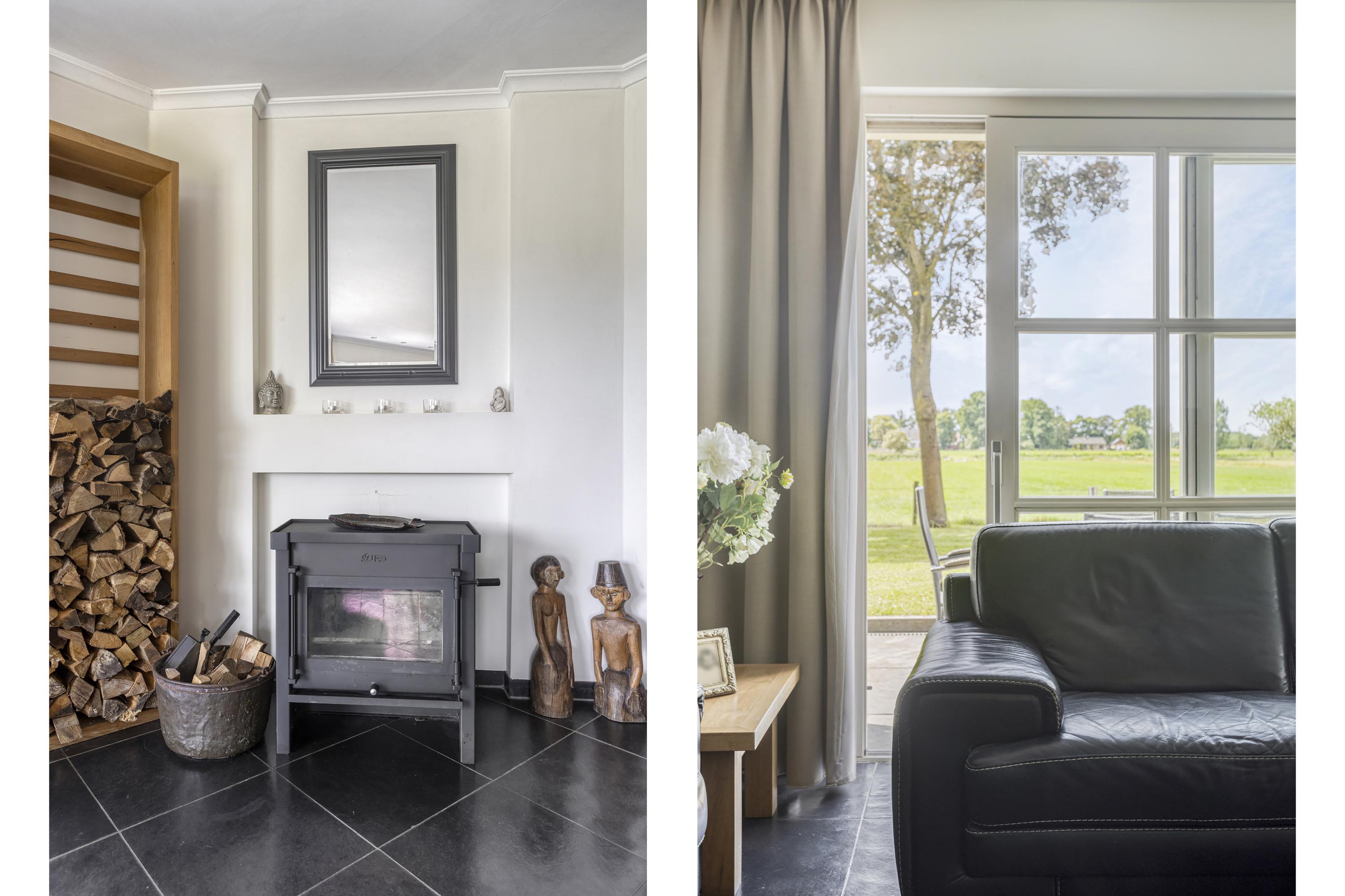 woonkamer (ca. 75 m² incl. keuken en werkhoek) voorzien van een drietal schuifpuien, houthaard en een werk-/leeshoek met inbouwkastenwand, wandafwerking stucwerk, natuurstenen vloer, plafond afgewerkt met stucwerk vv. inbouwspots;