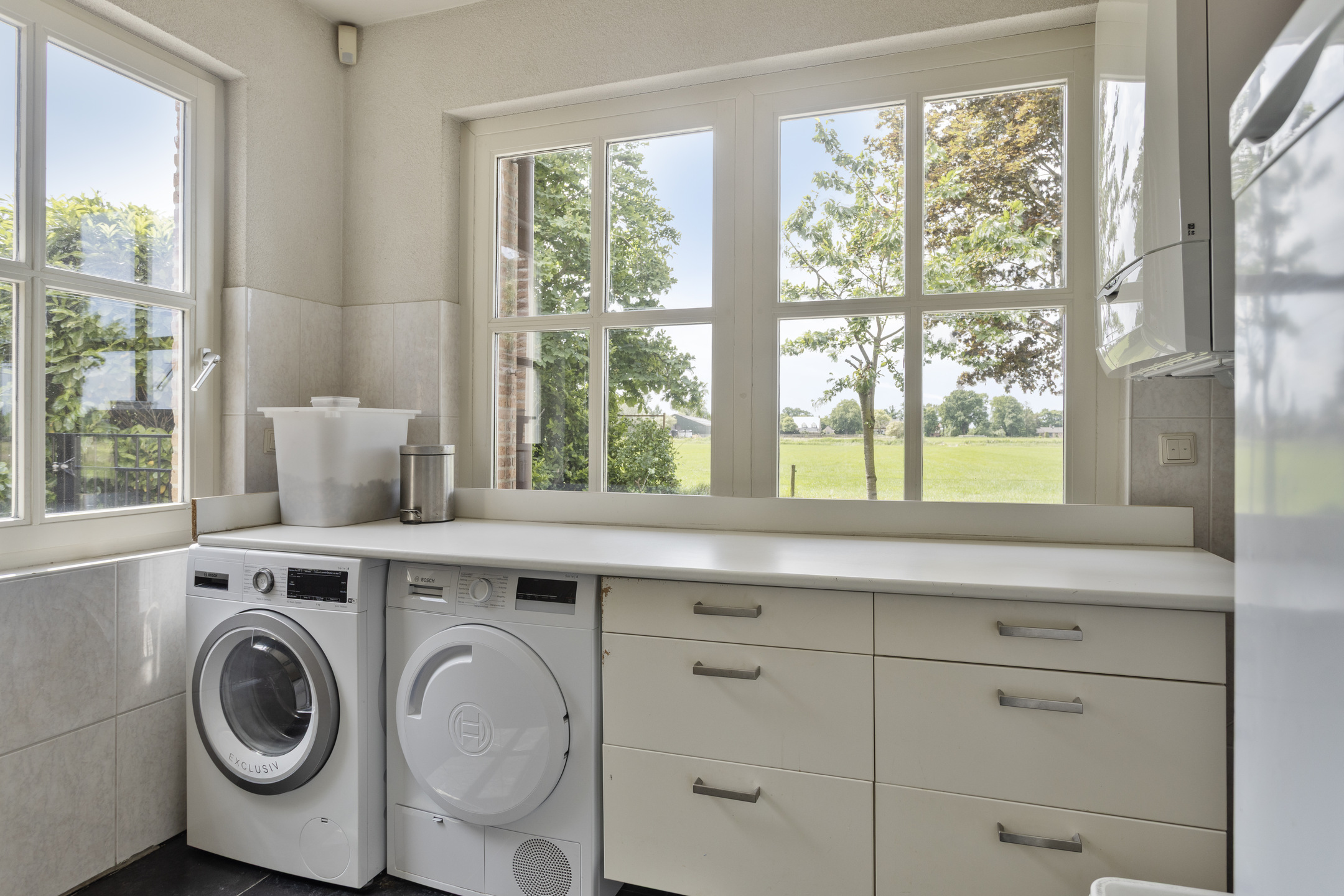 bijkeuken met wasmachine-/drogeraansluiting, unit vloerverwarming, wandafwerking sierpleister, natuurstenen vloer, plafond afgewerkt met stucwerk;