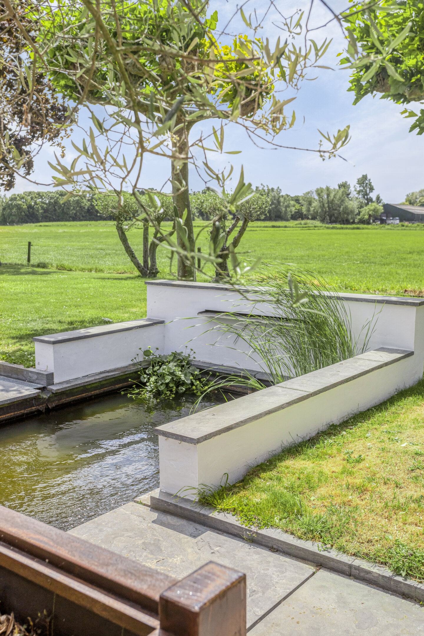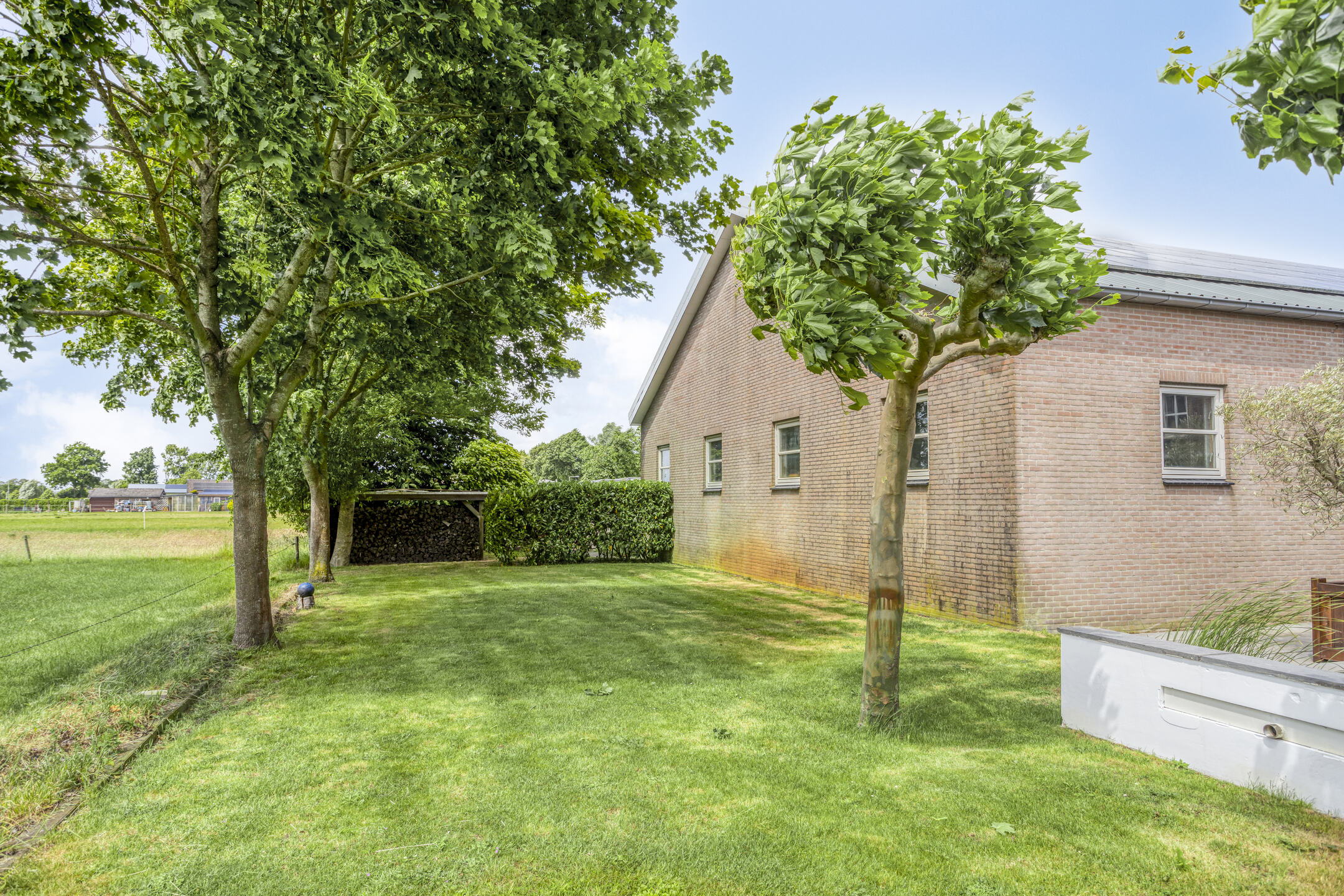 Aangelegde tuin rondom, terras bestraat met natuursteen, voorzien van een veranda tussen woning en loods, borders, gazon, vijverpartij, vrij uitzicht over de landerijen, vrij pad langs de woning t.b.v. achterom, lange oprijlaan overlopend in voorterrein als aangelegd met gebakken klinkers vv. straatkolken, deels betonklinkers en een groen plein, grotendeels omheind vv. elektrische poort met beeldcamera.