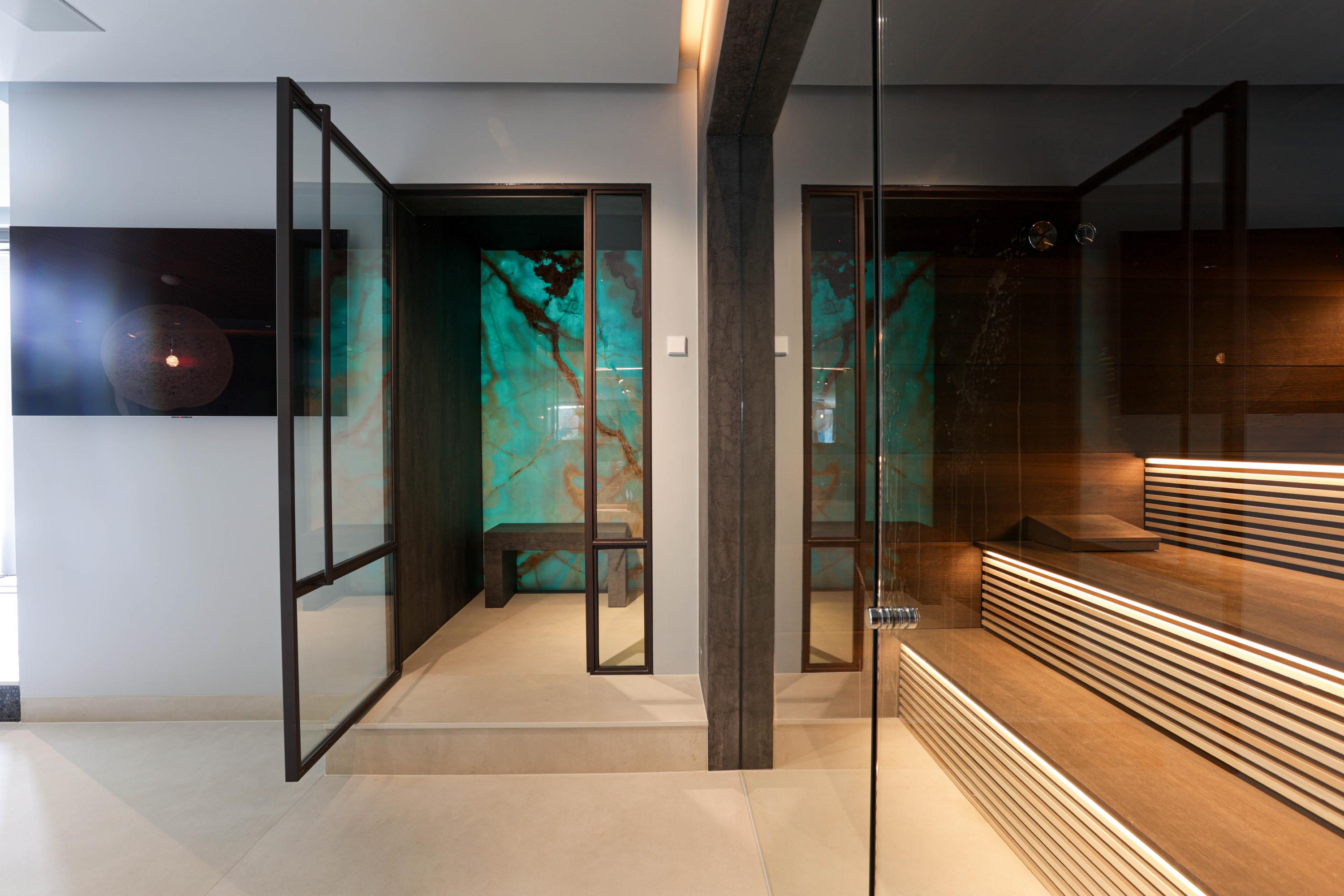Wellness is integrated at every turn, from the indoor spa with sauna, cryotherapy, hammam, Jacuzzi, and fitness room to the infinity-edge outdoor pool framed for privacy. Entertaining is effortless, with a cinema, wine cellar, and generous bar lounge forming the social heart below. A high-spec garage—equipped for several vehicles, a car lift, and pampered with its own dog shower—caters to collectors and enthusiasts alike.